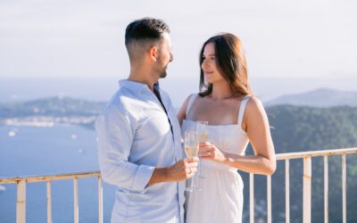 Discover this wedding proposal at the Dôme de La Chèvre d'Or in Èze, with panoramic sea views, romantic decor and couple photos in one of the most spectacular locations on the Côte d'Azur.