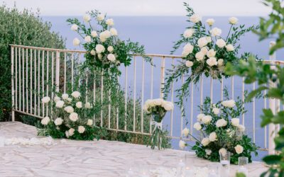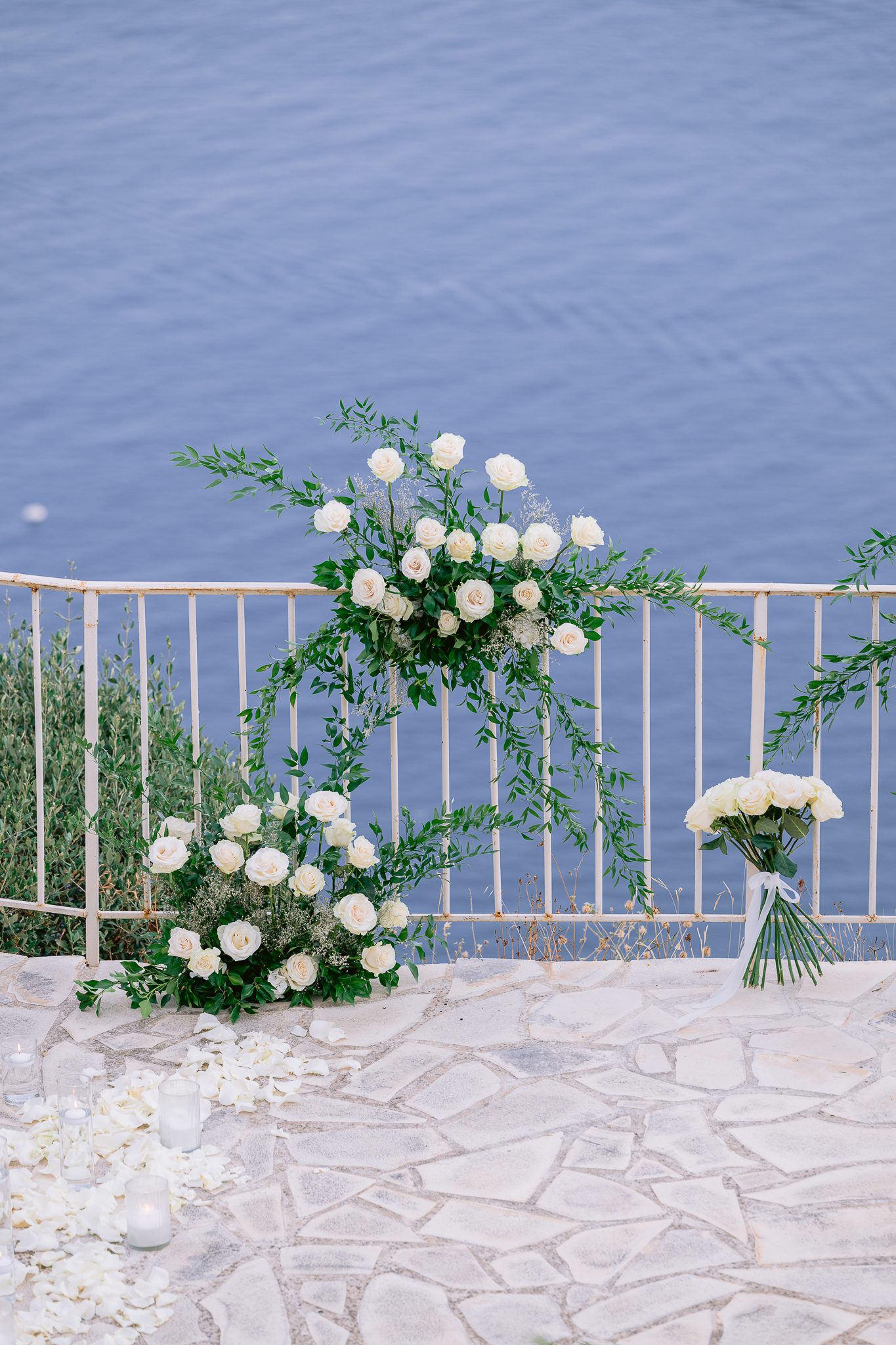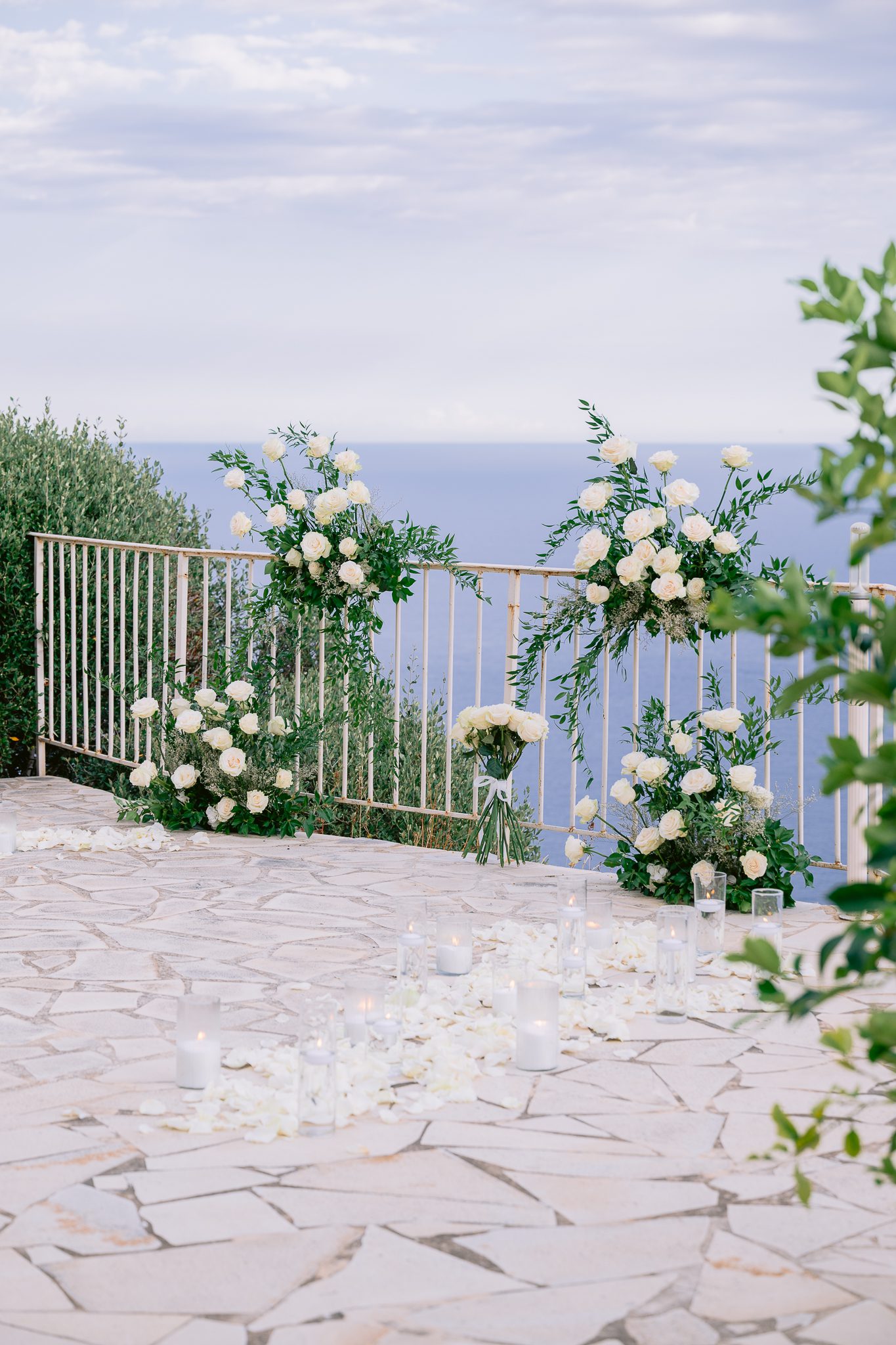 White worked perfectly here. With the pale stone of the terrace, the blue-gray of the sea, the soft light of the late day and the discreet lines of the railing, everything remained coherent. Very chic, very pure, very timeless. The flowers framed the scene just right, giving structure to the images without weighing them down.