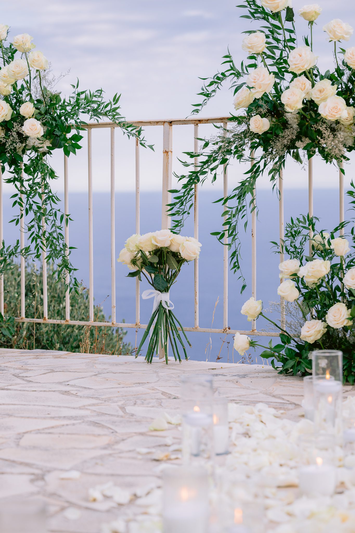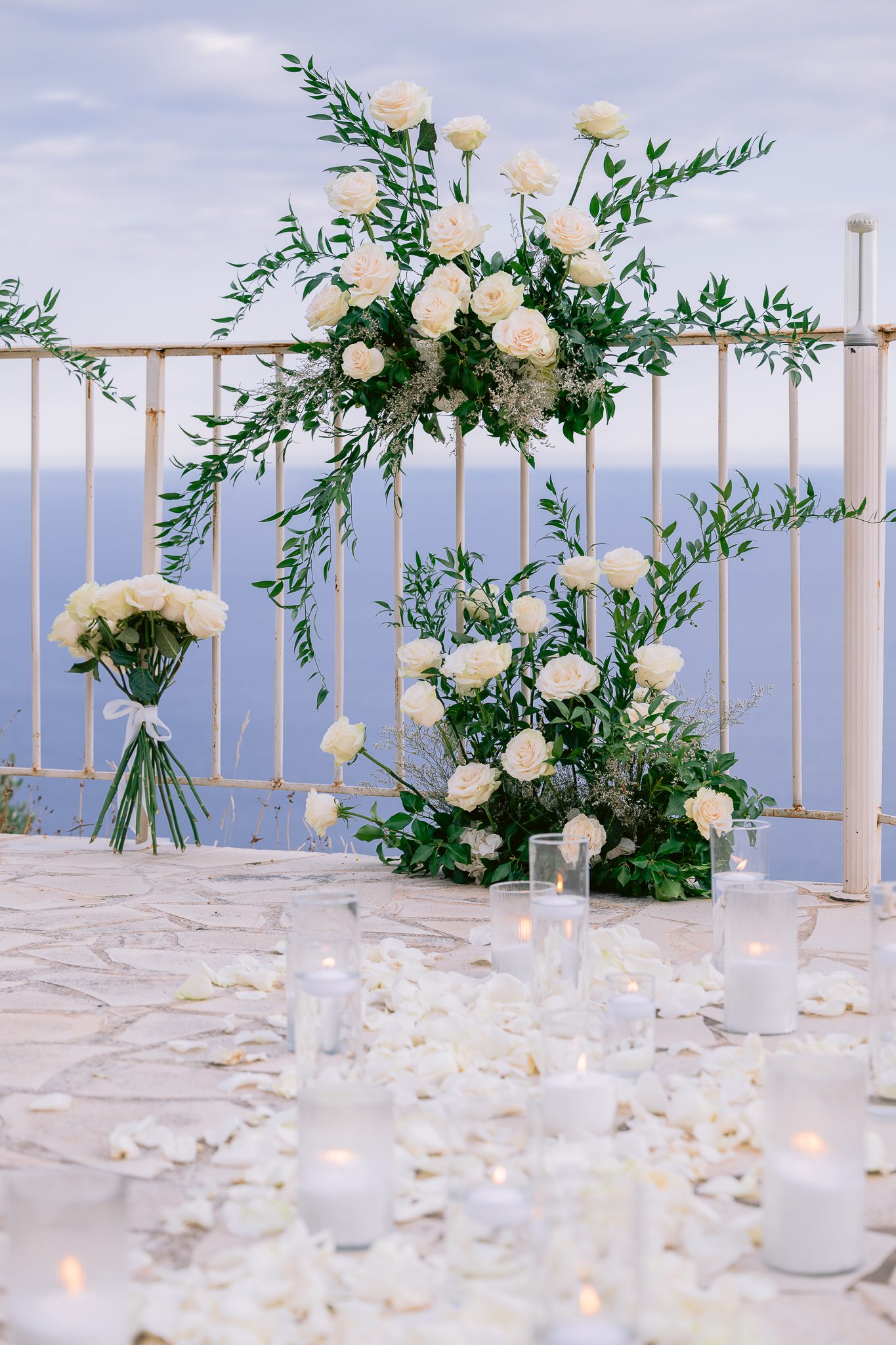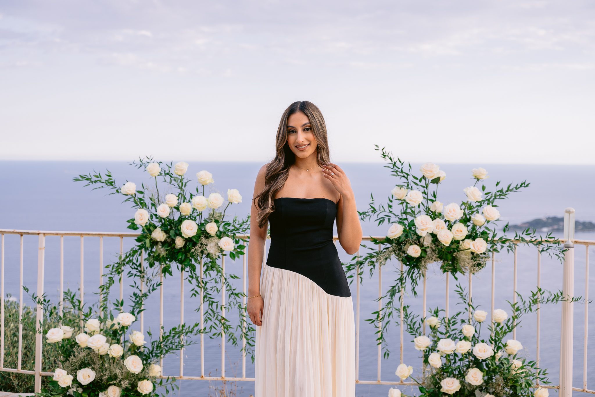 What I love about this type of proposal is that everything seems in its place. Nothing is too much, nothing is forced. The decor is strong, of course, but the emotion remains at the center. Here, the terrace provided an incredibly open setting overlooking the Mediterranean, with a panorama that immediately lifts the moment, while the floral setting and candles brought something softer, more refined, almost more hushed.