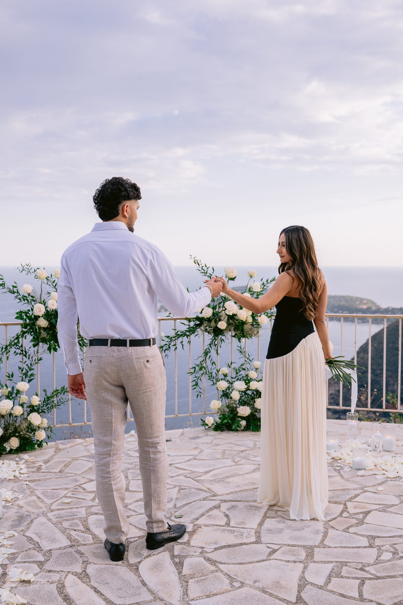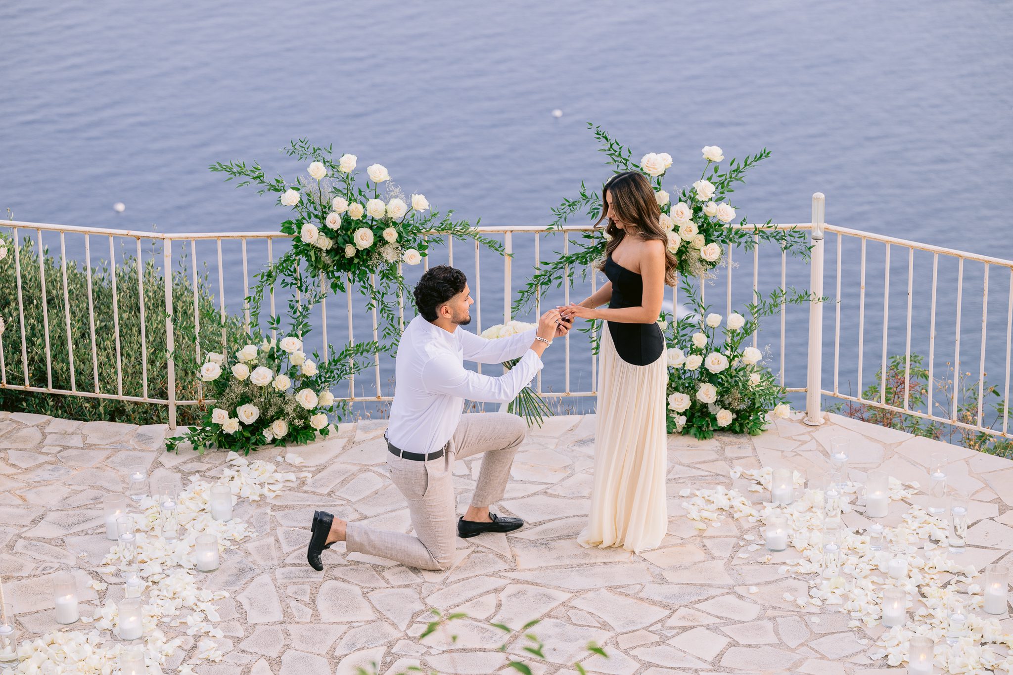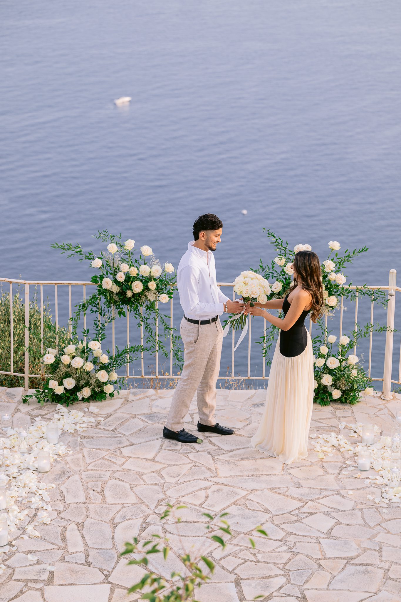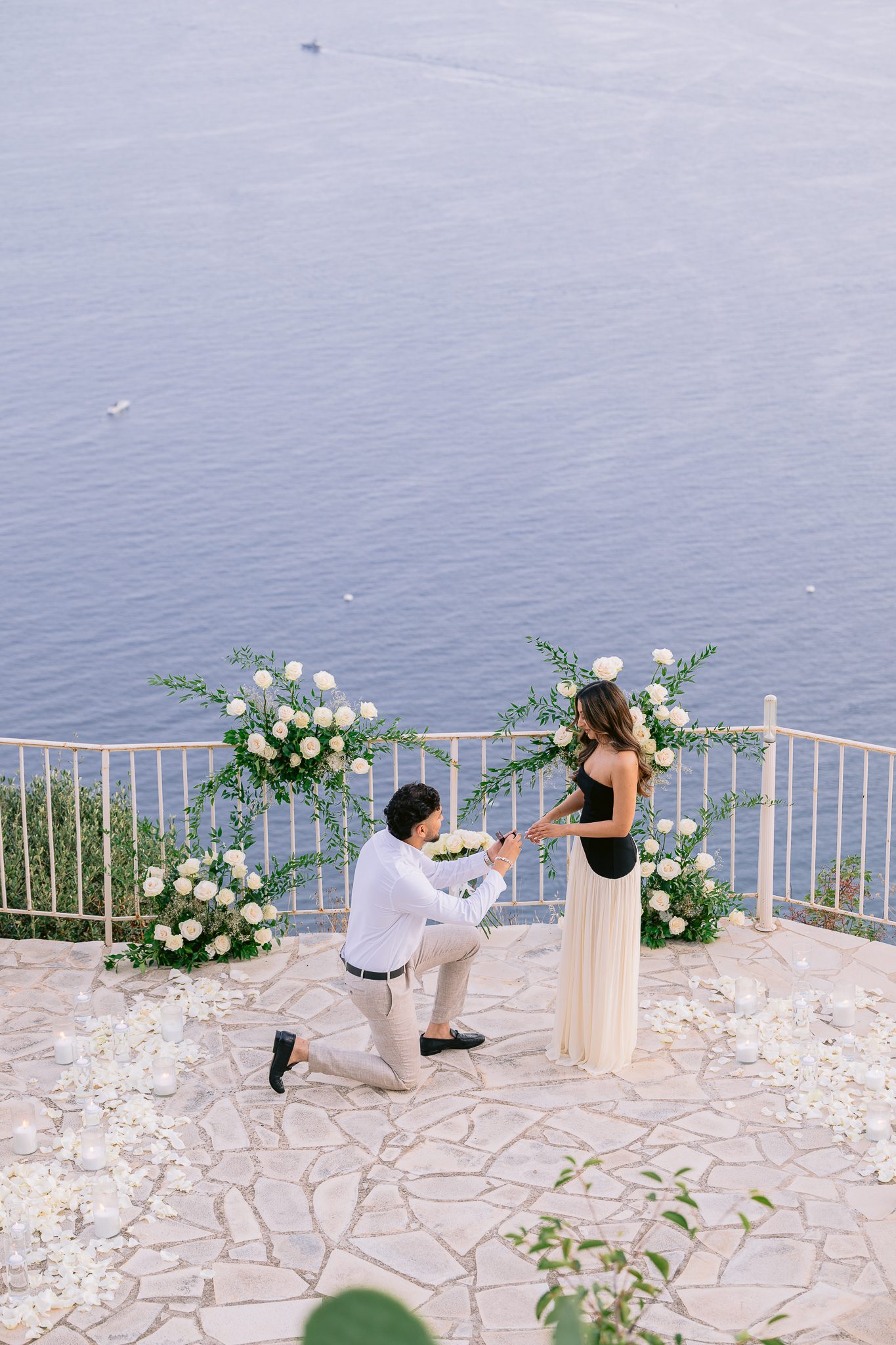 The flowers, the petals, the candles, the light on the skin, the sea behind, all create an atmosphere rich in imagery. We can tell the whole story of the proposal: the arrival on the terrace, the discovery of the setting, the exact moment when everything happens, the portraits right afterwards, and then this phase when everything becomes softer, freer, almost more tender.