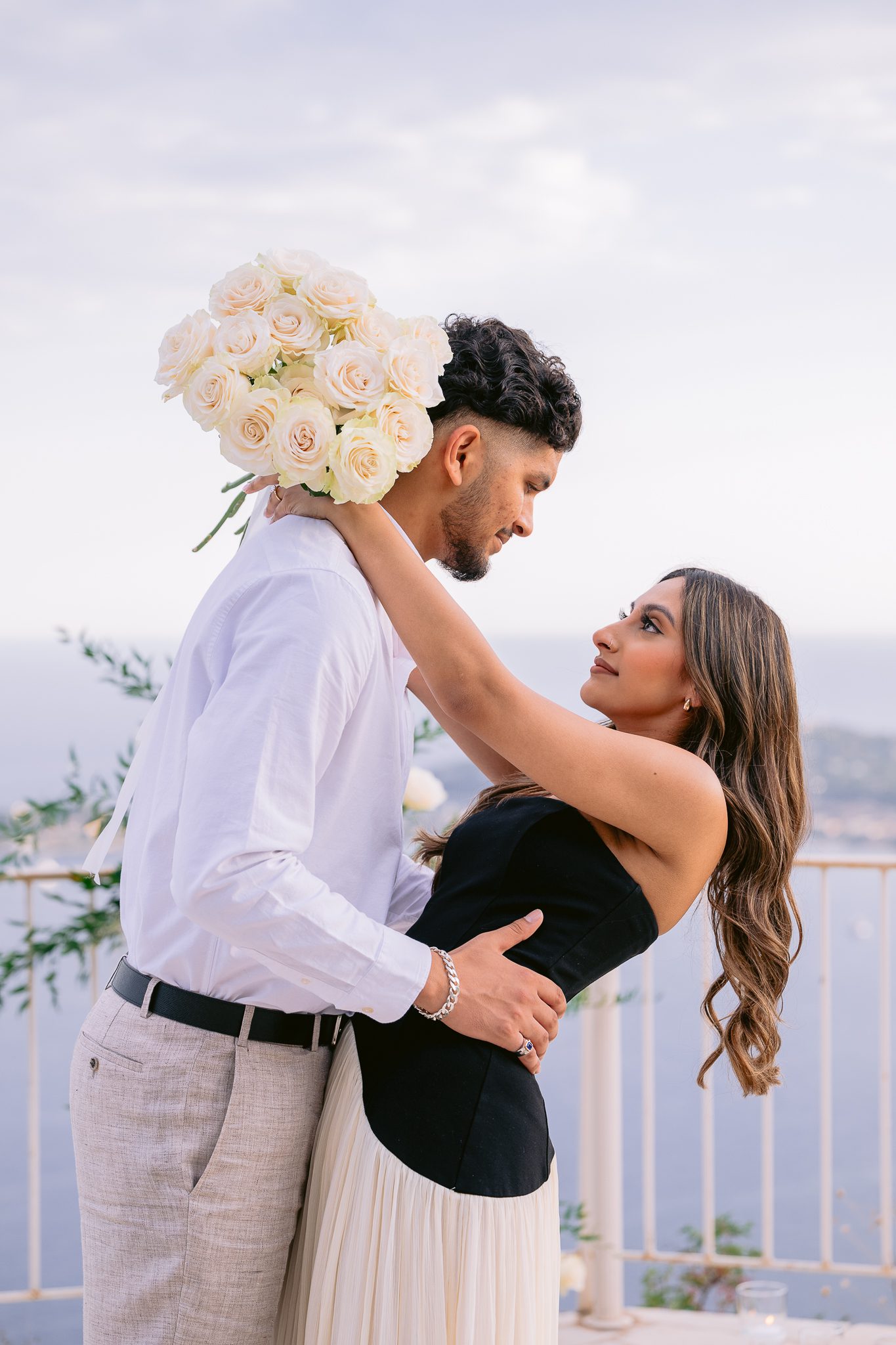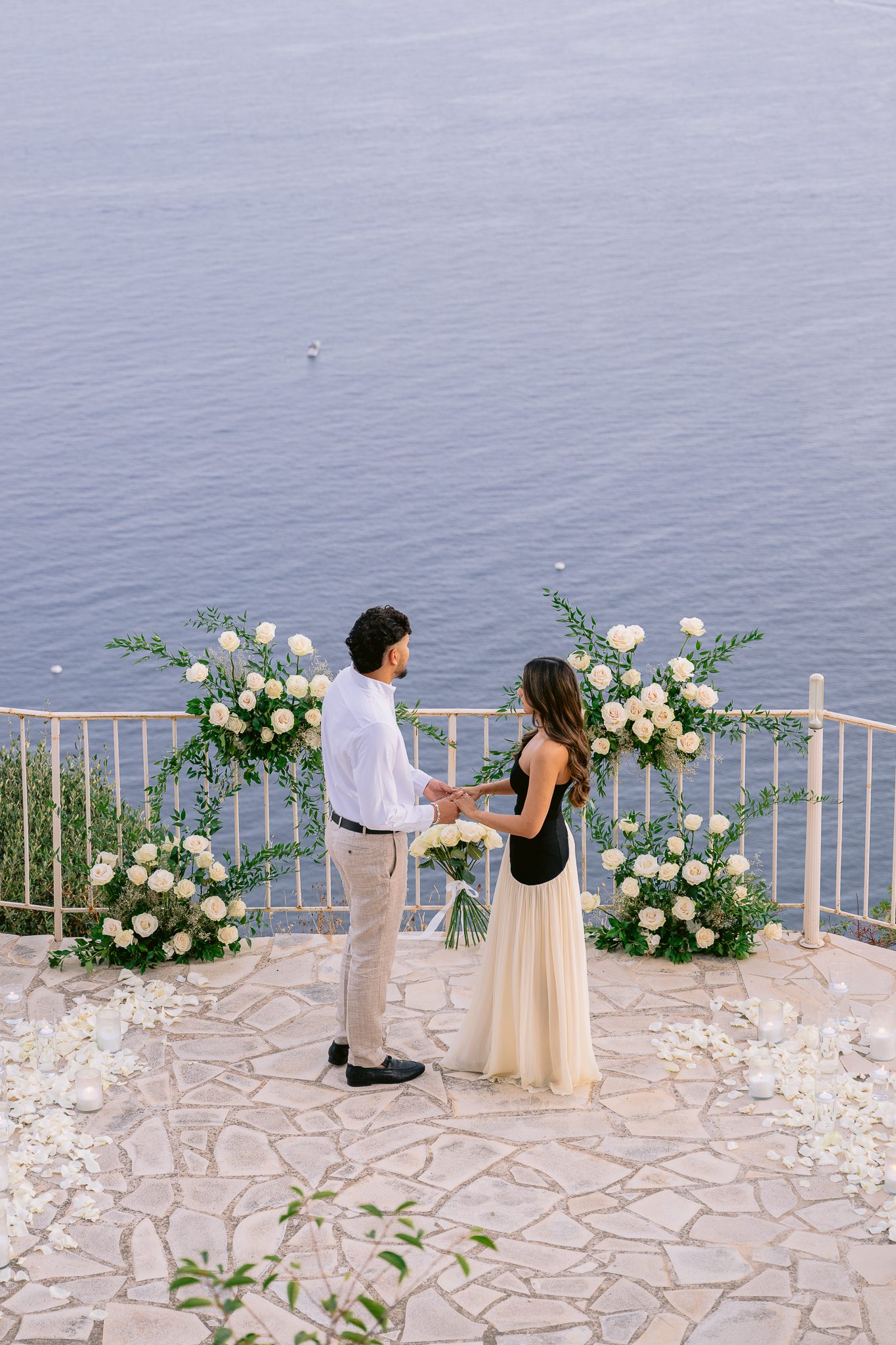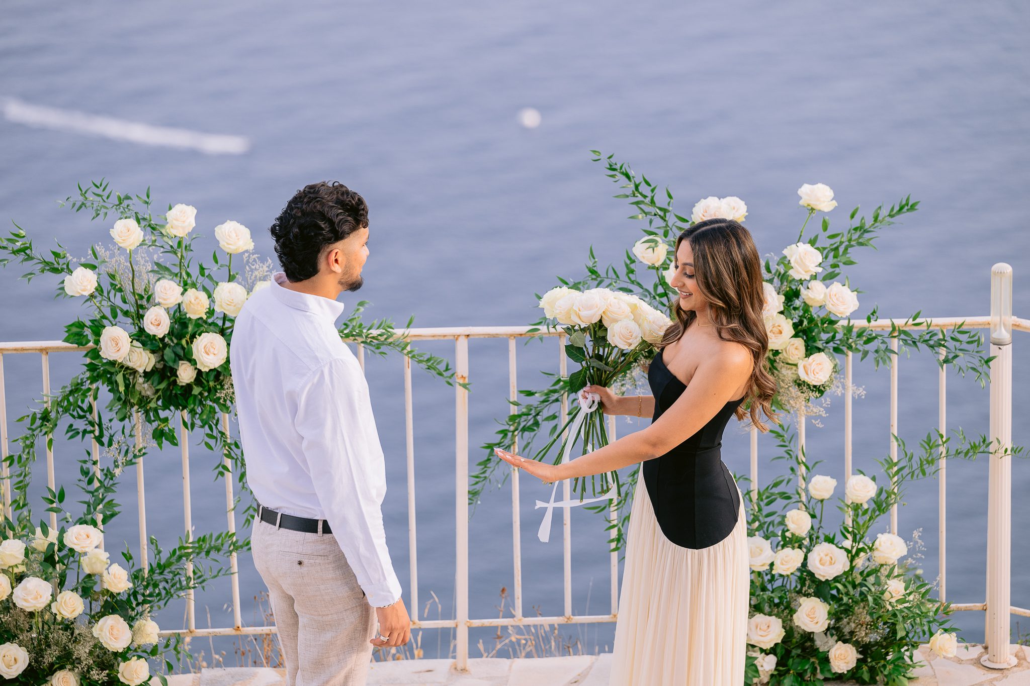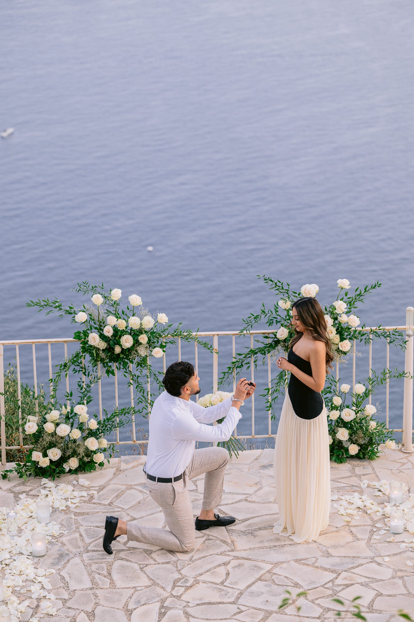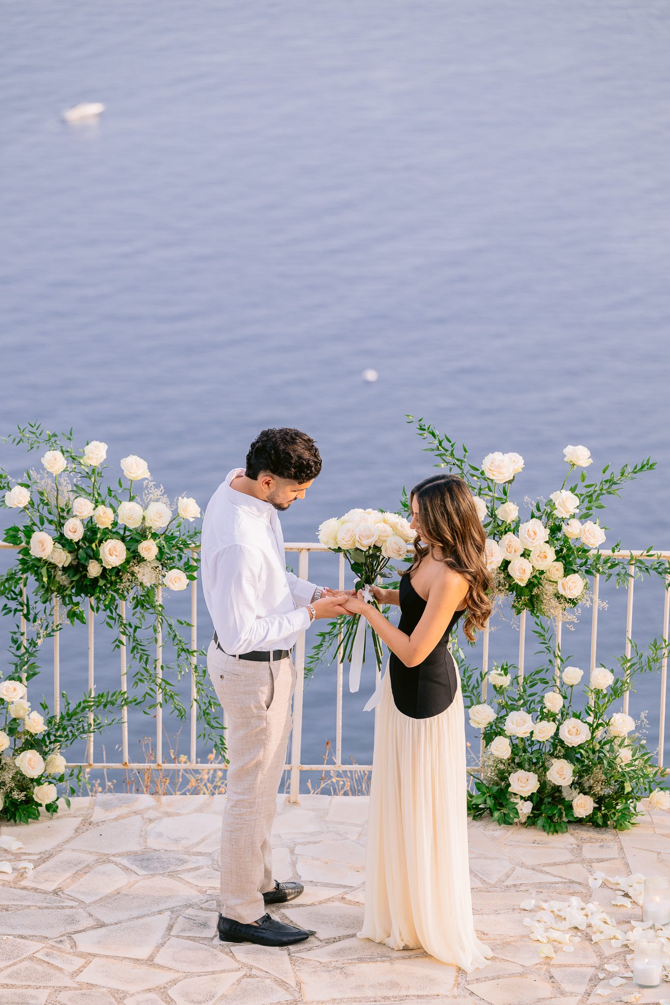 The flowers, the petals, the candles, the light on the skin, the sea behind, all create an atmosphere rich in imagery. We can tell the whole story of the proposal: the arrival on the terrace, the discovery of the setting, the exact moment when everything happens, the portraits right afterwards, and then this phase when everything becomes softer, freer, almost more tender.