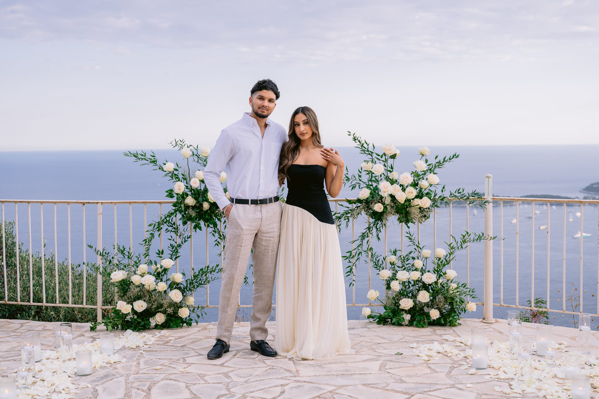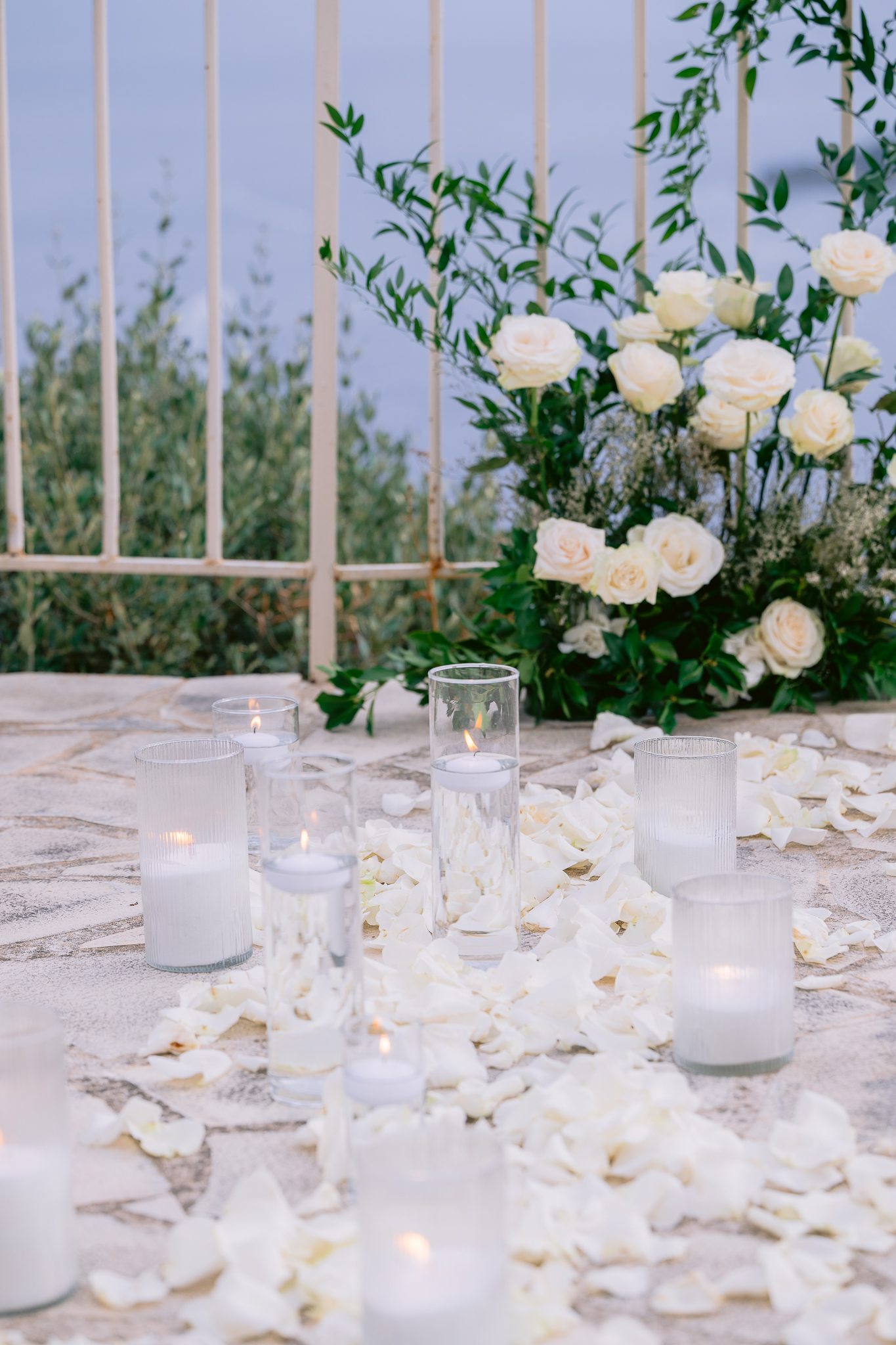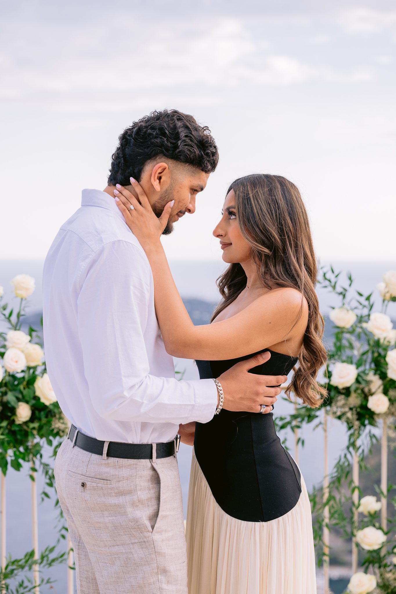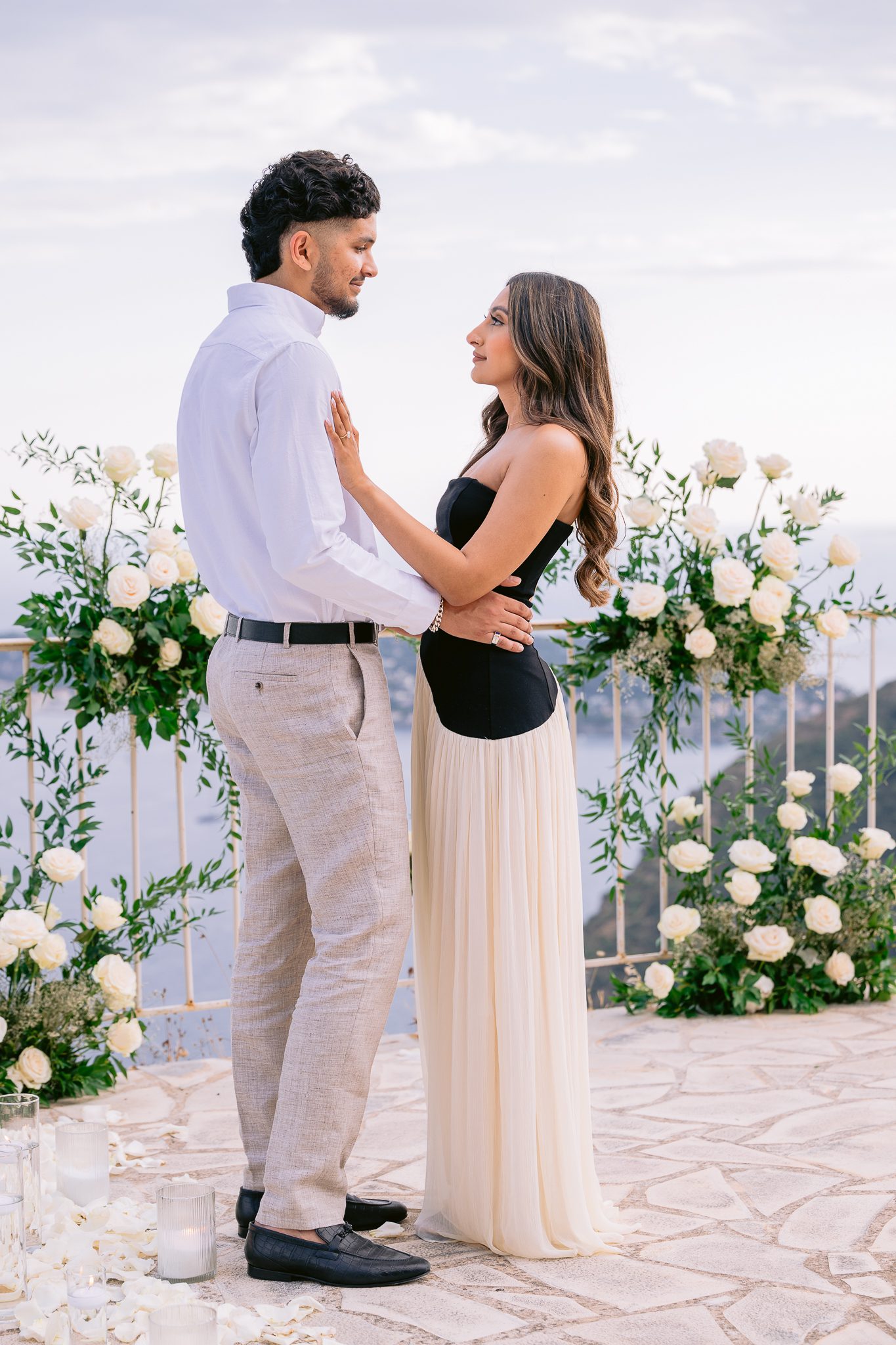 The flowers, the petals, the candles, the light on the skin, the sea behind, all create an atmosphere rich in imagery. We can tell the whole story of the proposal: the arrival on the terrace, the discovery of the setting, the exact moment when everything happens, the portraits right afterwards, and then this phase when everything becomes softer, freer, almost more tender.