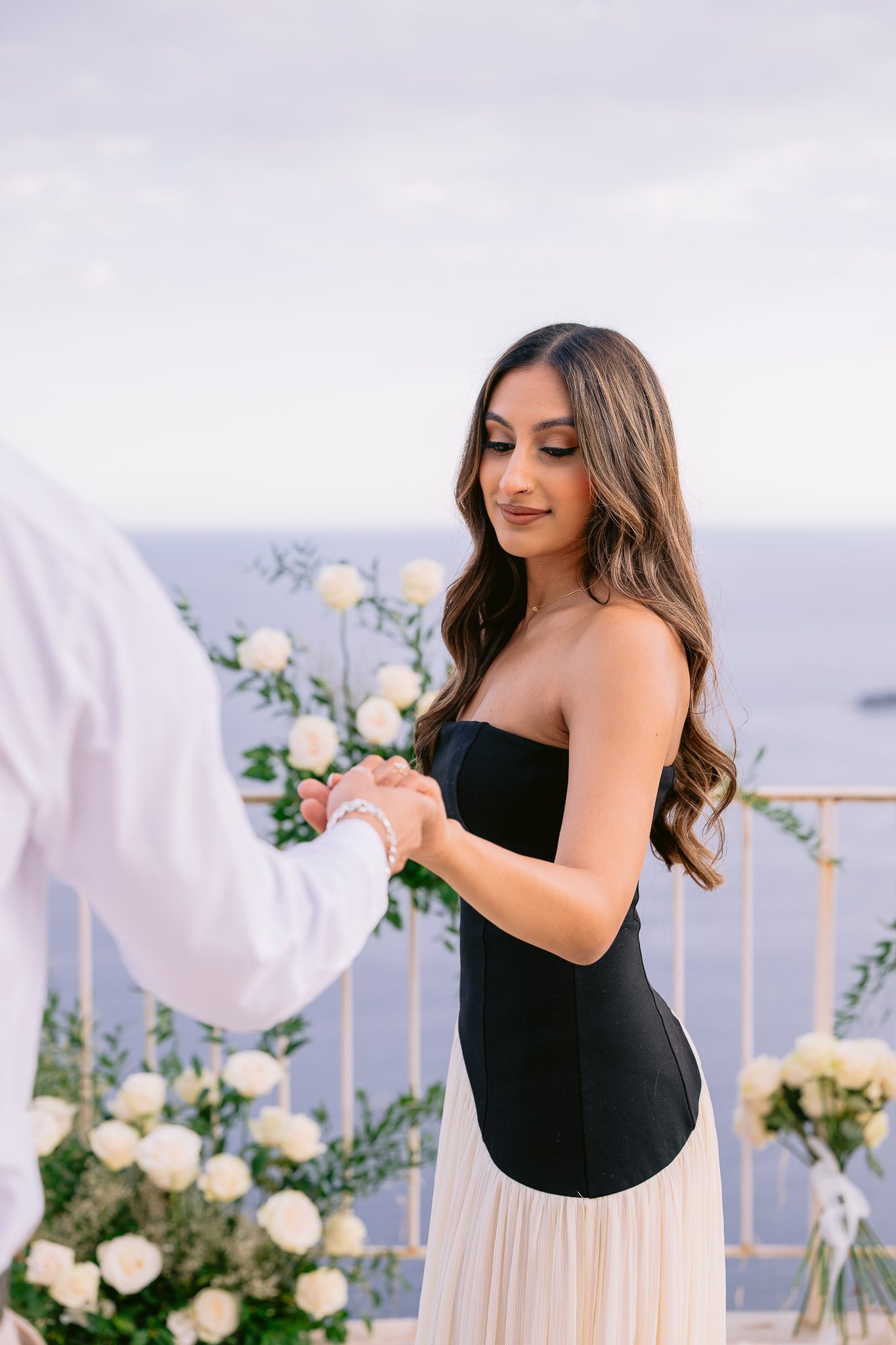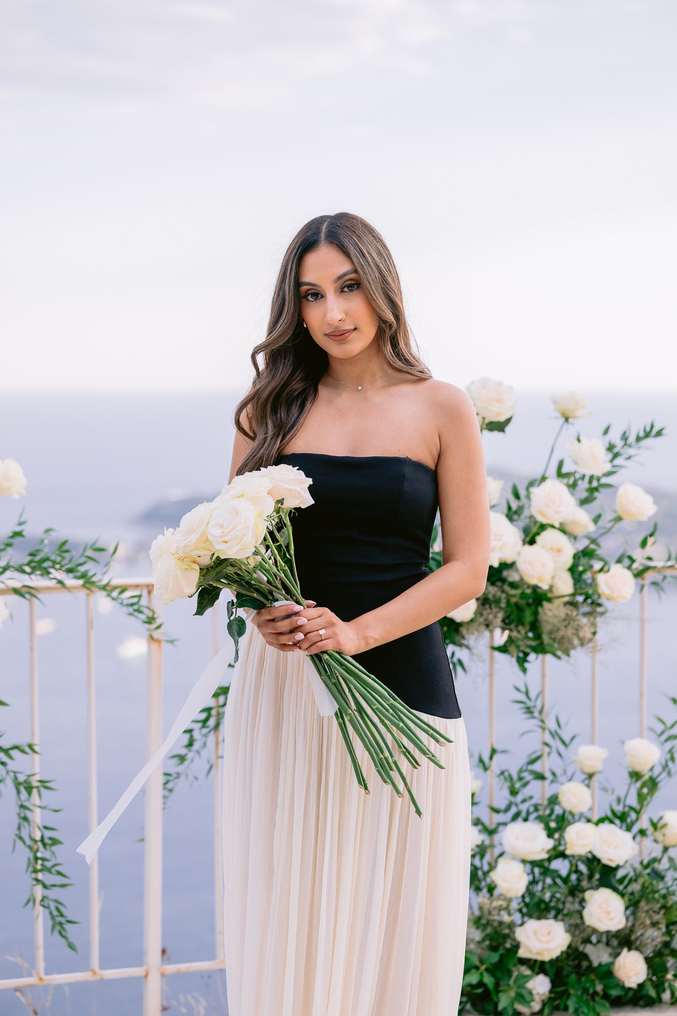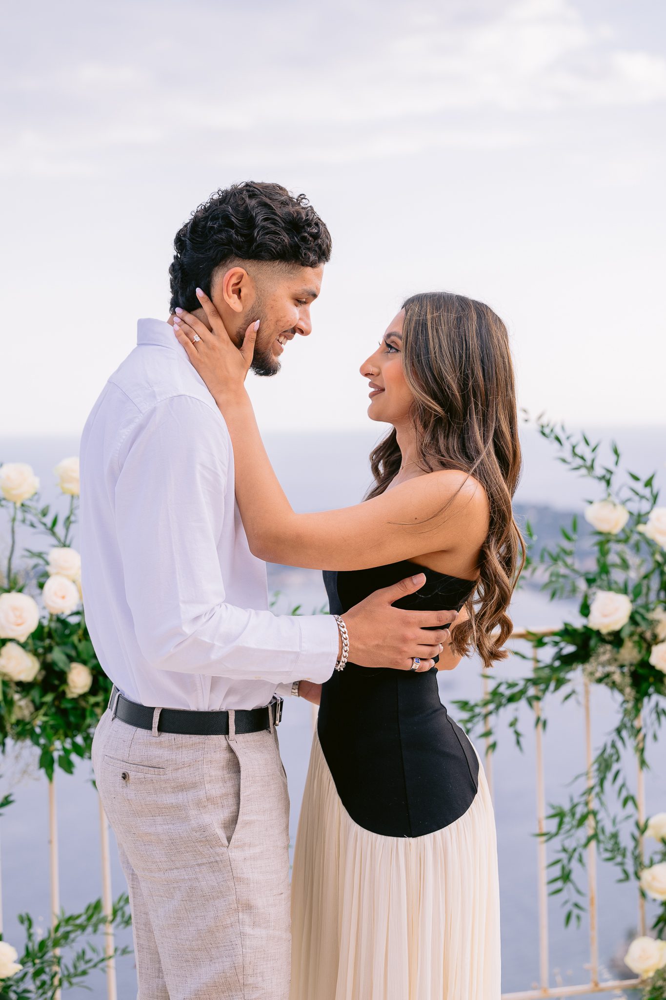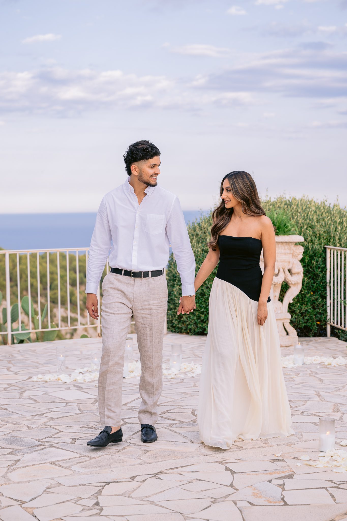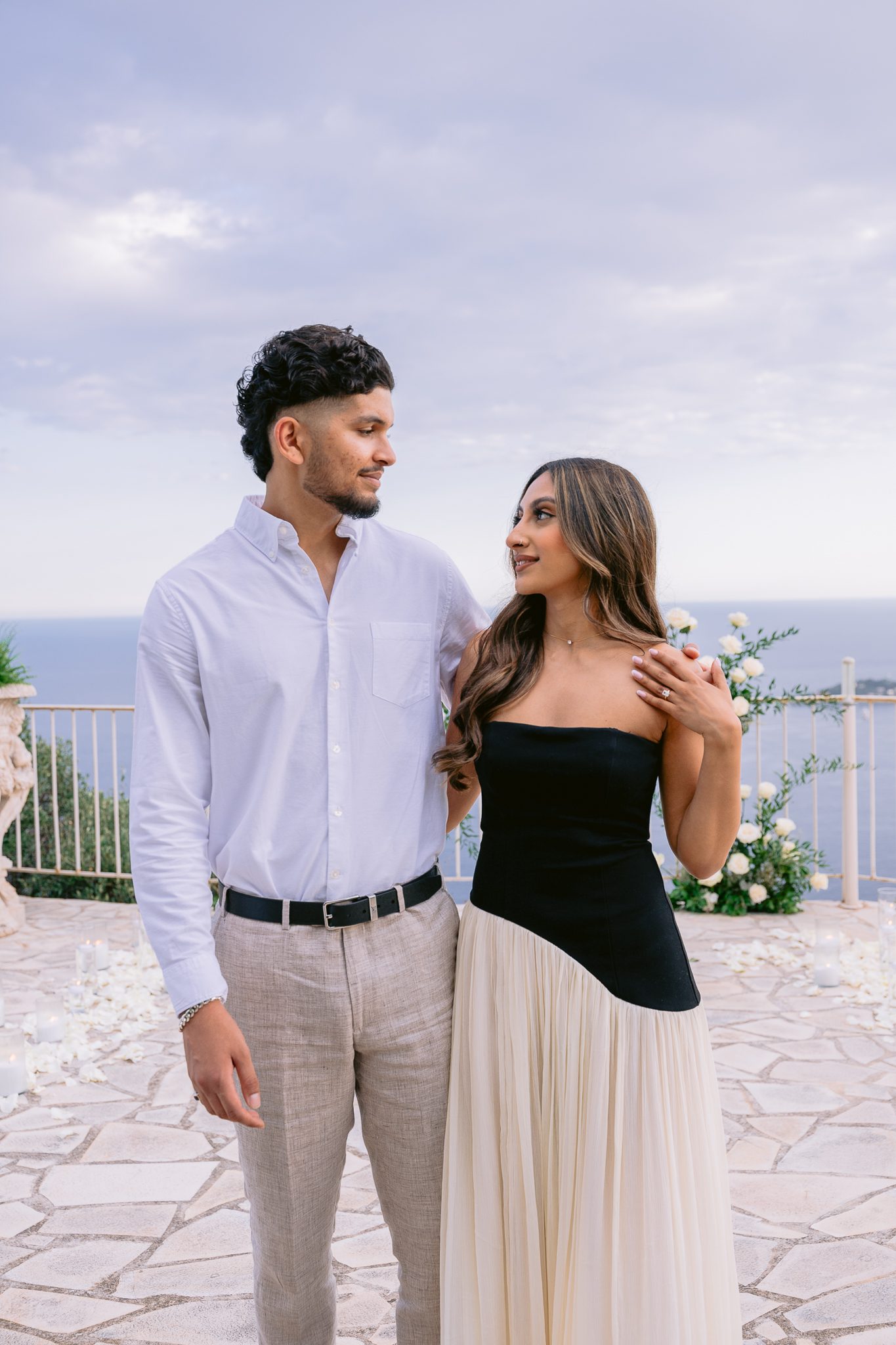 The flowers, the petals, the candles, the light on the skin, the sea behind, all create an atmosphere rich in imagery. We can tell the whole story of the proposal: the arrival on the terrace, the discovery of the setting, the exact moment when everything happens, the portraits right afterwards, and then this phase when everything becomes softer, freer, almost more tender.