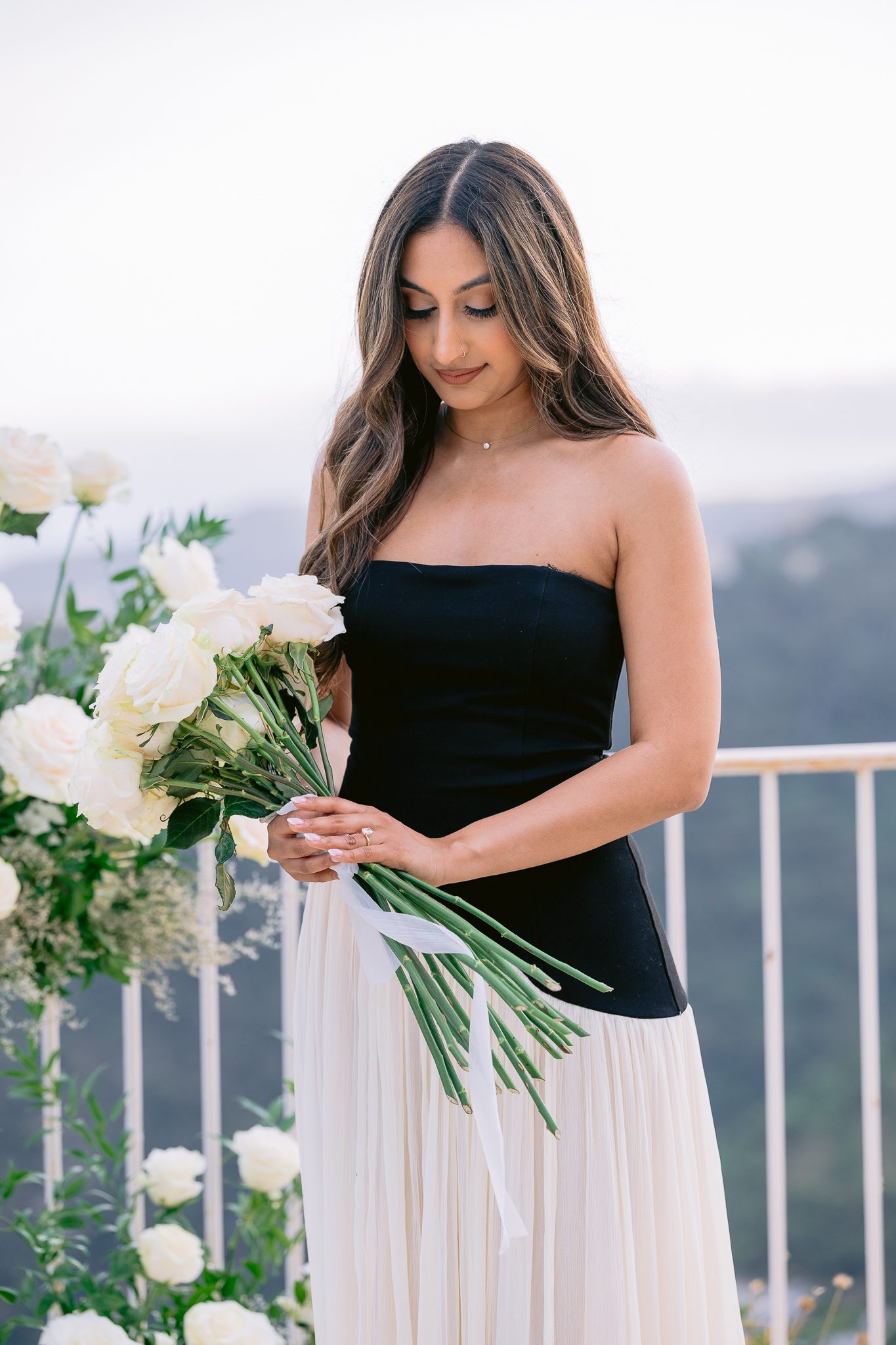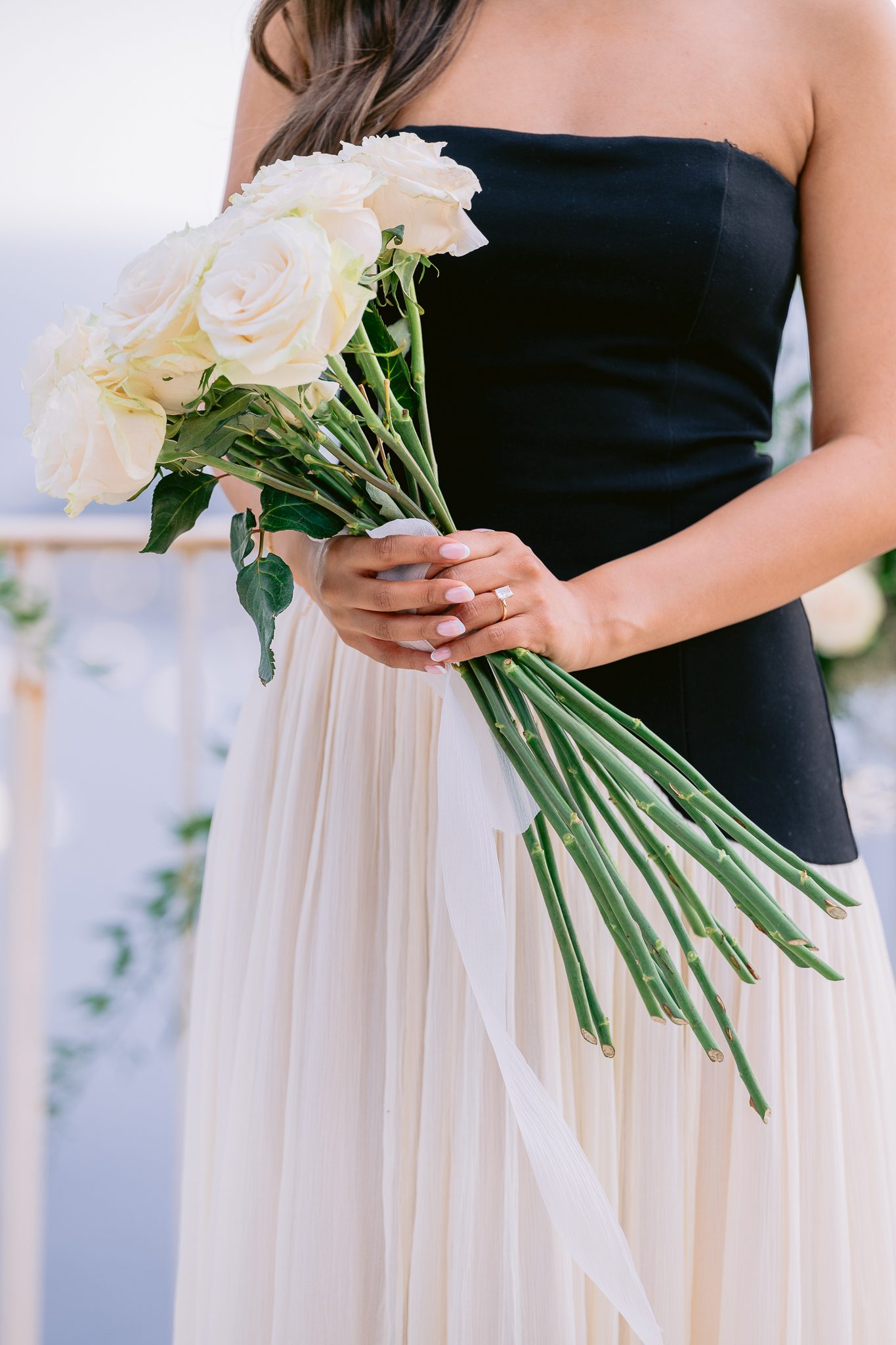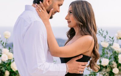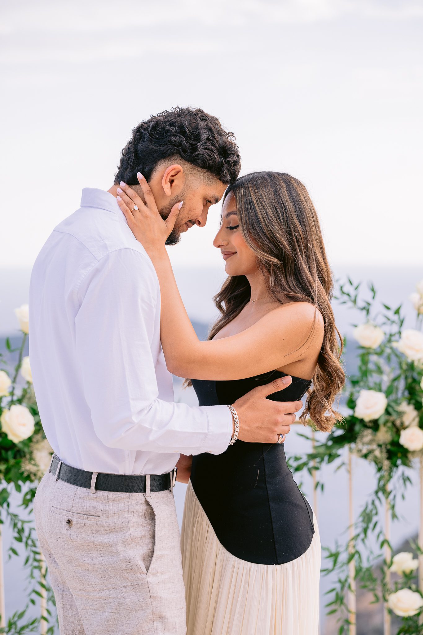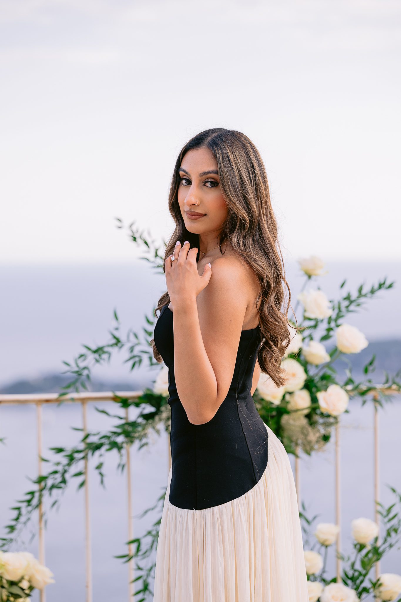 The flowers, the petals, the candles, the light on the skin, the sea behind, all create an atmosphere rich in imagery. We can tell the whole story of the proposal: the arrival on the terrace, the discovery of the setting, the exact moment when everything happens, the portraits right afterwards, and then this phase when everything becomes softer, freer, almost more tender.