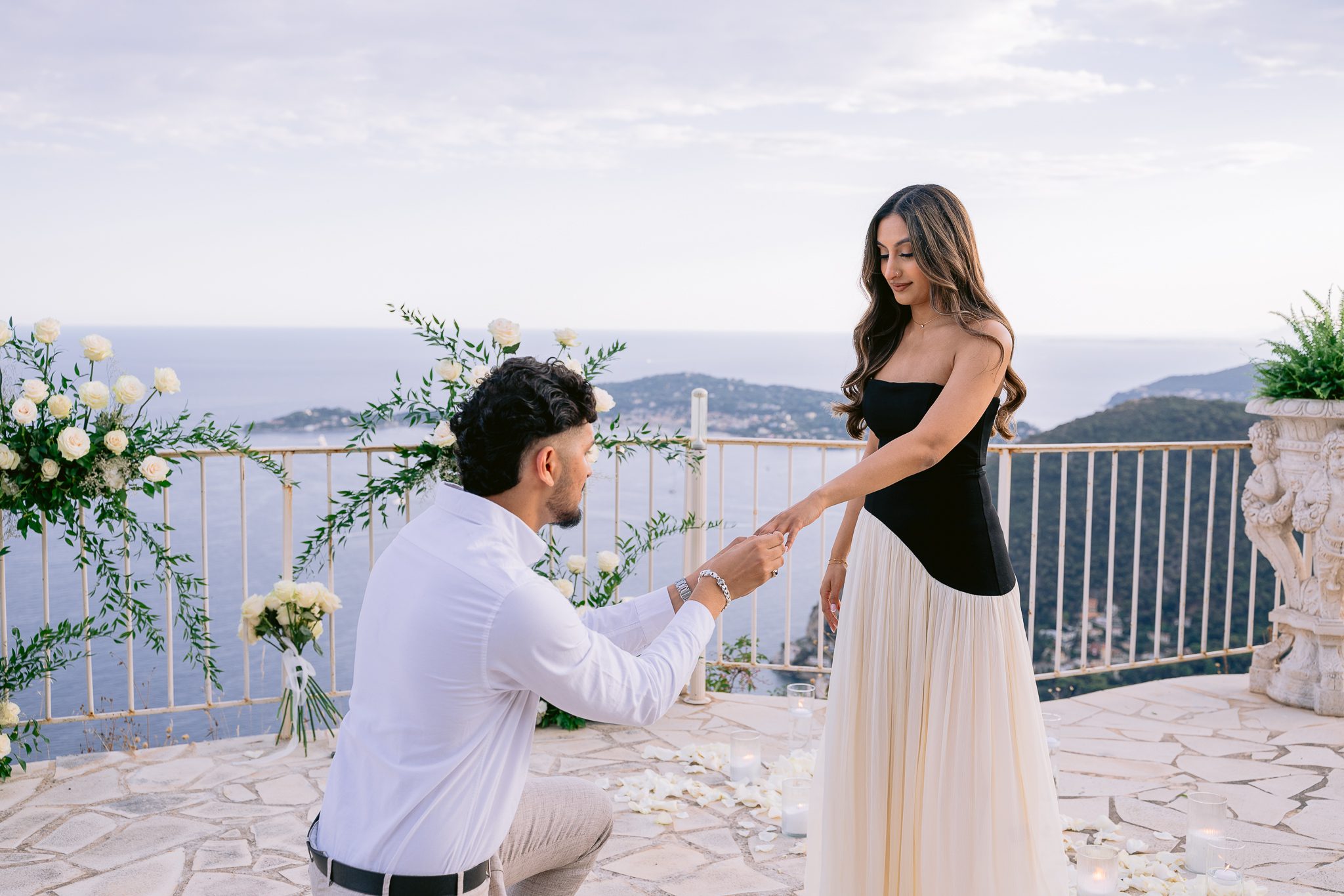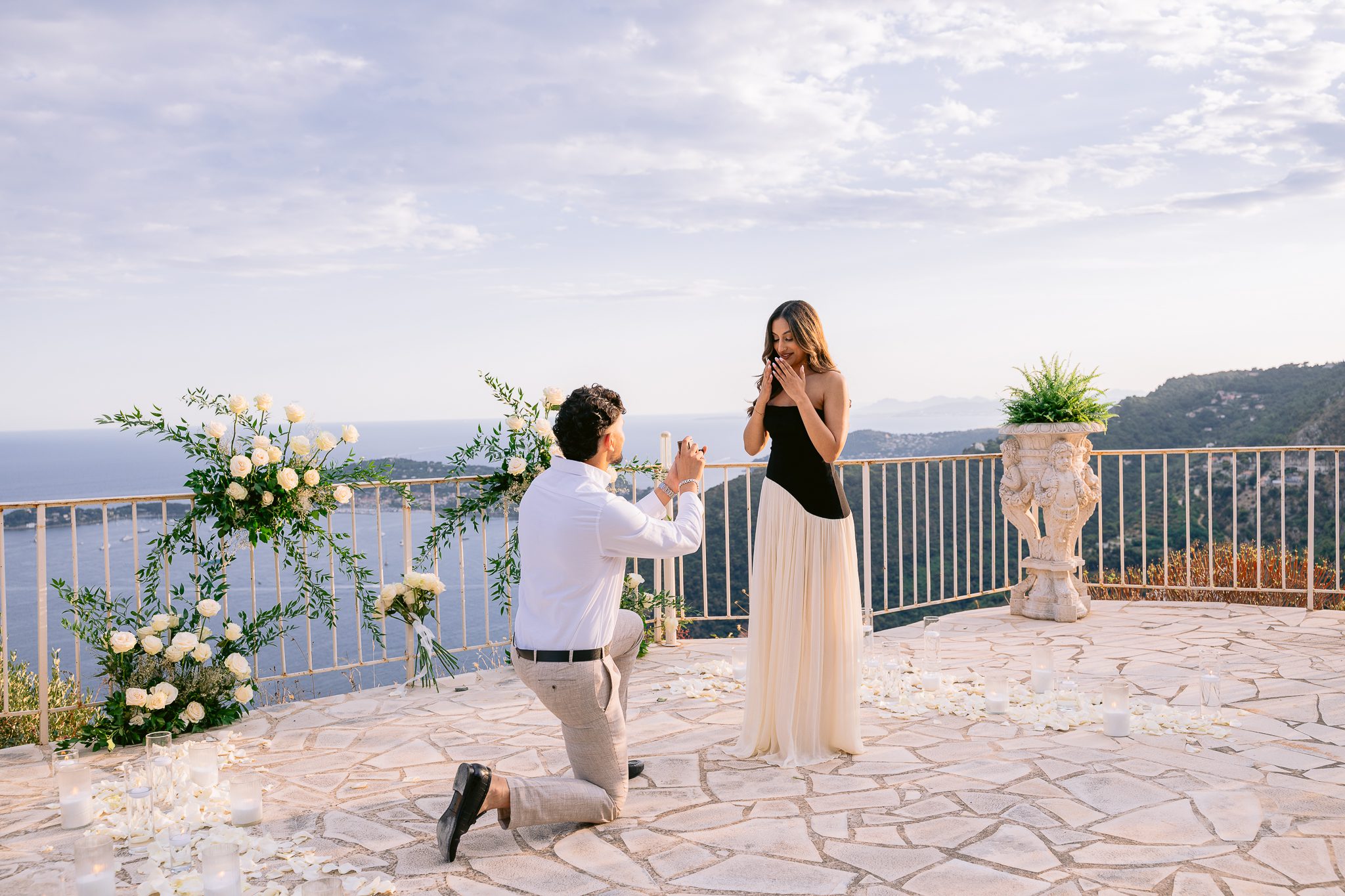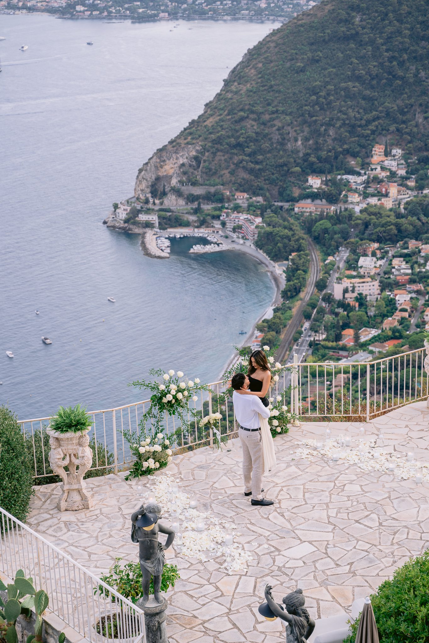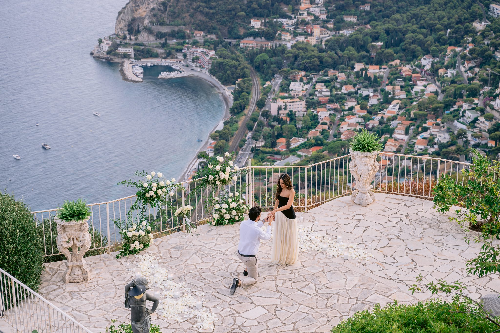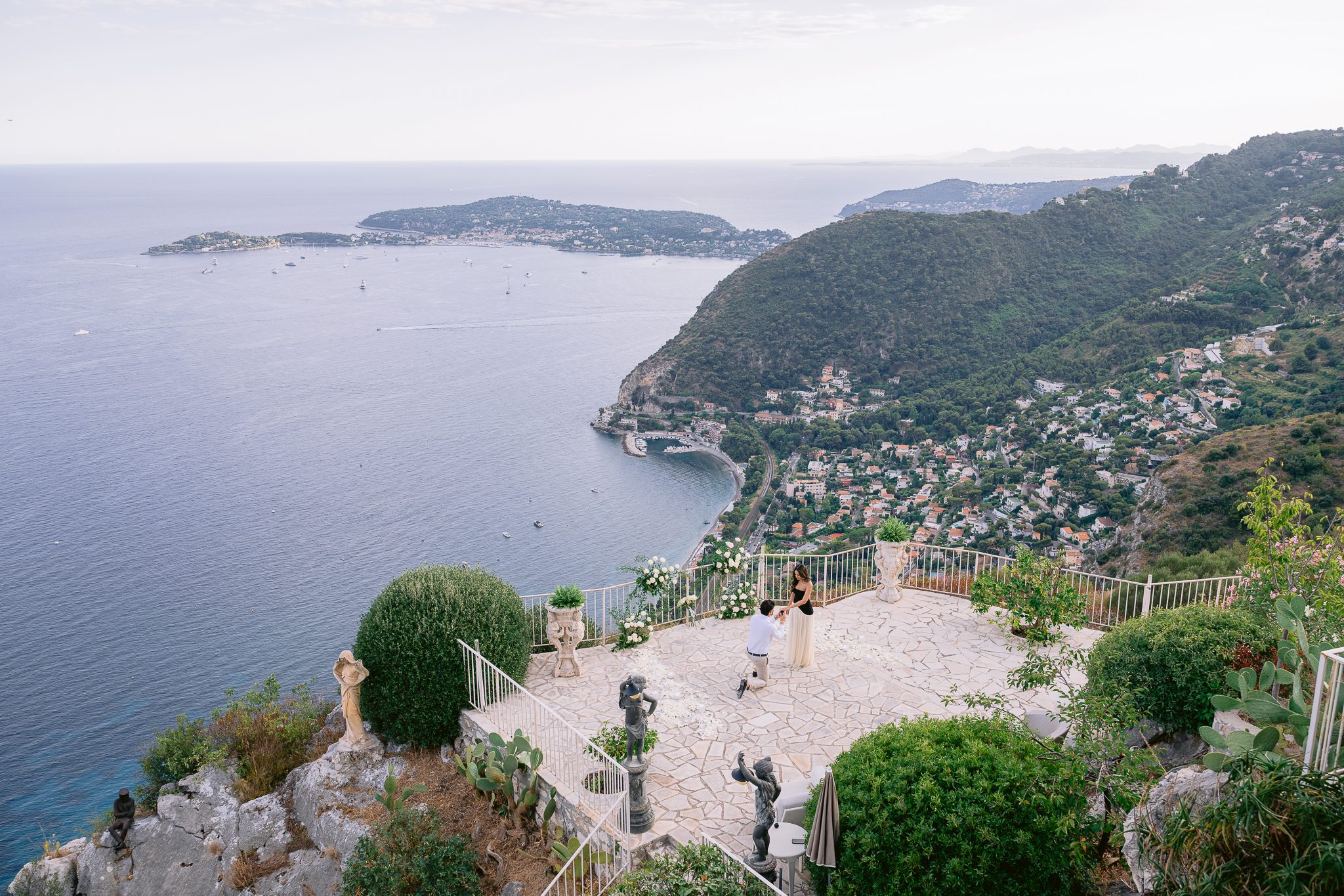 Marriage proposal at La Chèvre d'Or on the third terrace of Café du Jardin