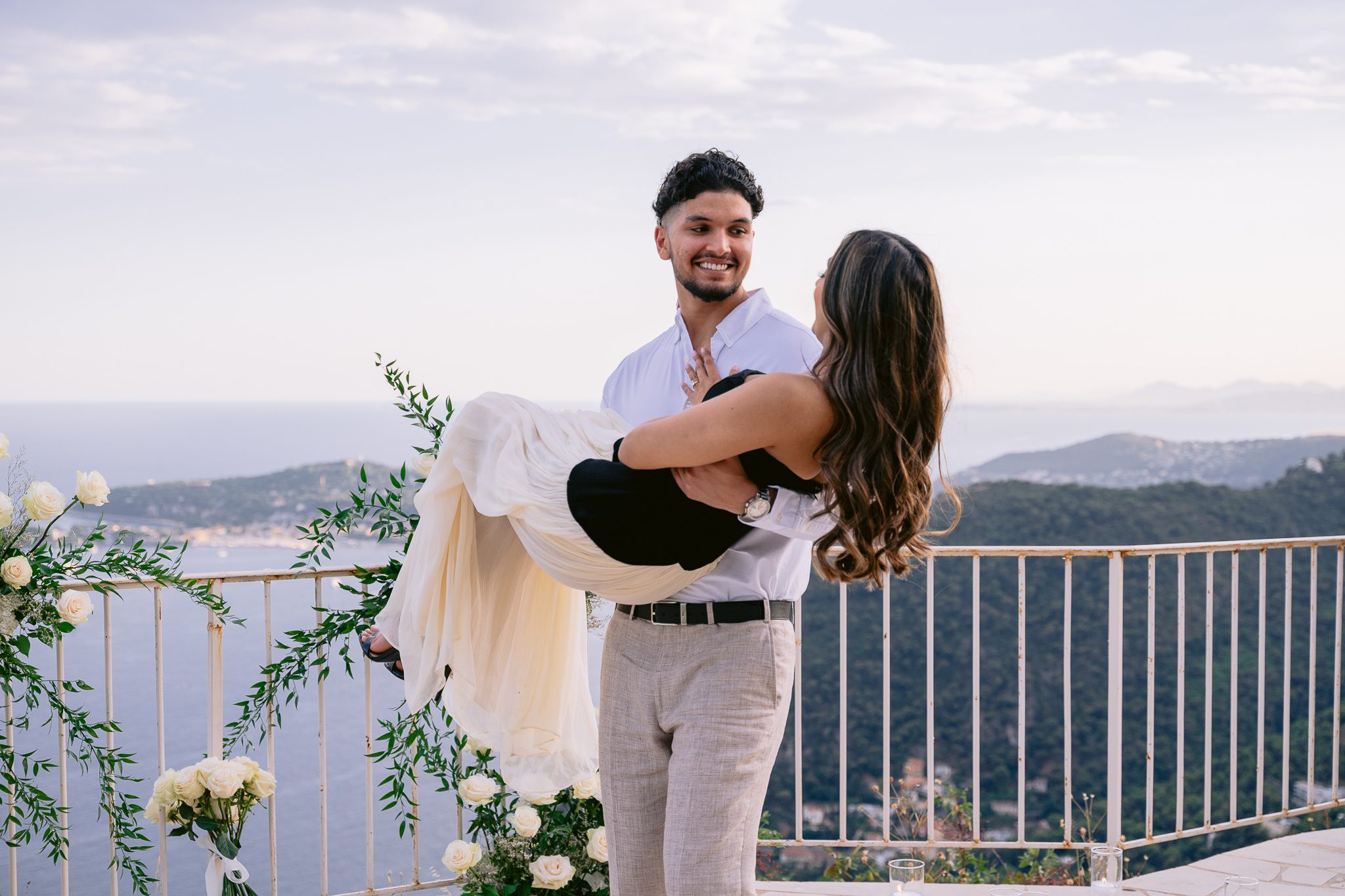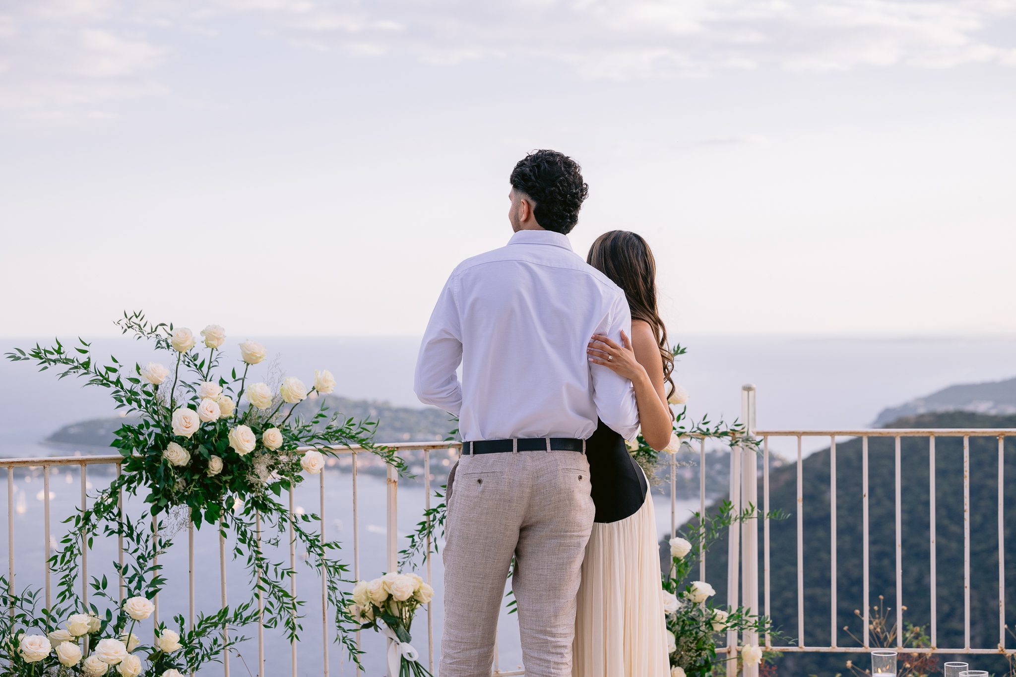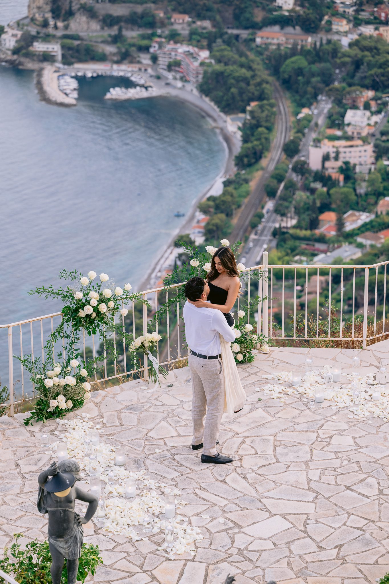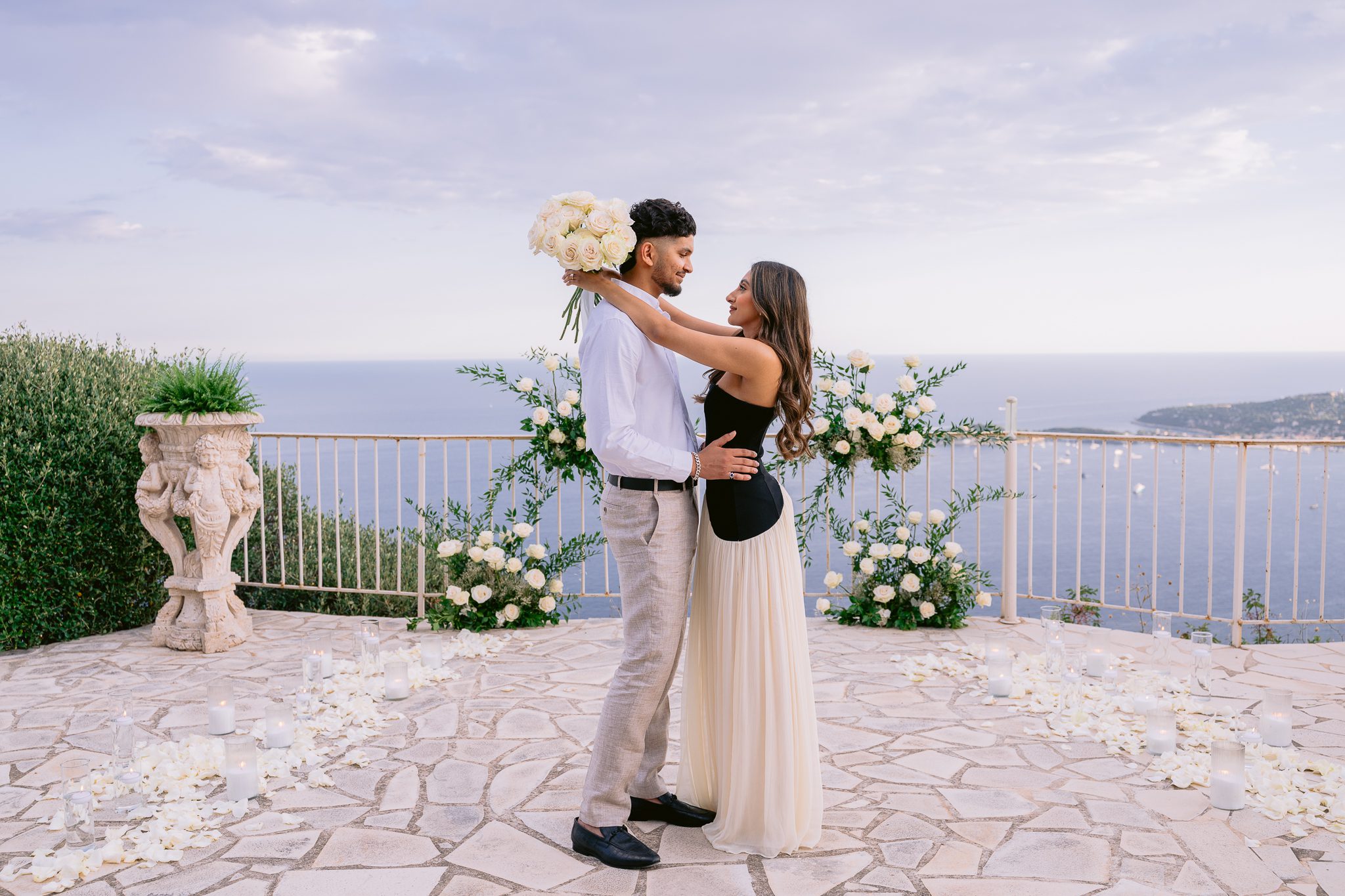 There are places that make an immediate impression, and then there are those that achieve something rarer: creating a real silence around the moment. This marriage proposal at La Chèvre d'Or, on the third terrace of the Café du Jardin, was one of those moments. A breathtaking view of the sea, a terrace suspended above the landscape, elegantly designed white floral decorations, and that very special feeling of being in a spectacular setting and yet in a totally intimate bubble.