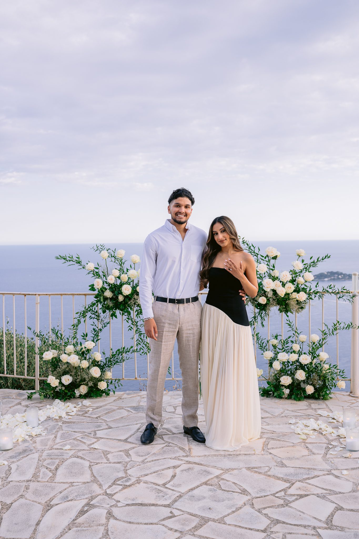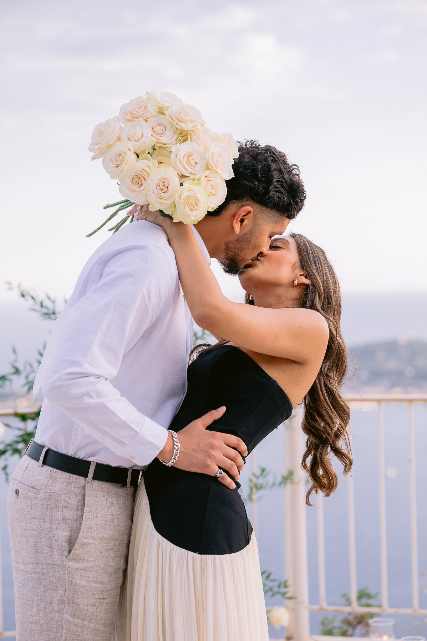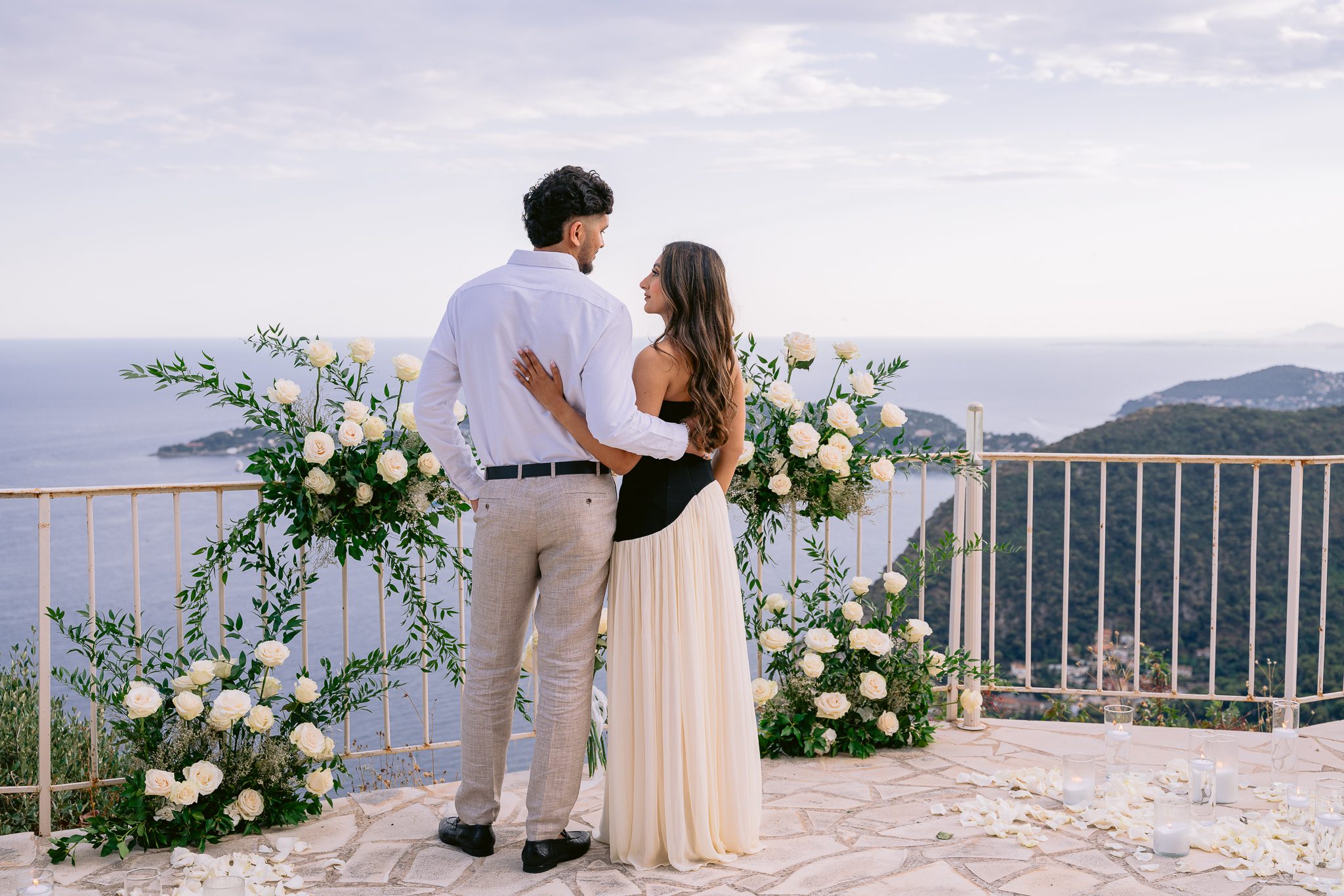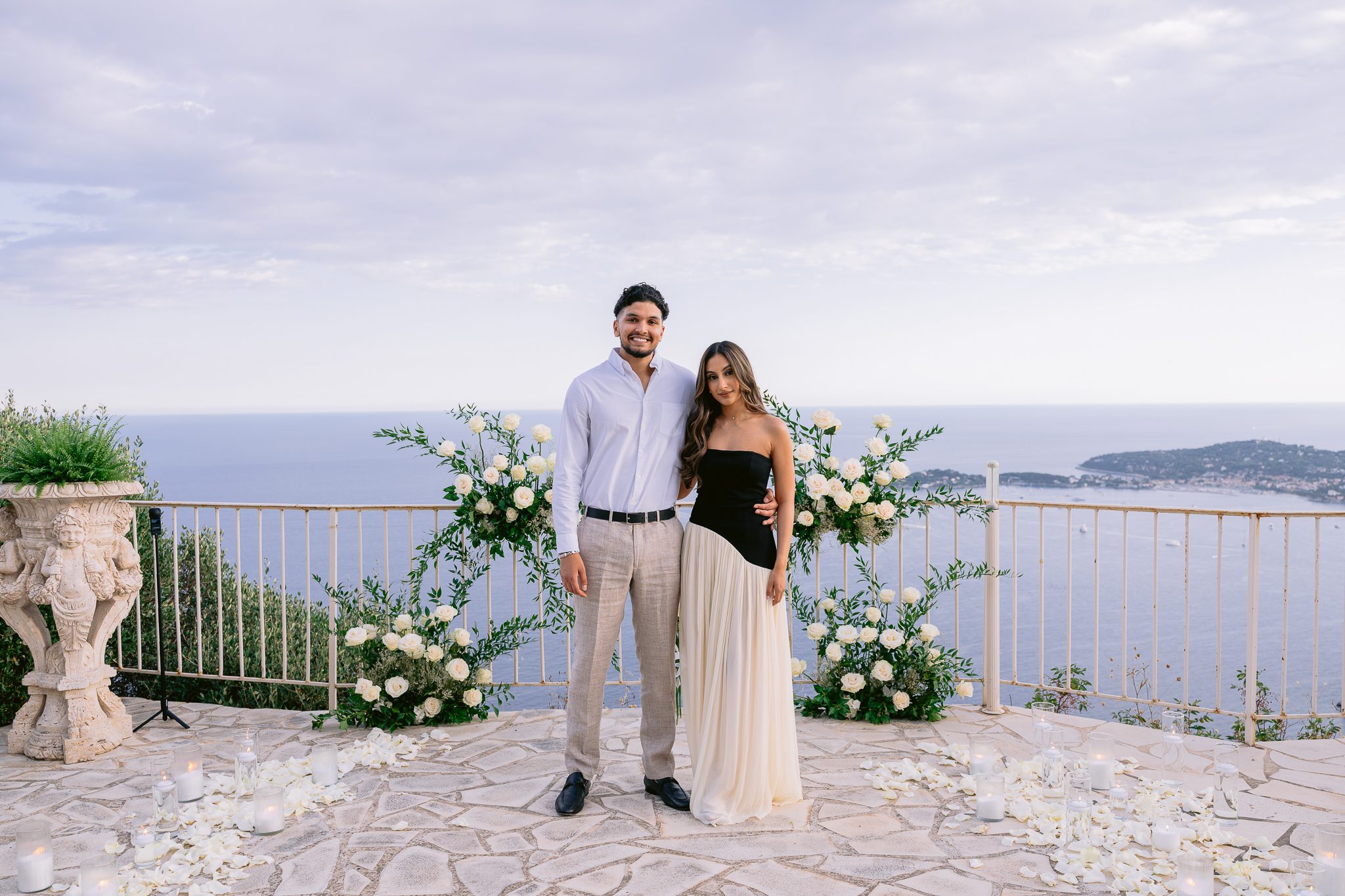 There are places that make an immediate impression, and then there are those that achieve something rarer: creating a real silence around the moment. This marriage proposal at La Chèvre d'Or, on the third terrace of the Café du Jardin, was one of those moments. A breathtaking view of the sea, a terrace suspended above the landscape, elegantly designed white floral decorations, and that very special feeling of being in a spectacular setting and yet in a totally intimate bubble.