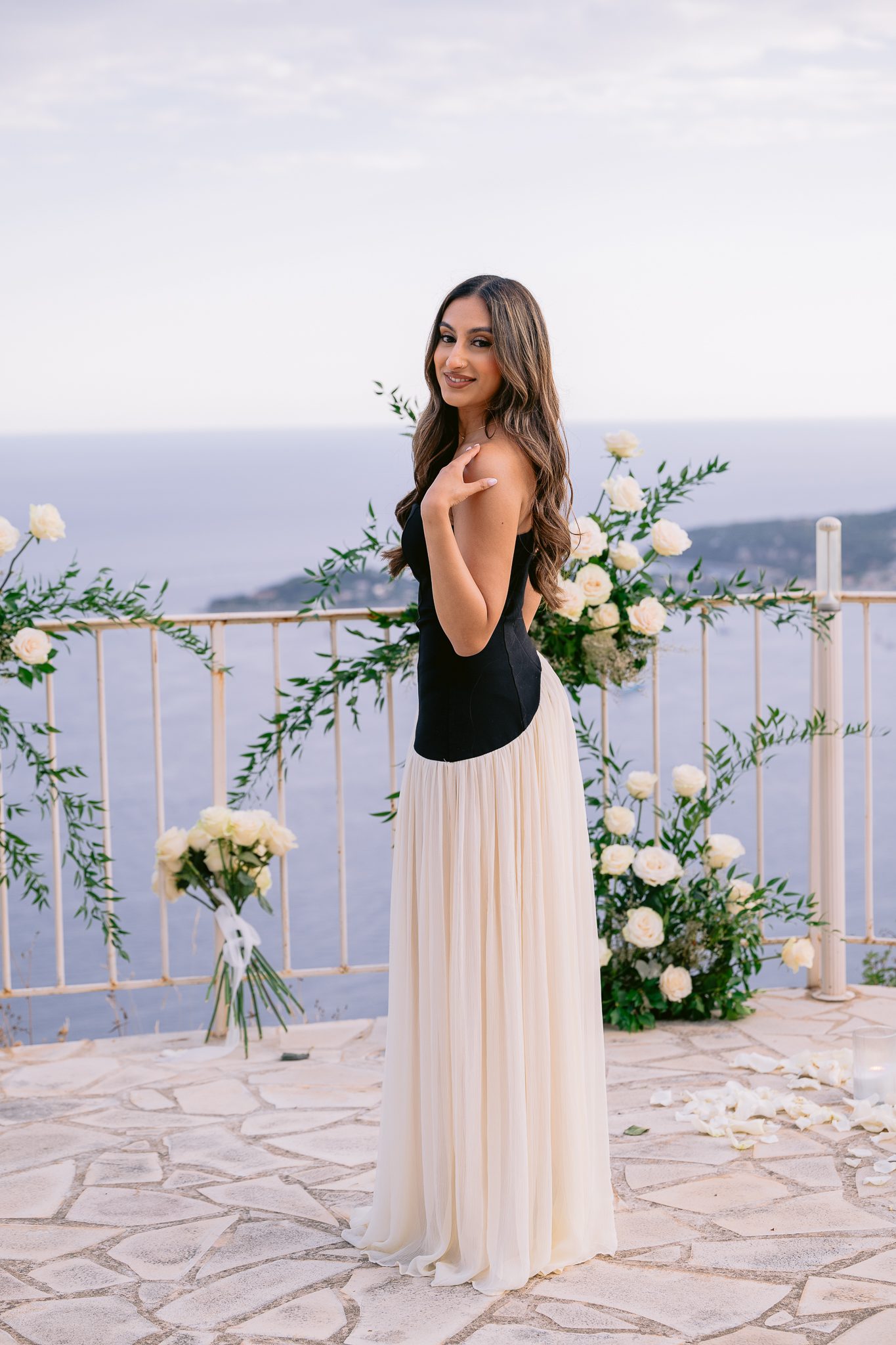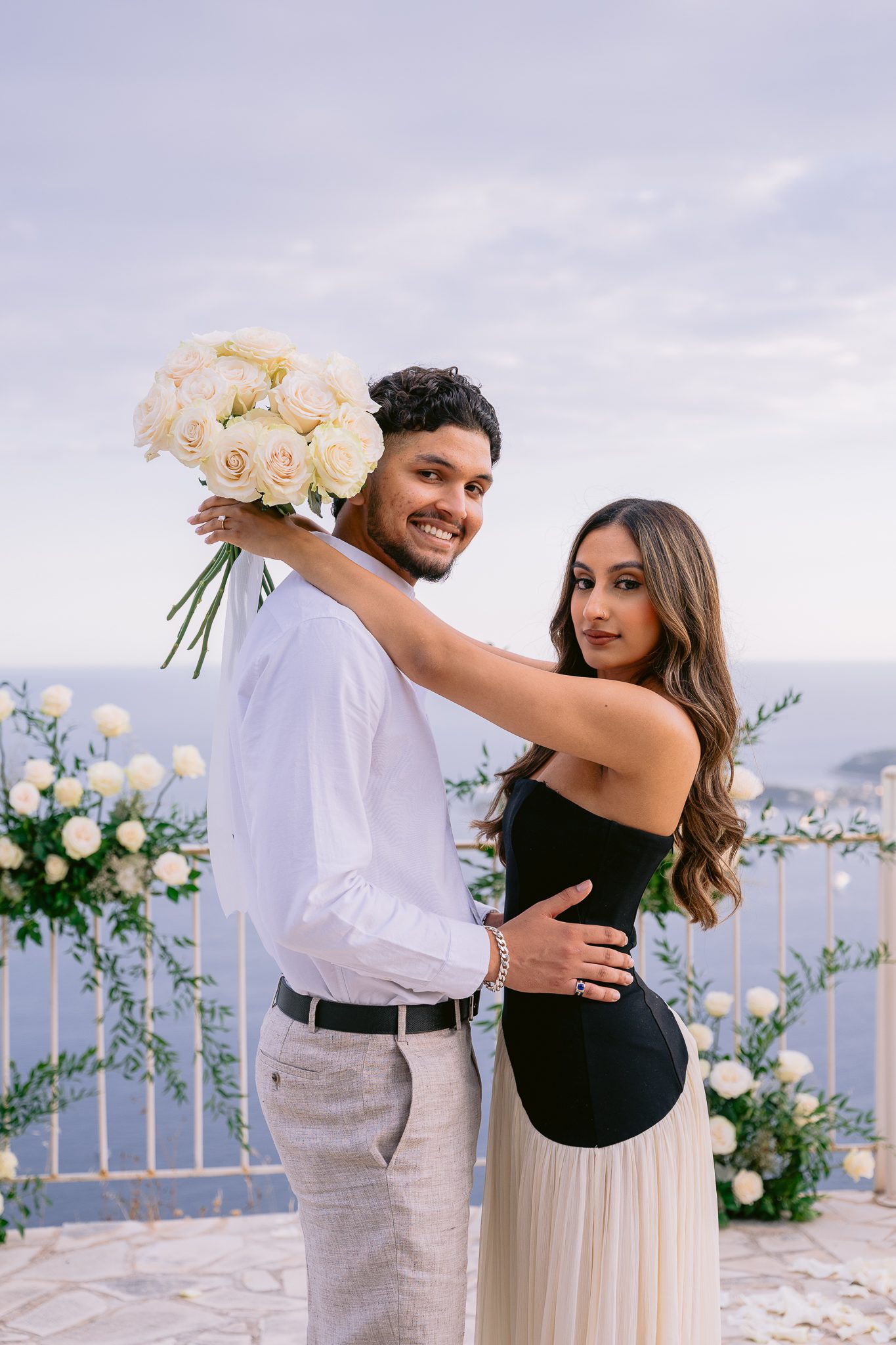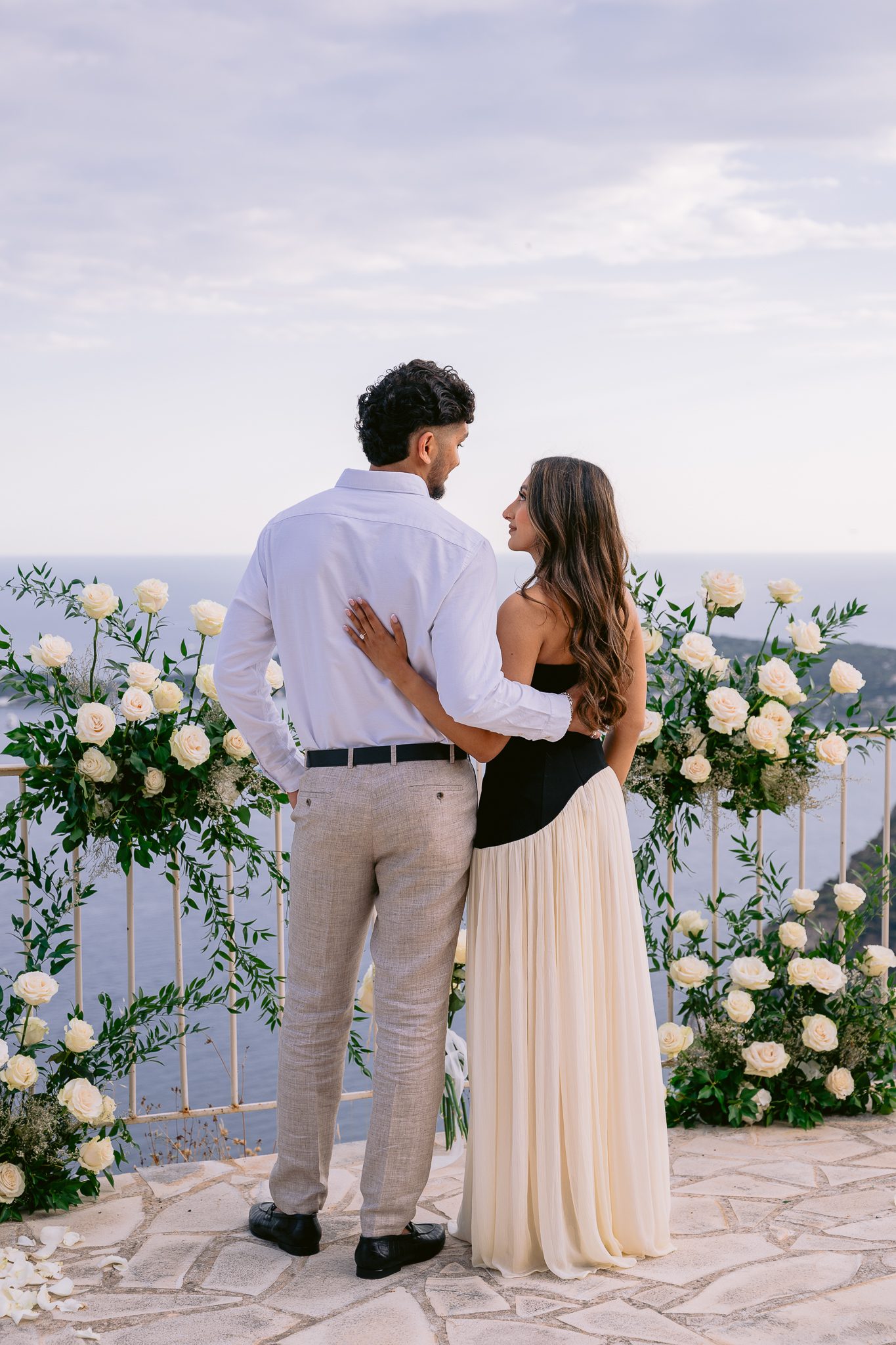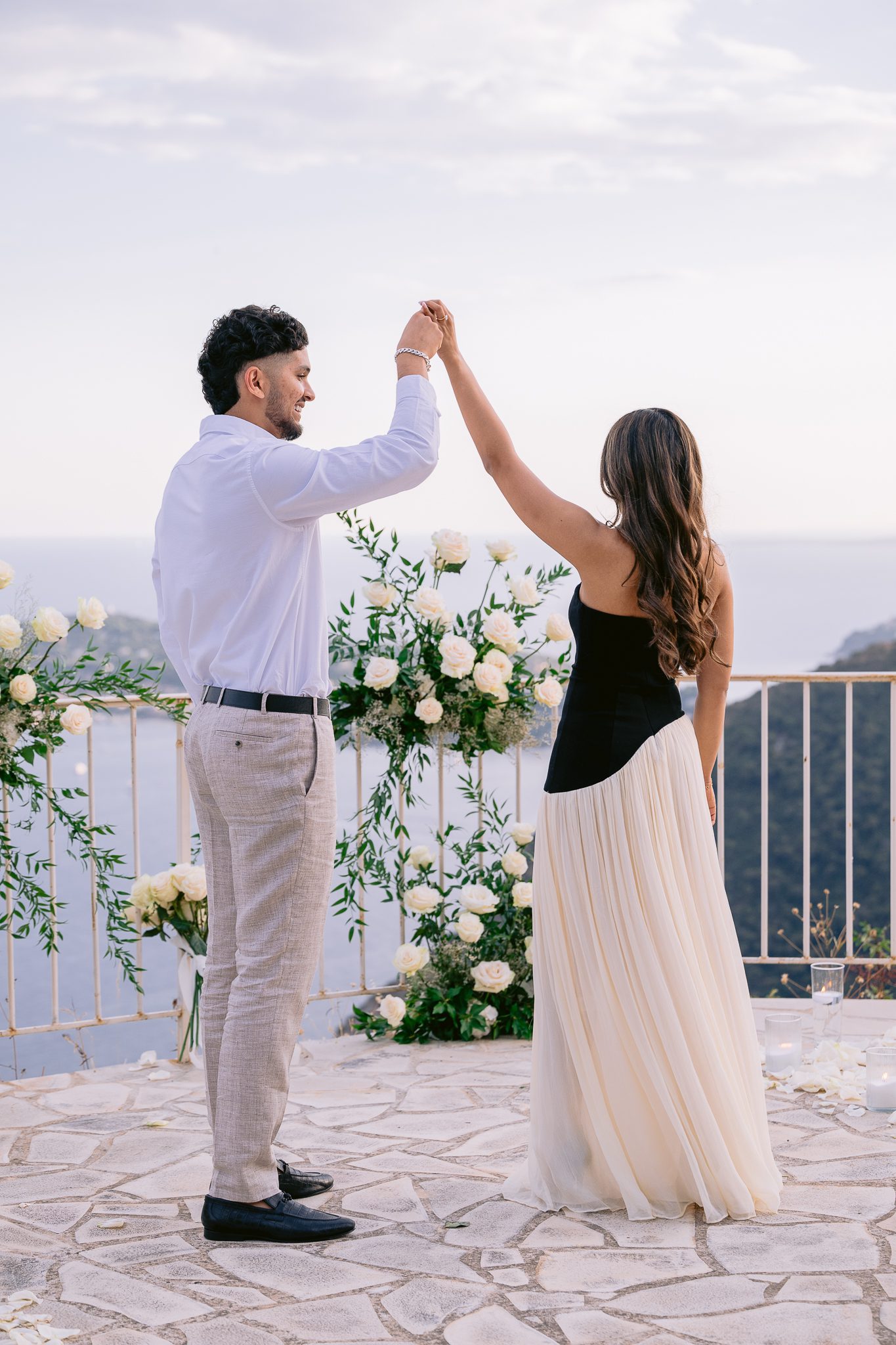 There are places that make an immediate impression, and then there are those that achieve something rarer: creating a real silence around the moment. This marriage proposal at La Chèvre d'Or, on the third terrace of the Café du Jardin, was one of those moments. A breathtaking view of the sea, a terrace suspended above the landscape, elegantly designed white floral decorations, and that very special feeling of being in a spectacular setting and yet in a totally intimate bubble.