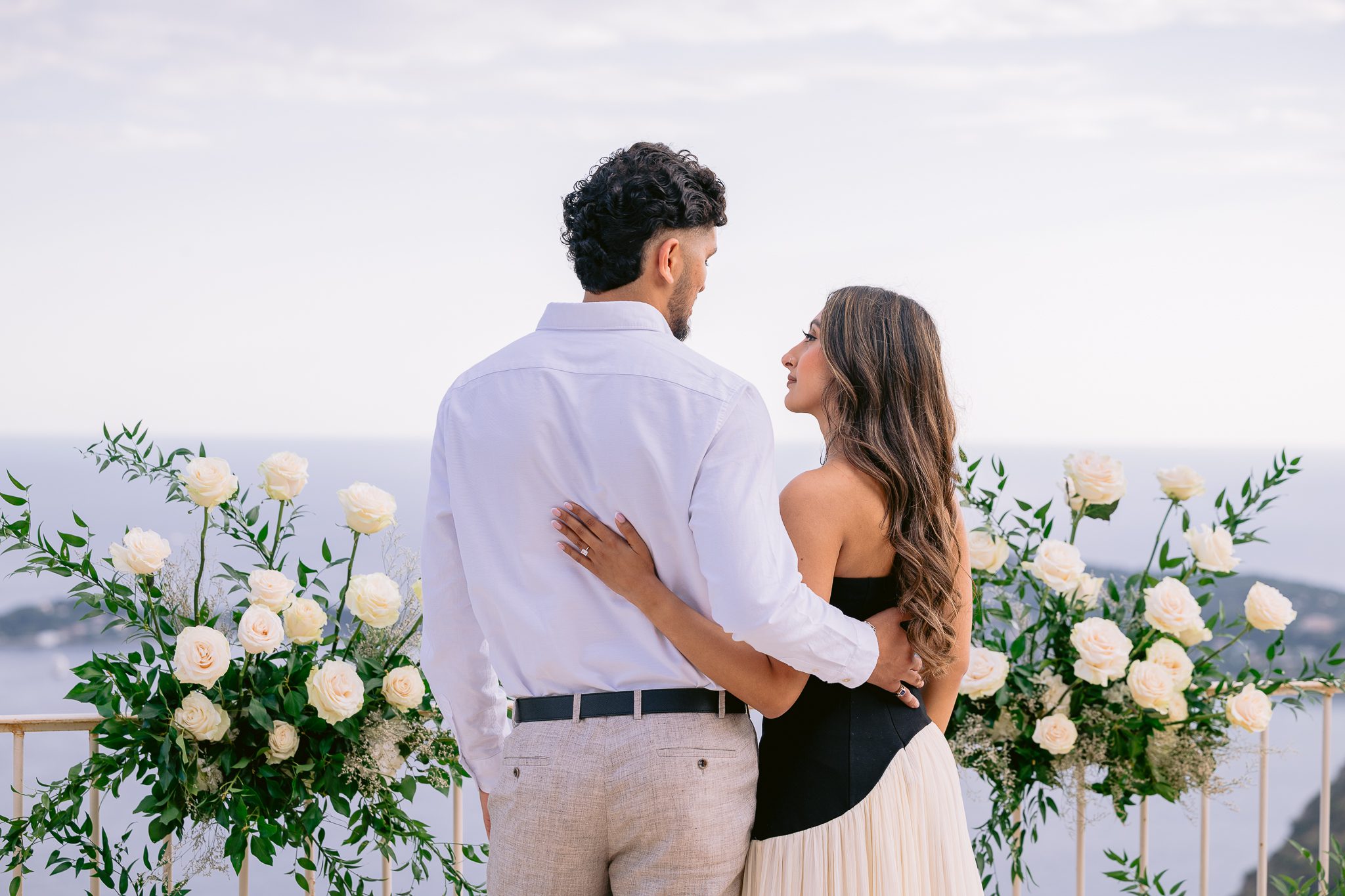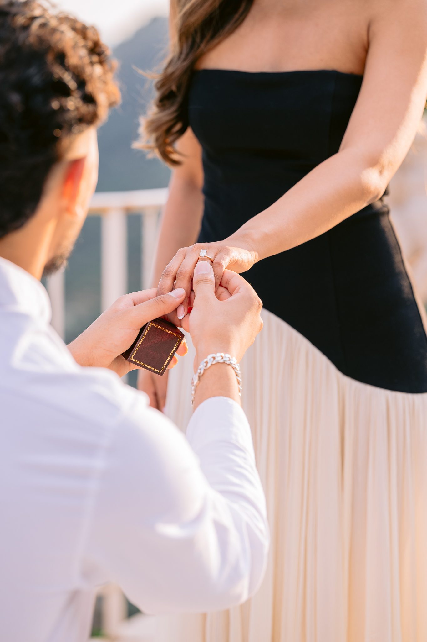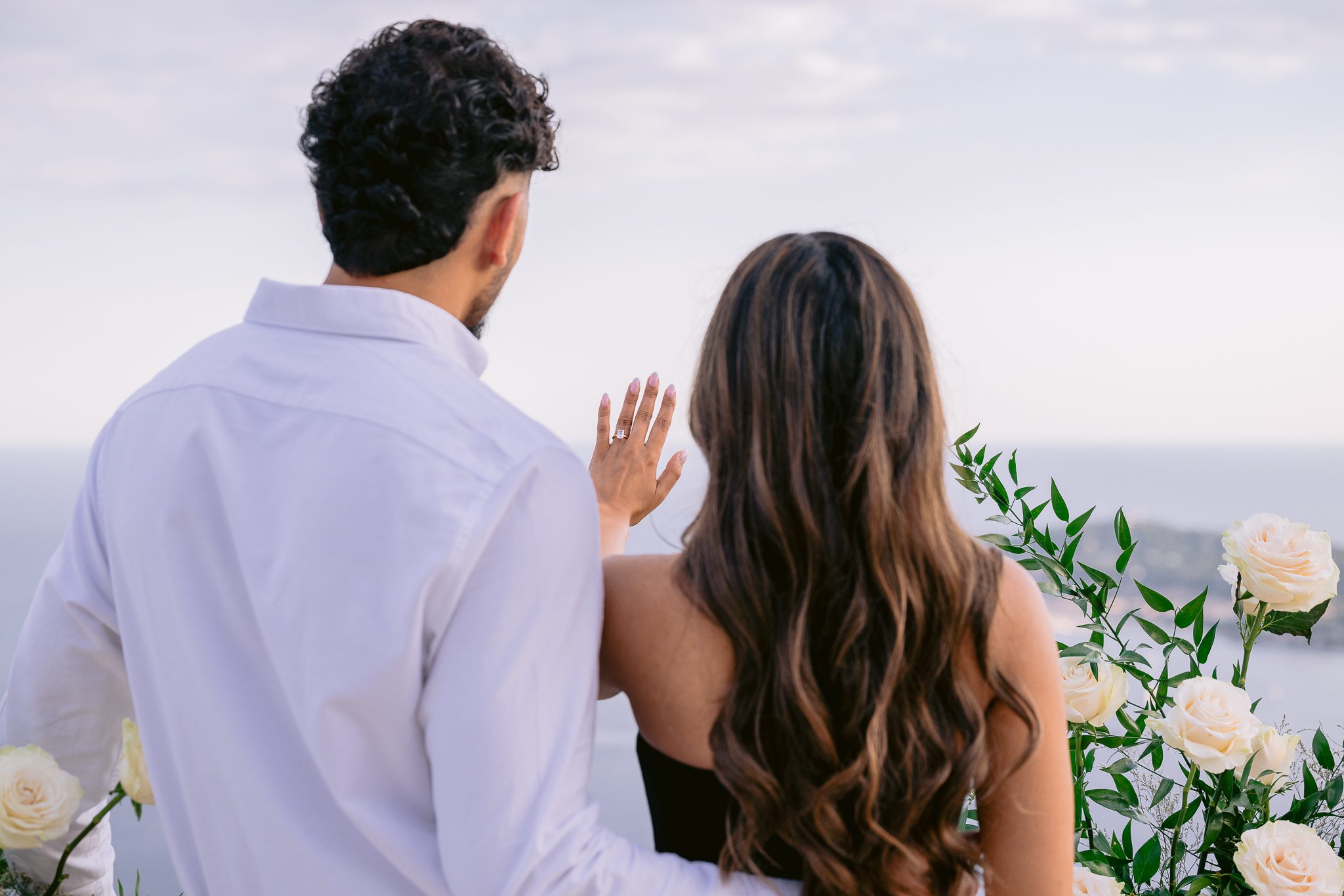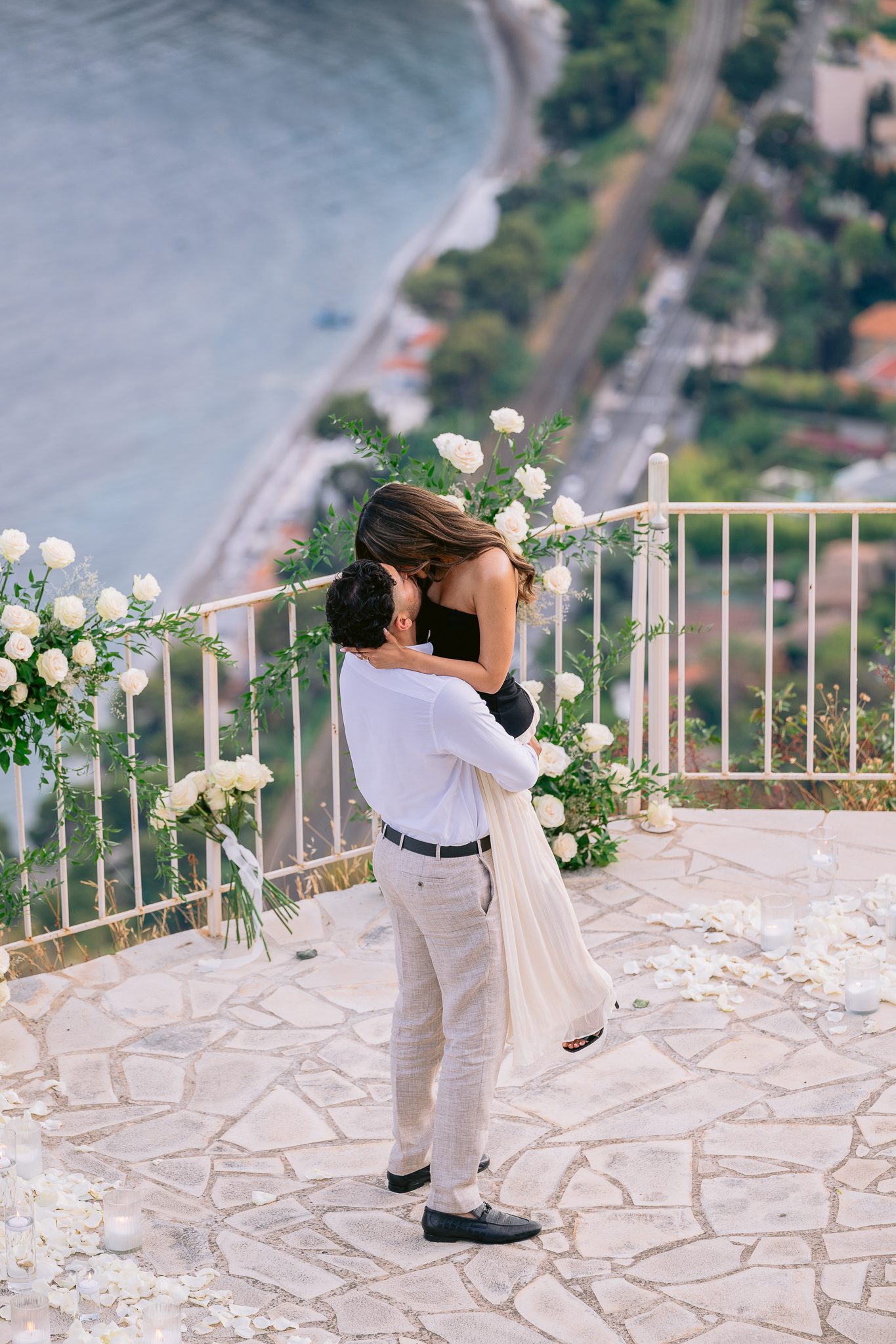 In this kind of proposal, I like the grandiose as much as the details. Of course, wide shots are essential. They tell the story of the place, the magnitude of the moment, the beauty of the Riviera. But what I love just as much are the hands, the ring, the downcast gaze, the held breath, the seconds just after the proposal.