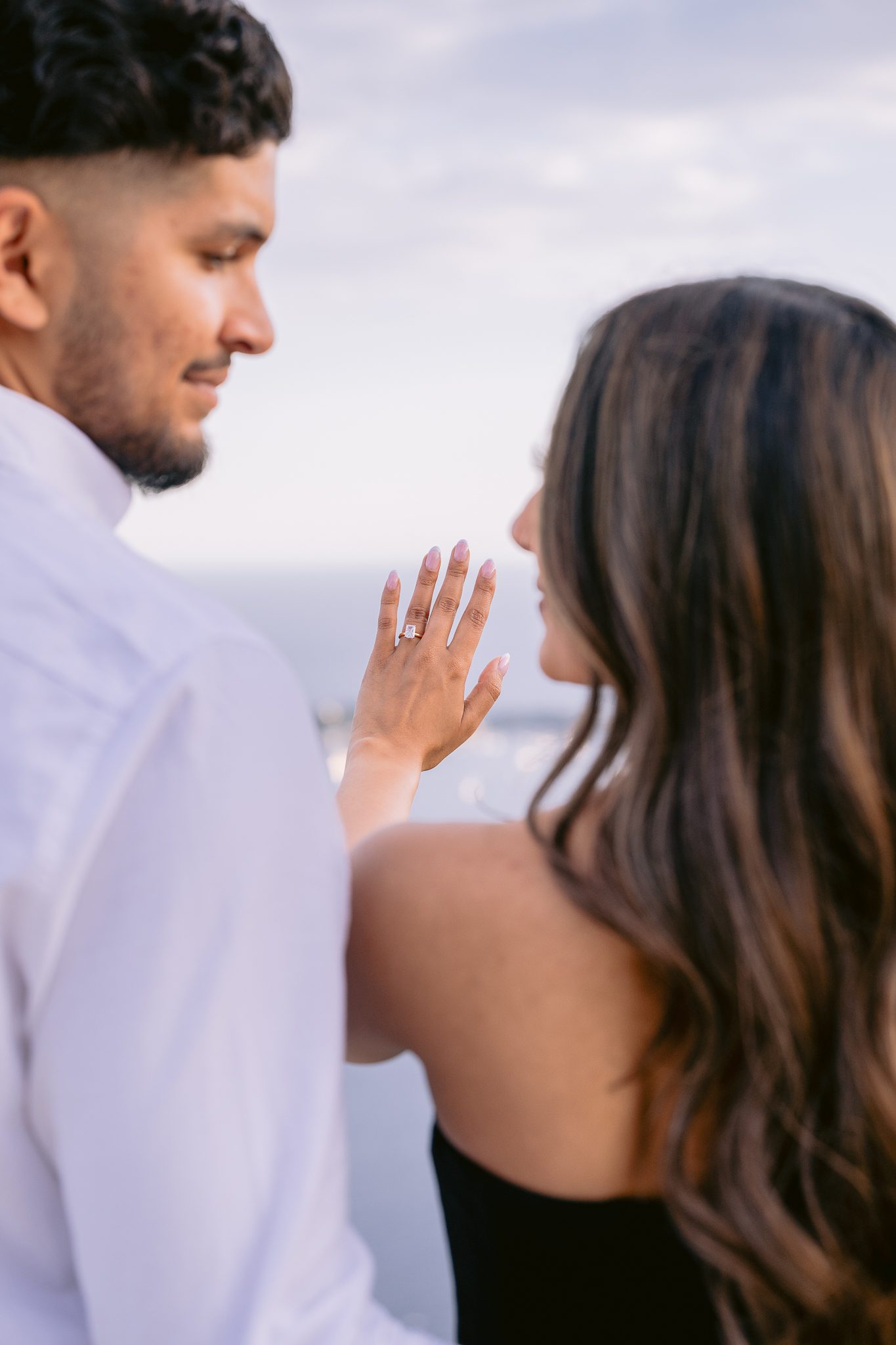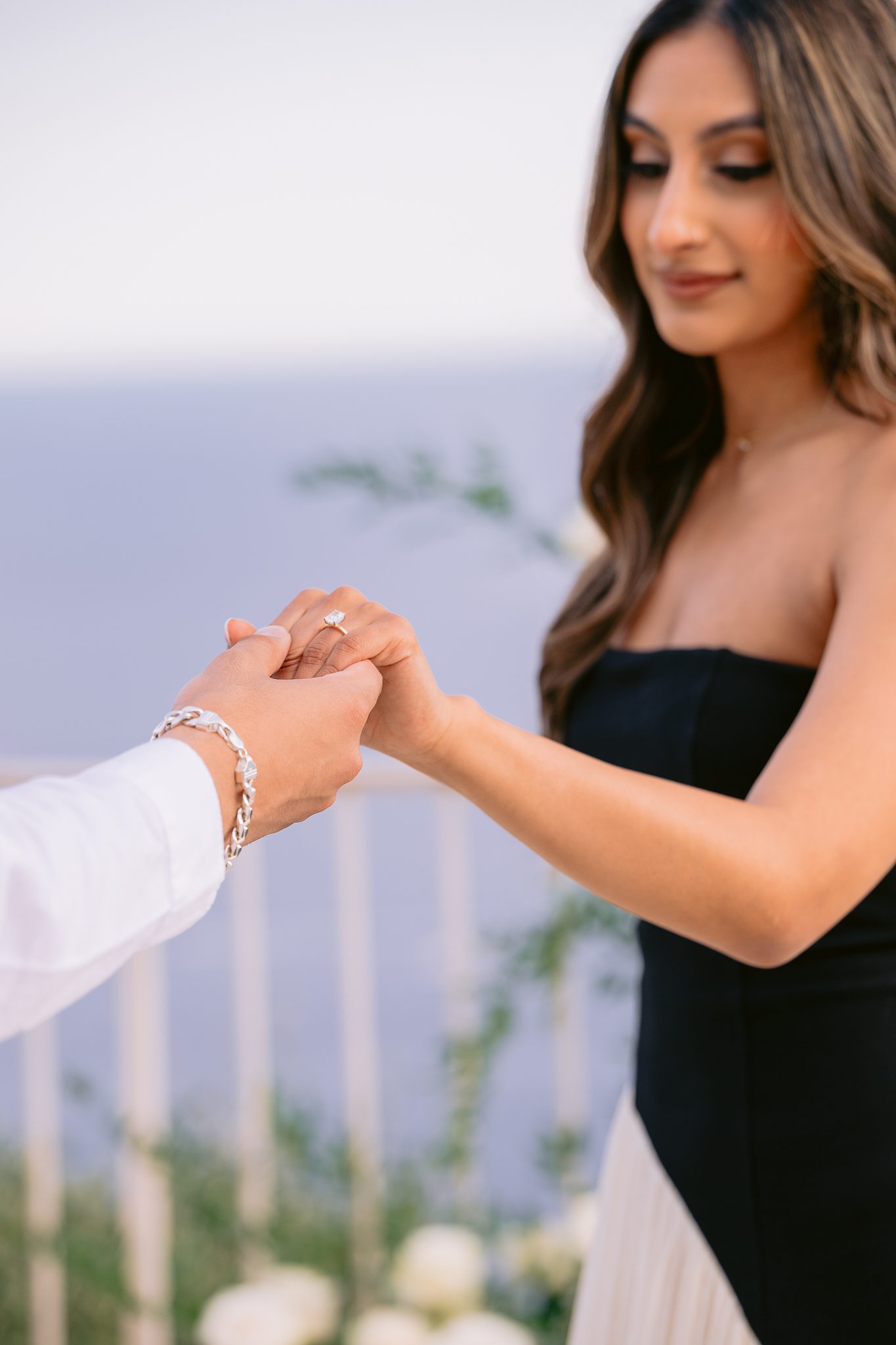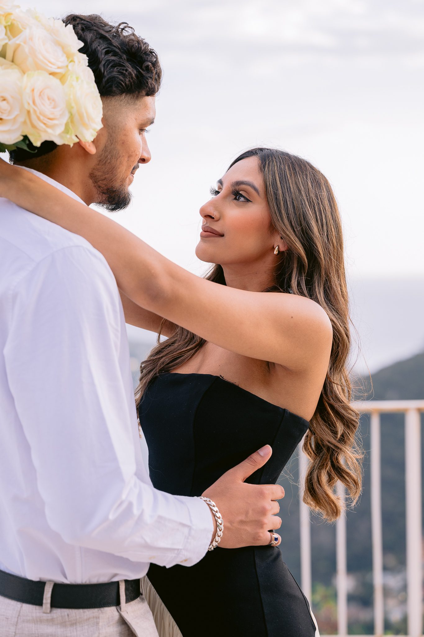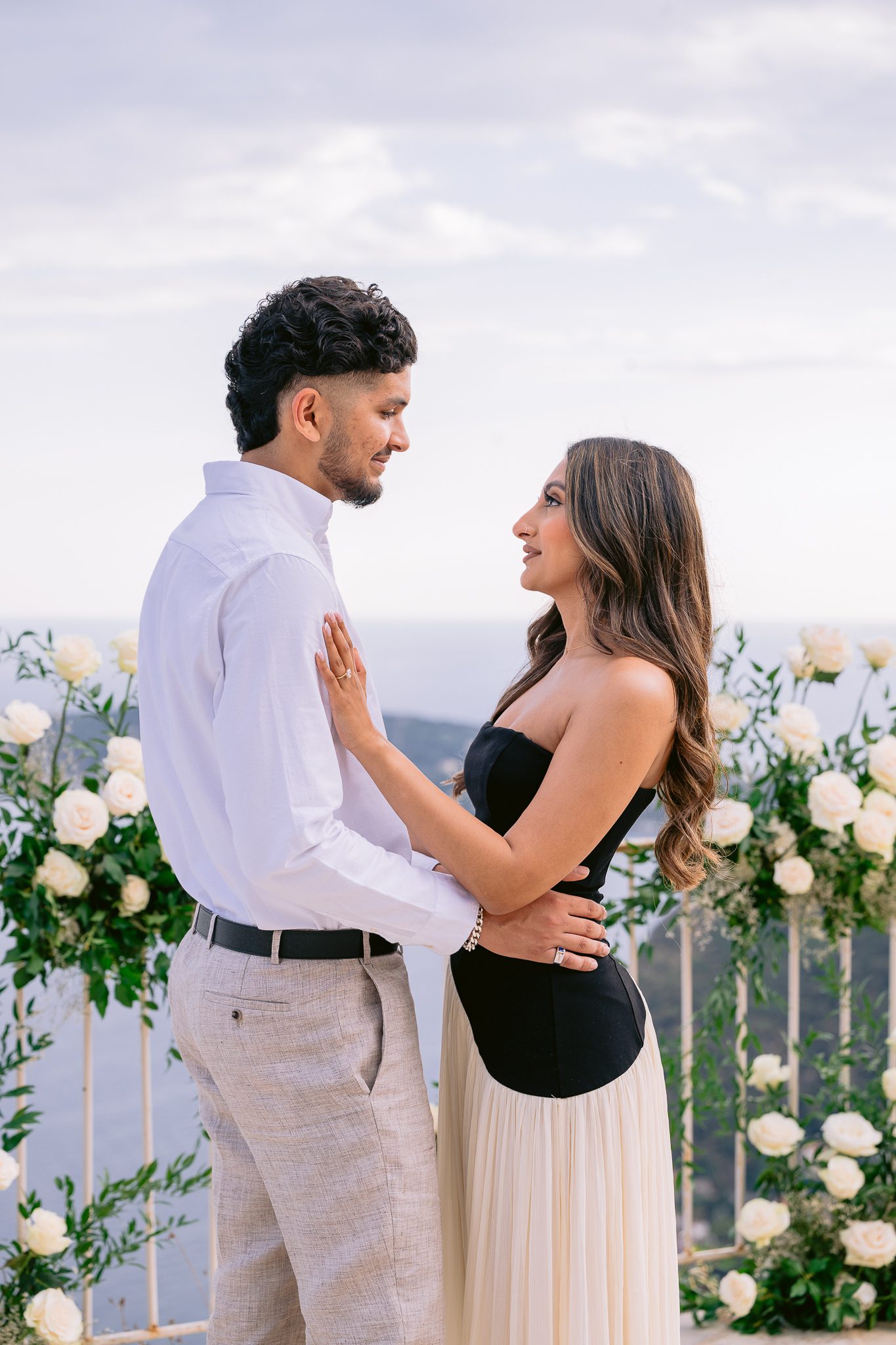 In this kind of proposal, I like the grandiose as much as the details. Of course, wide shots are essential. They tell the story of the place, the magnitude of the moment, the beauty of the Riviera. But what I love just as much are the hands, the ring, the downcast gaze, the held breath, the seconds just after the proposal.