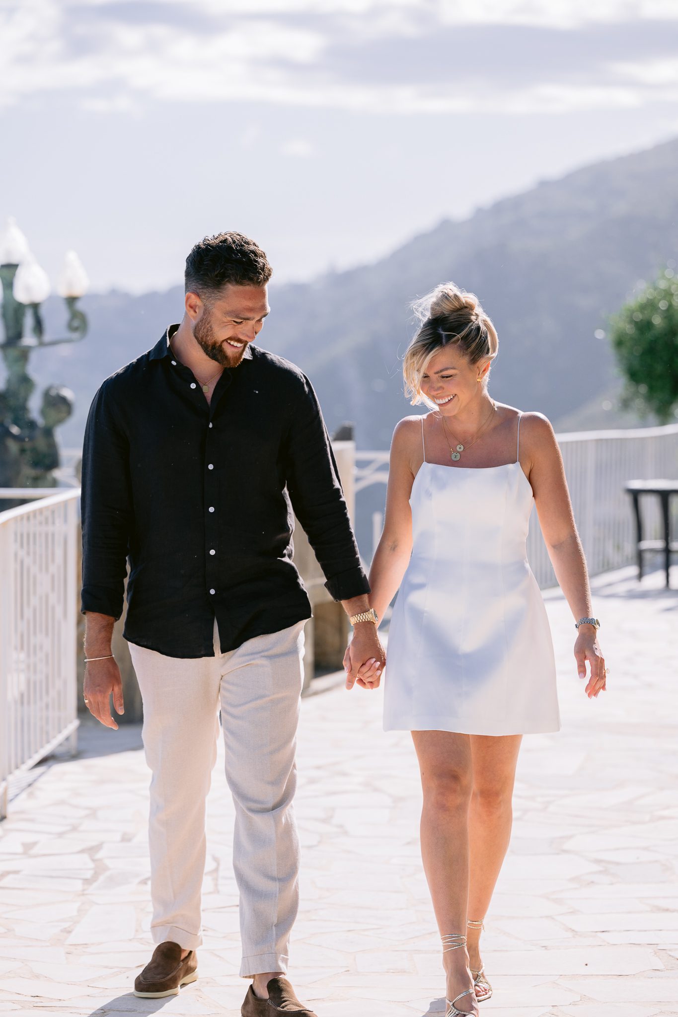 But what's particularly interesting here is that the session can then continue in other parts of the venue. Once the request has been made, you can enjoy other perspectives, other lines, other atmospheres. The railing facing the sea, the walkways, the stairs, the more planted corners, the small architectural features of the site - all of this makes for a much richer engagement photo session than a simple series of portraits in the same place.