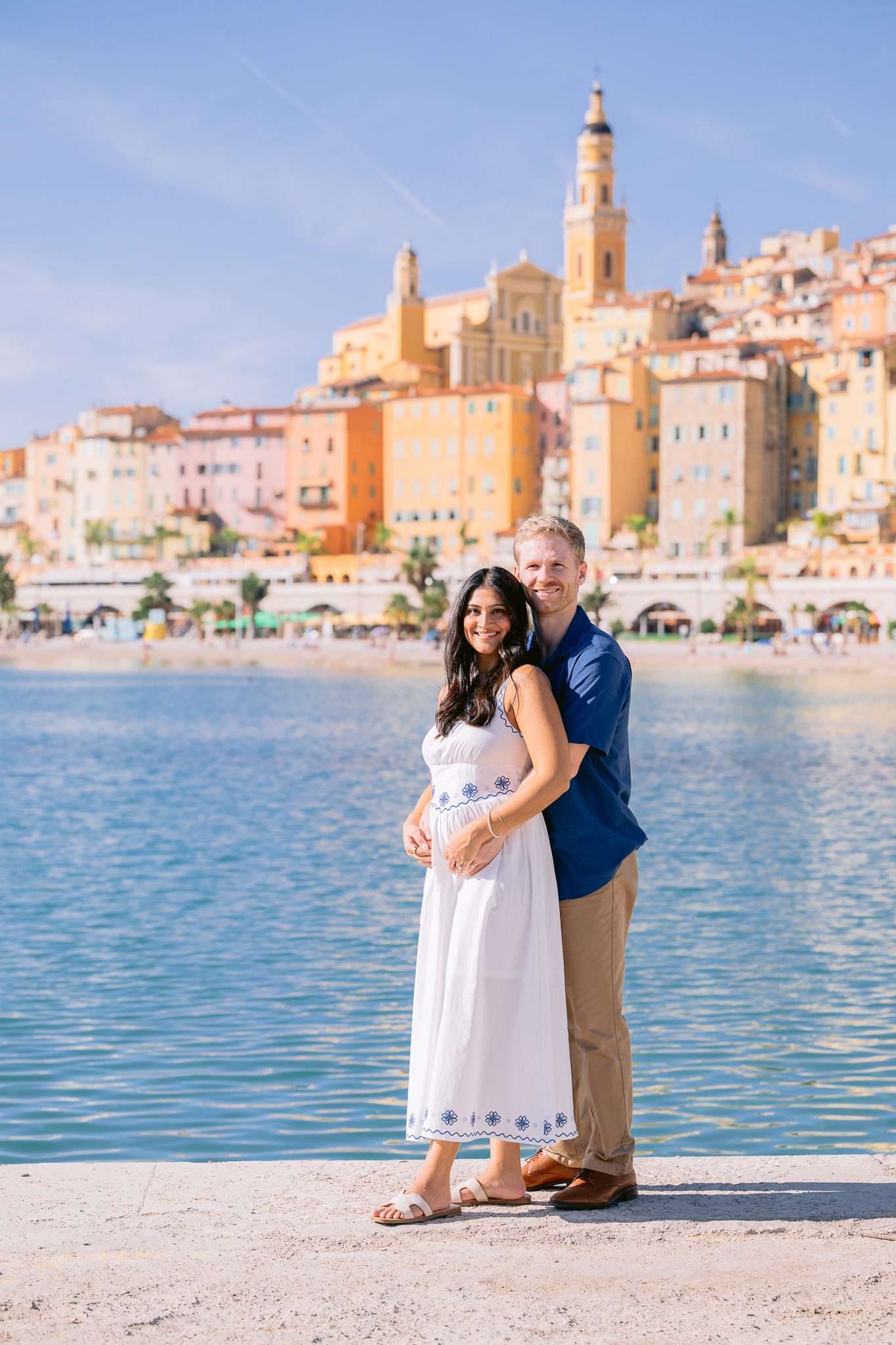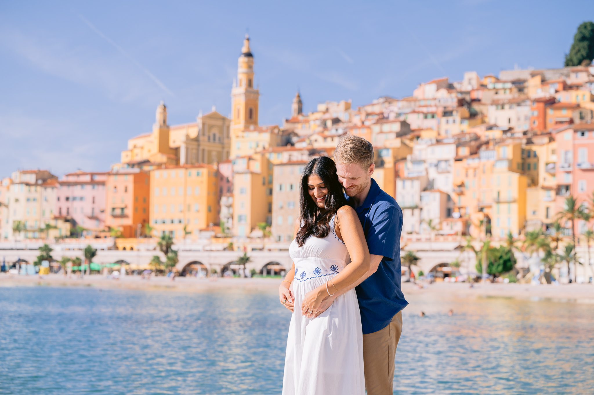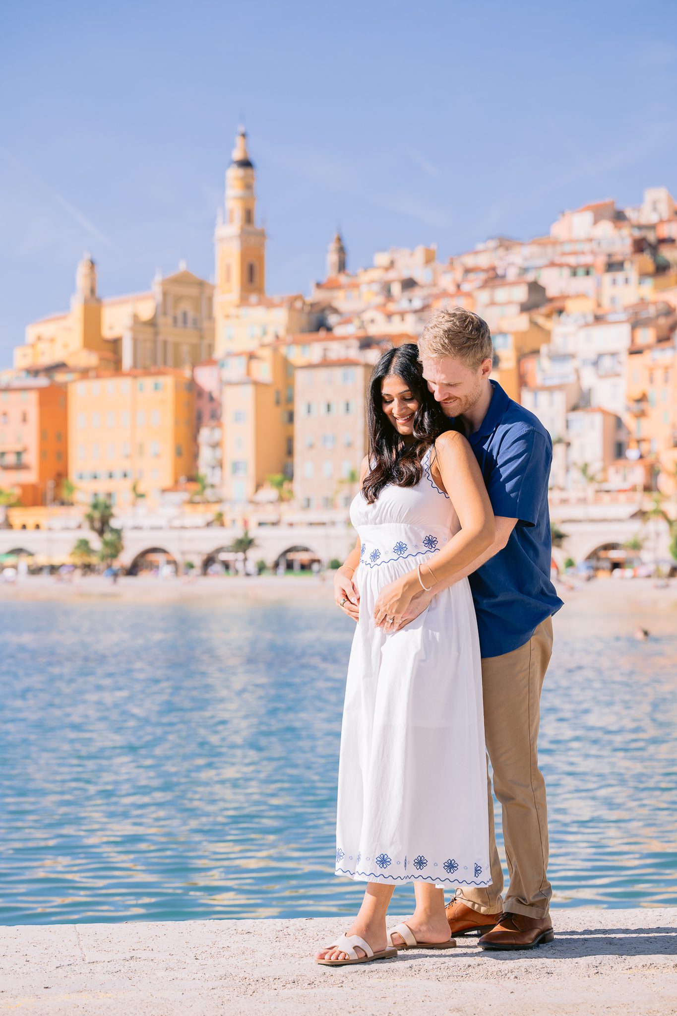 If you love this soft, luminous, natural atmosphere, the Plage des Sablettes is a great option for a pregnancy photo shoot in Menton. It's the perfect place for tender, elegant and deeply Mediterranean memories, with the sea on one side and the old town on the other.