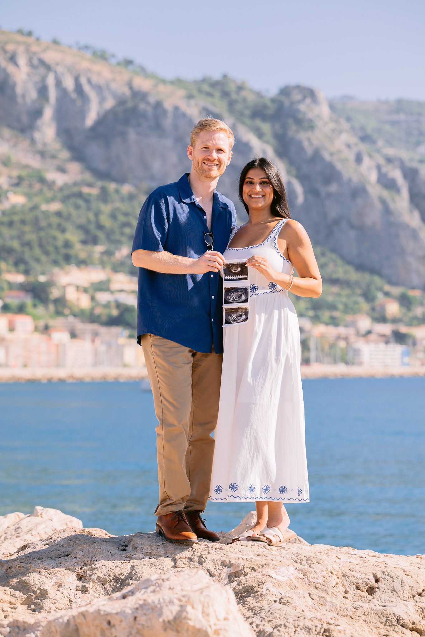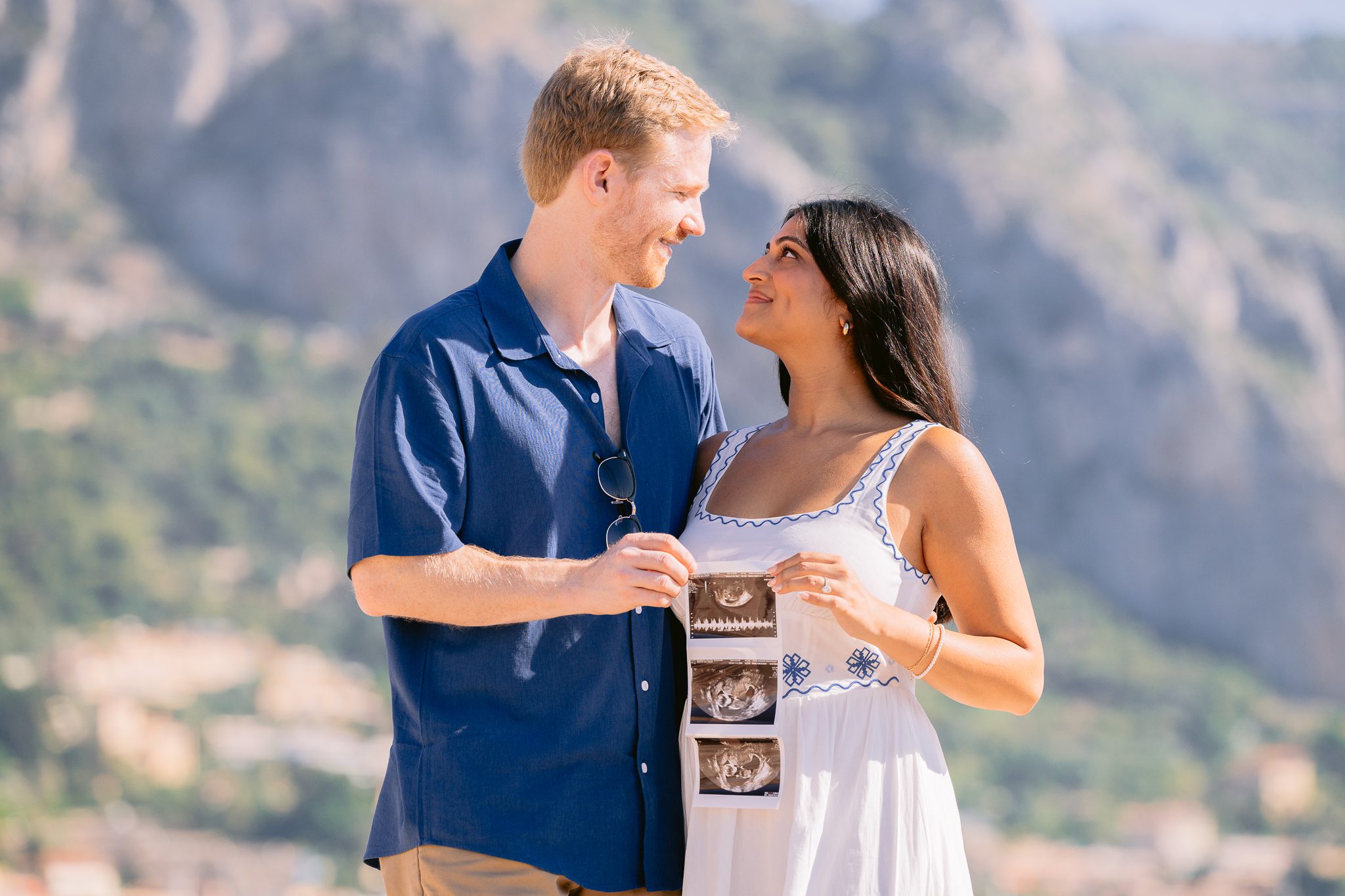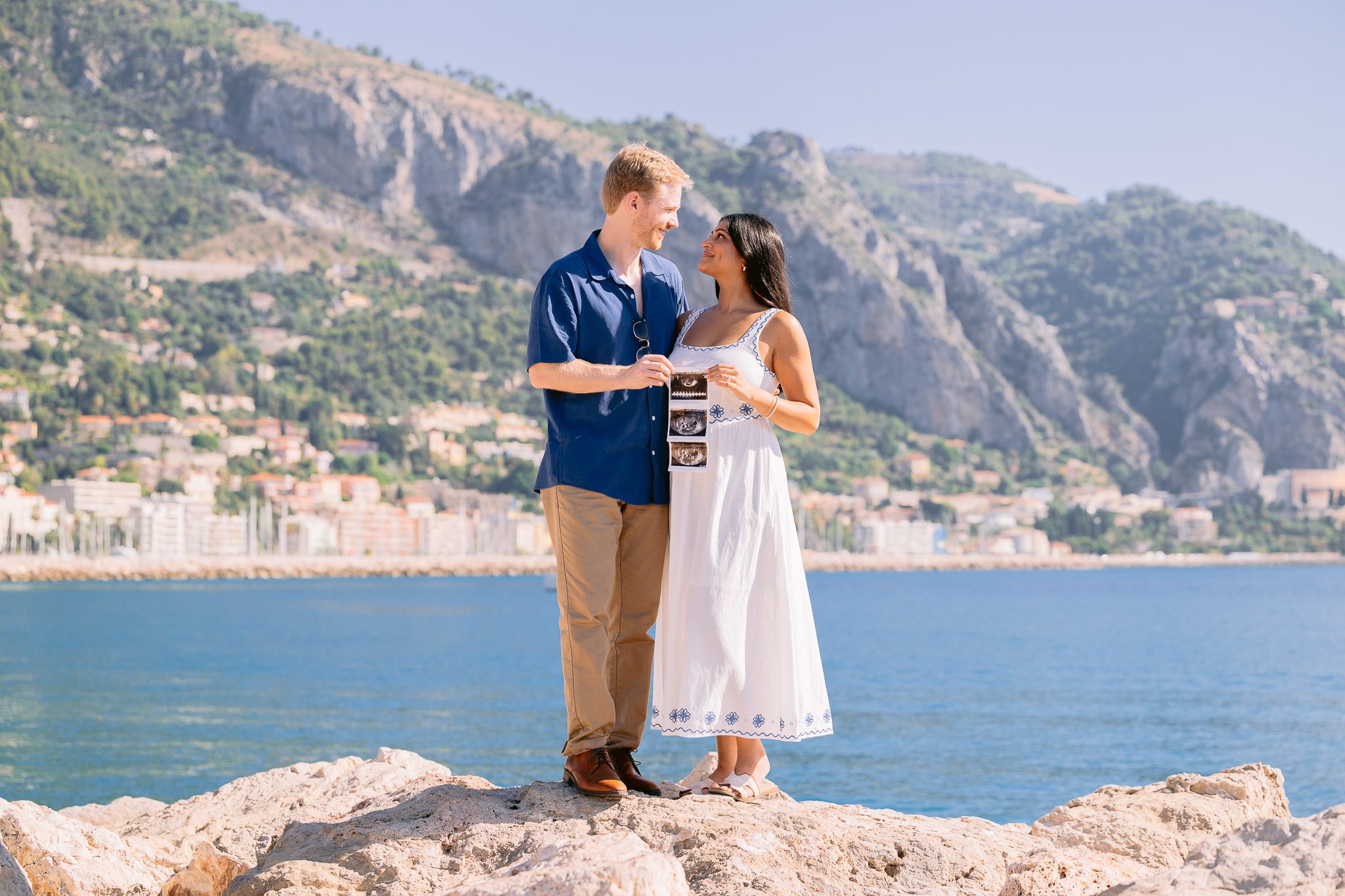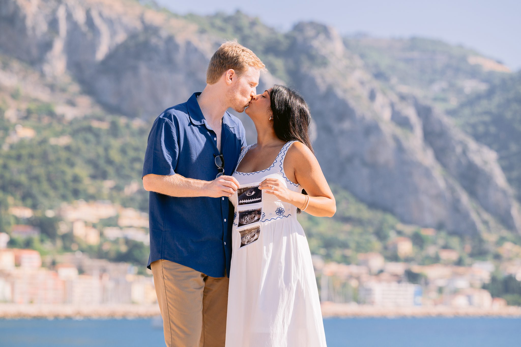 This pregnancy photo shoot in Menton also had something very personal about it, with lovely details around the baby announcement, the ultrasound, a diary imagined for the occasion, very gentle gestures between them, and that seaside light that makes everything so much lighter. Nothing overplayed, nothing staid, just a real moment, in one of the most beautiful settings on the Côte d'Azur.