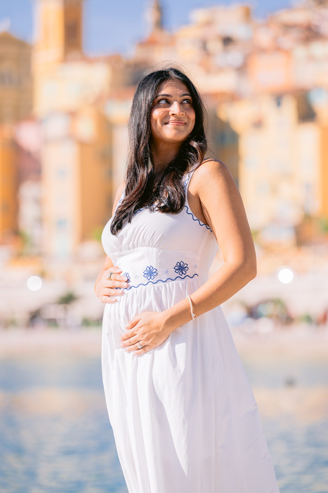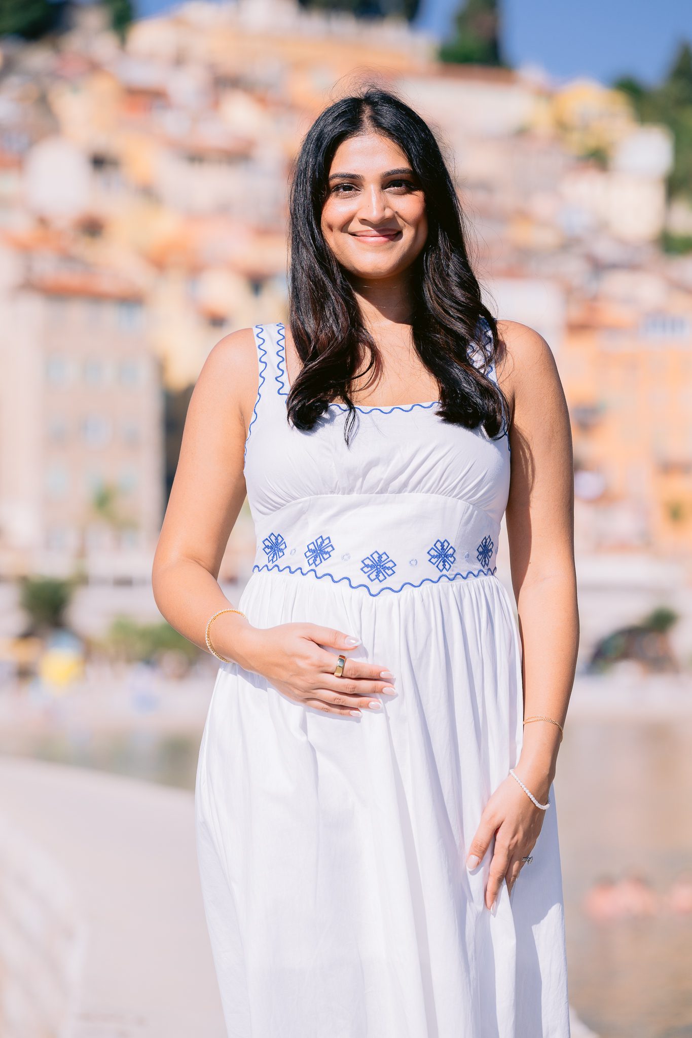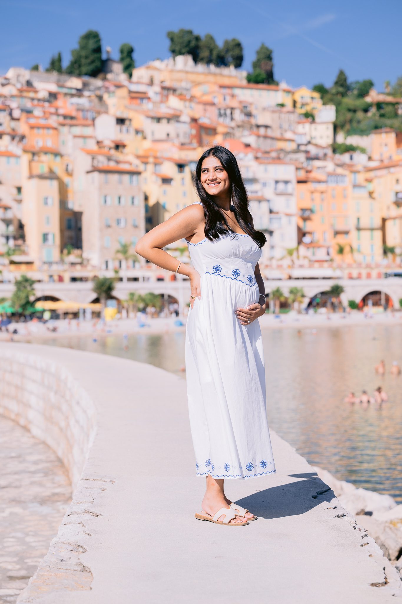 For me, a successful pregnancy session isn't just about a beautiful round belly or a pretty backdrop. It's about feeling. That of a calm, tender, real moment in which you feel good. Menton offers exactly that, especially in a place like Plage des Sablettes, where you can enjoy the sea, the light and the city without anything seeming forced.