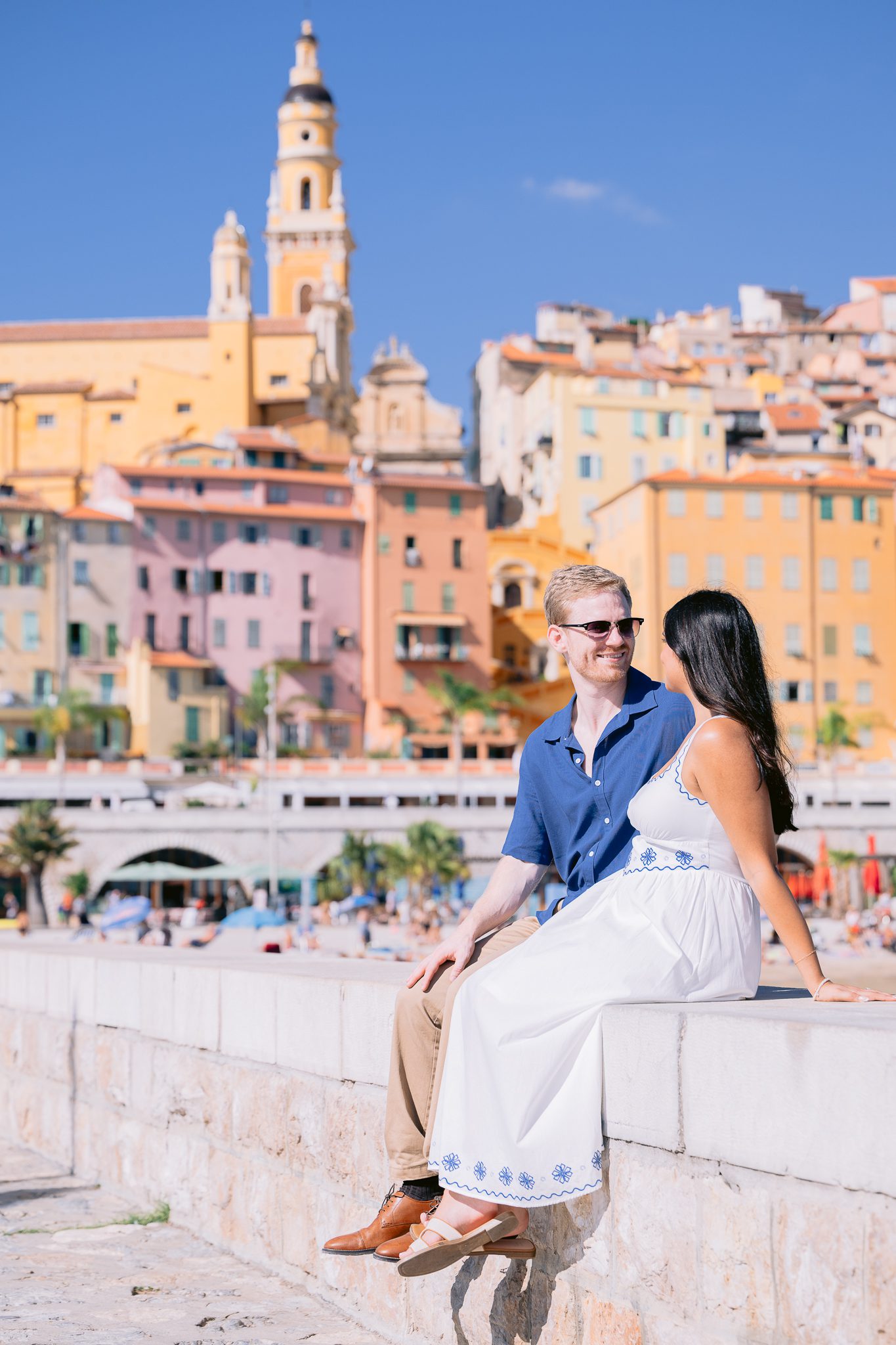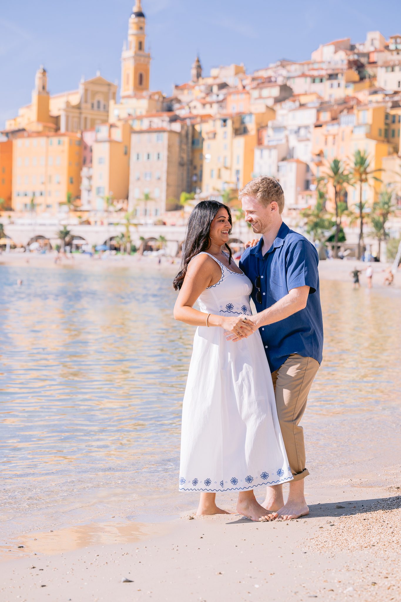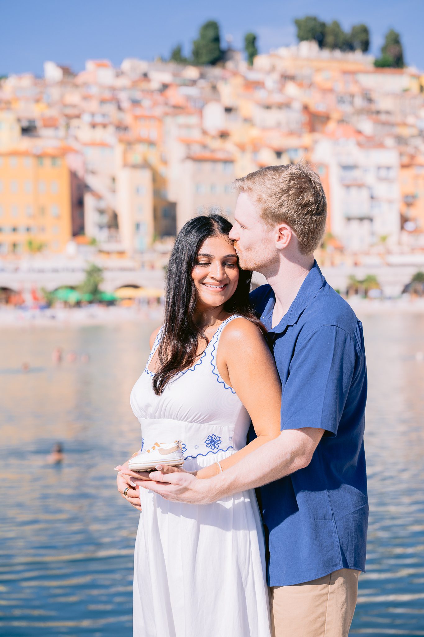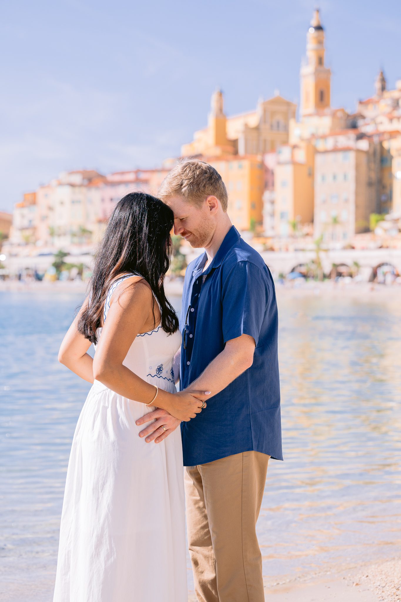 For this session, everything came together to create tender, luminous and very lively images. The sea was calm, the old town of Menton loomed in the background with its pastel facades and iconic bell tower, and the atmosphere remained simple, elegant and natural. That's exactly what I like about this type of reportage.