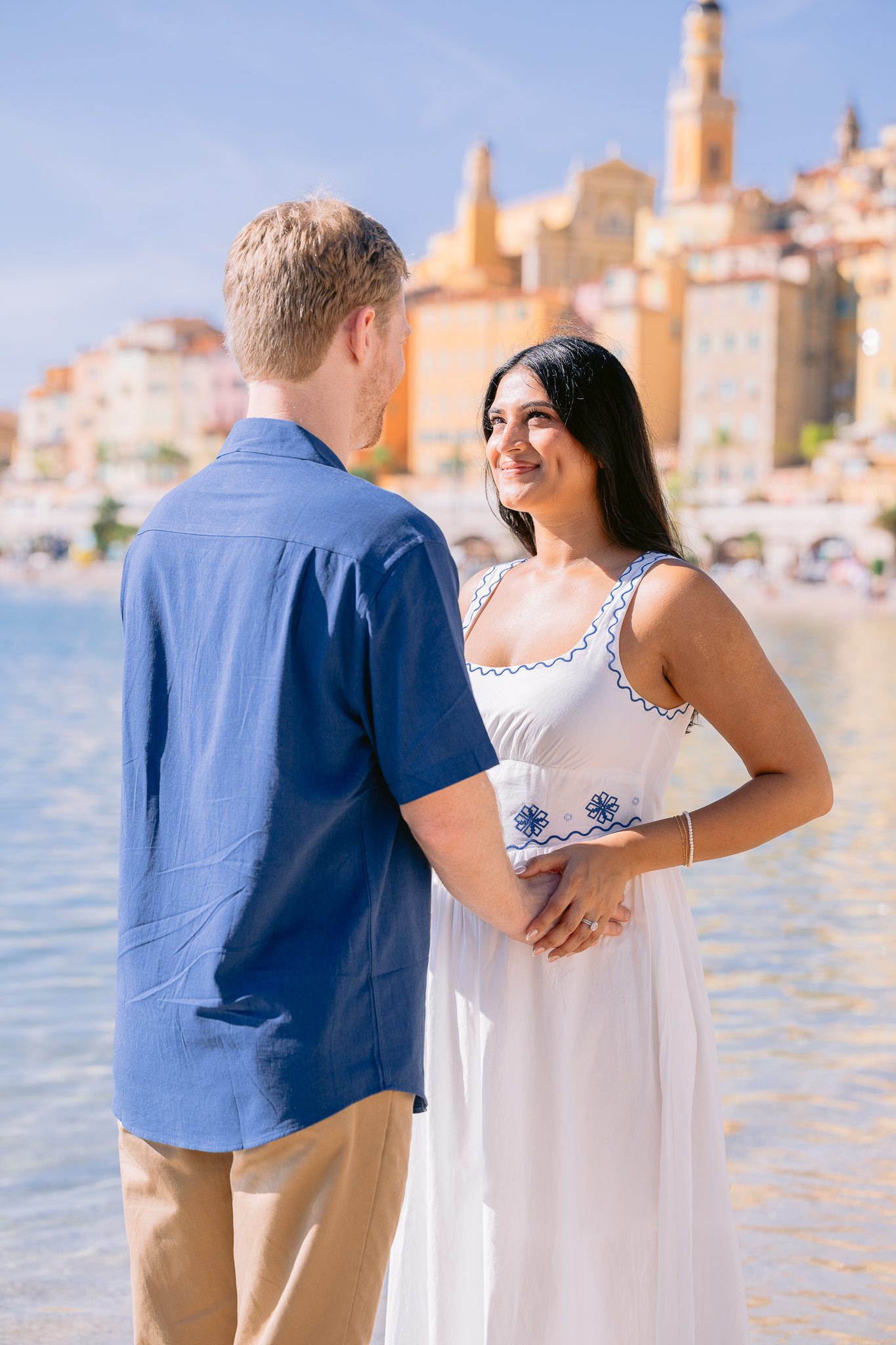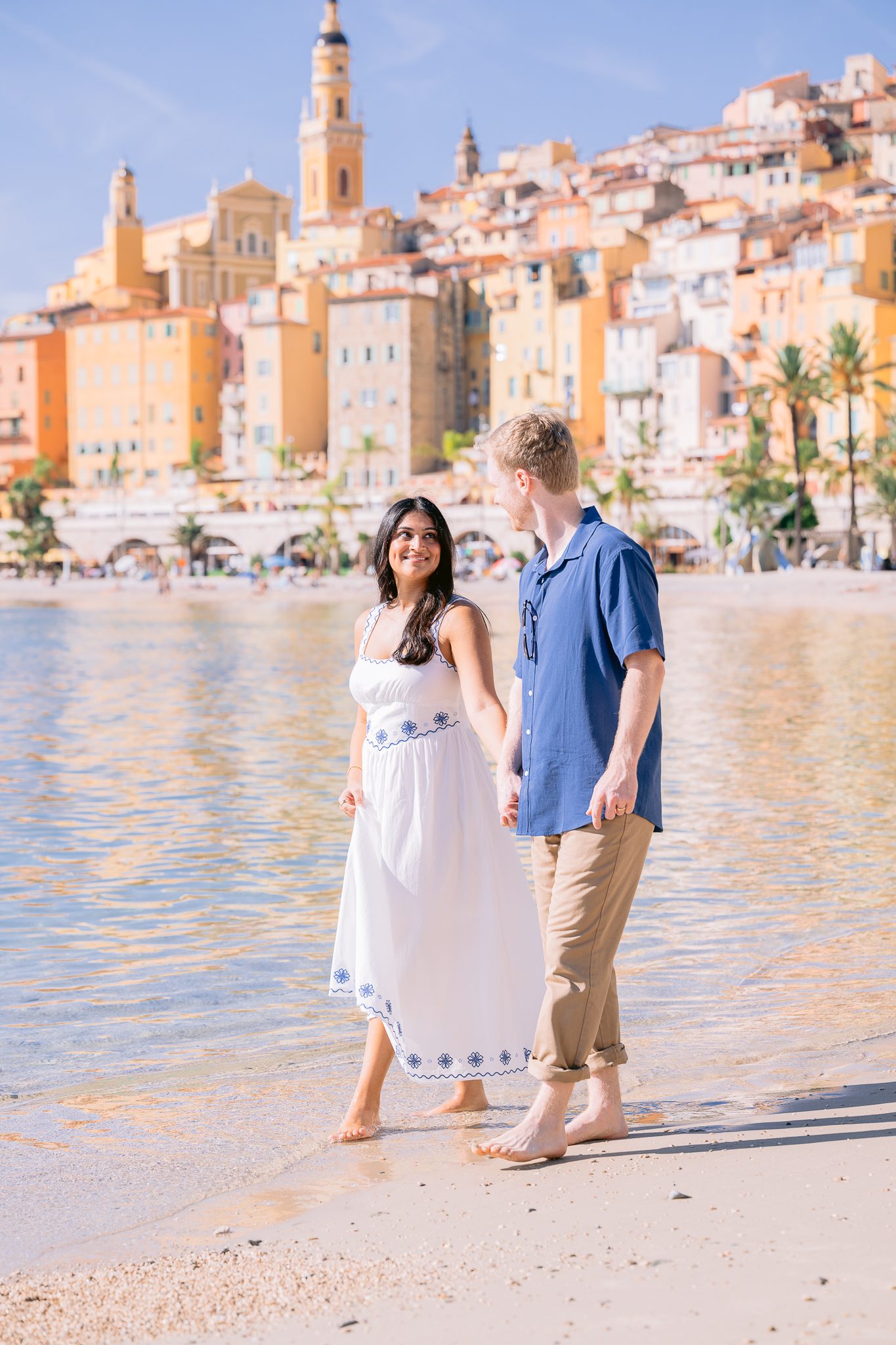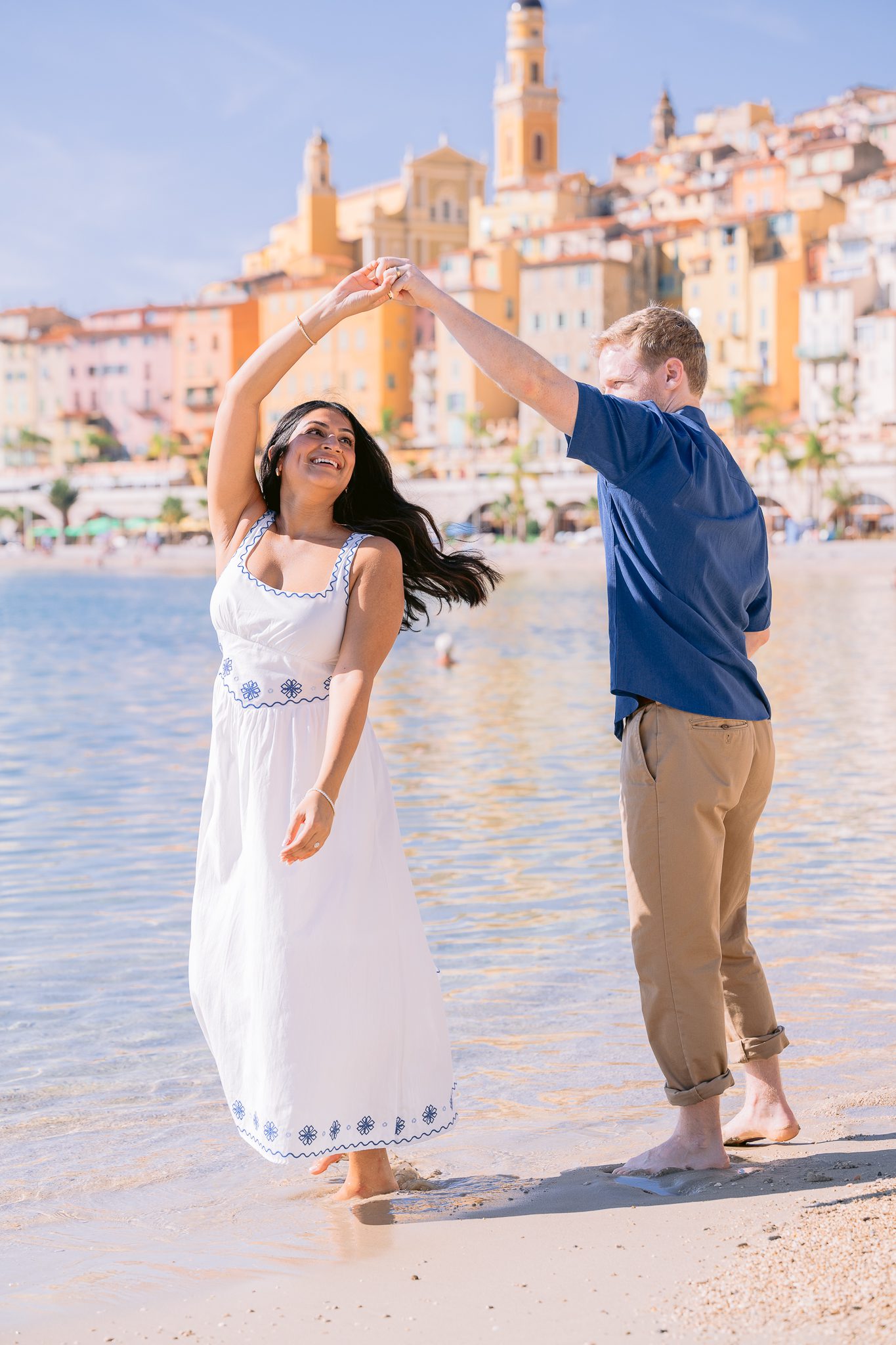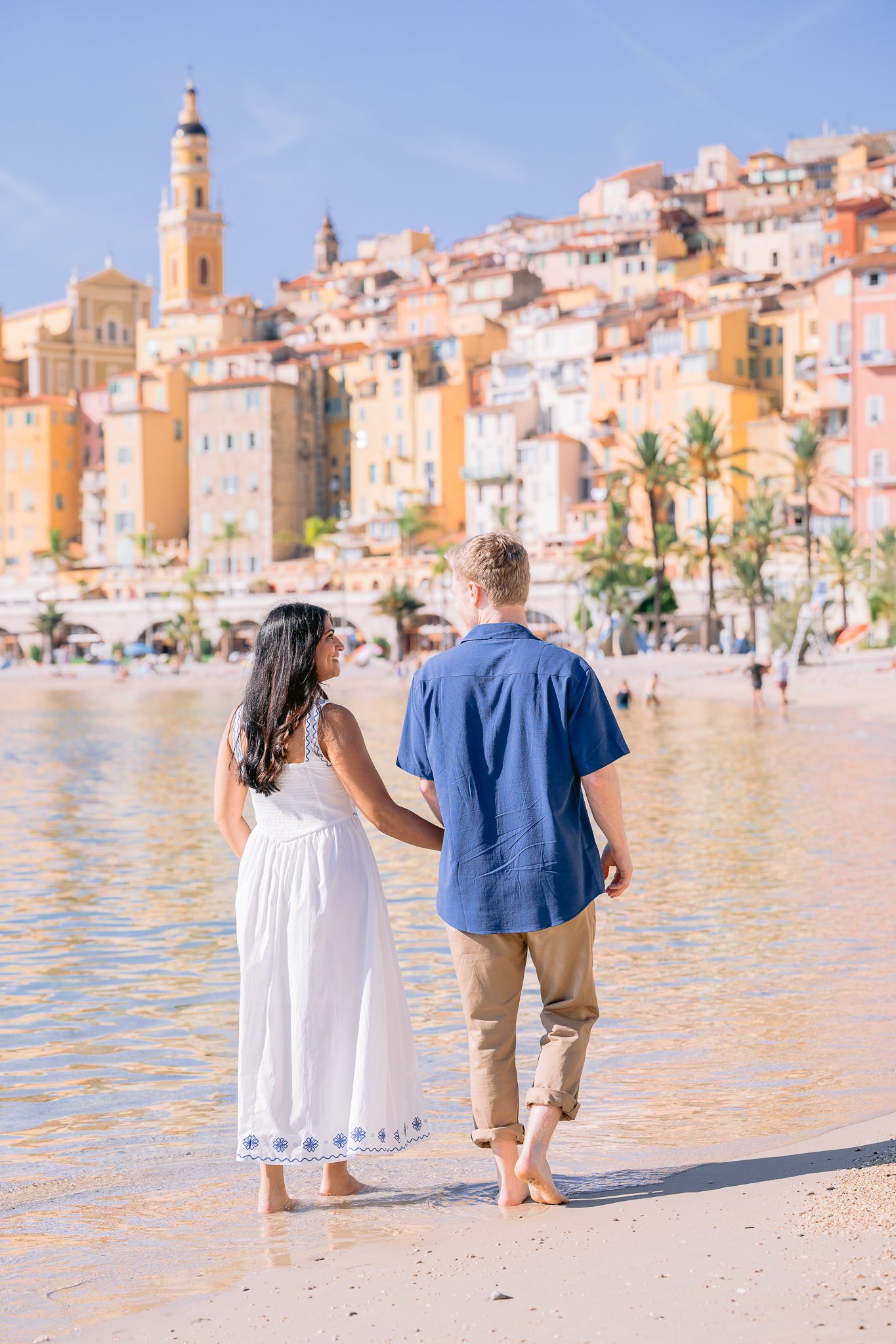 For this session, everything came together to create tender, luminous and very lively images. The sea was calm, the old town of Menton loomed in the background with its pastel facades and iconic bell tower, and the atmosphere remained simple, elegant and natural. That's exactly what I like about this type of reportage.