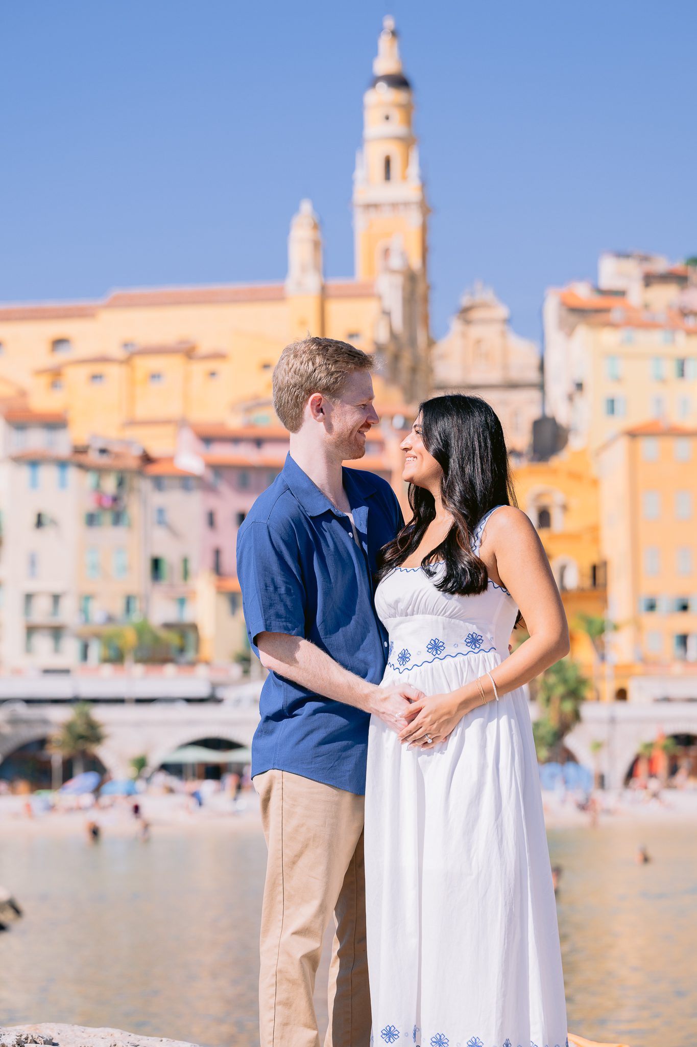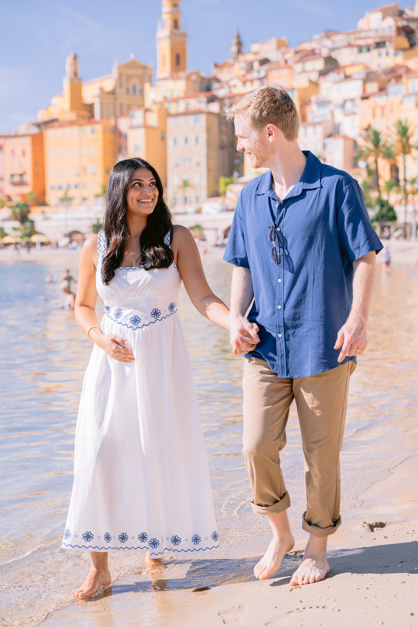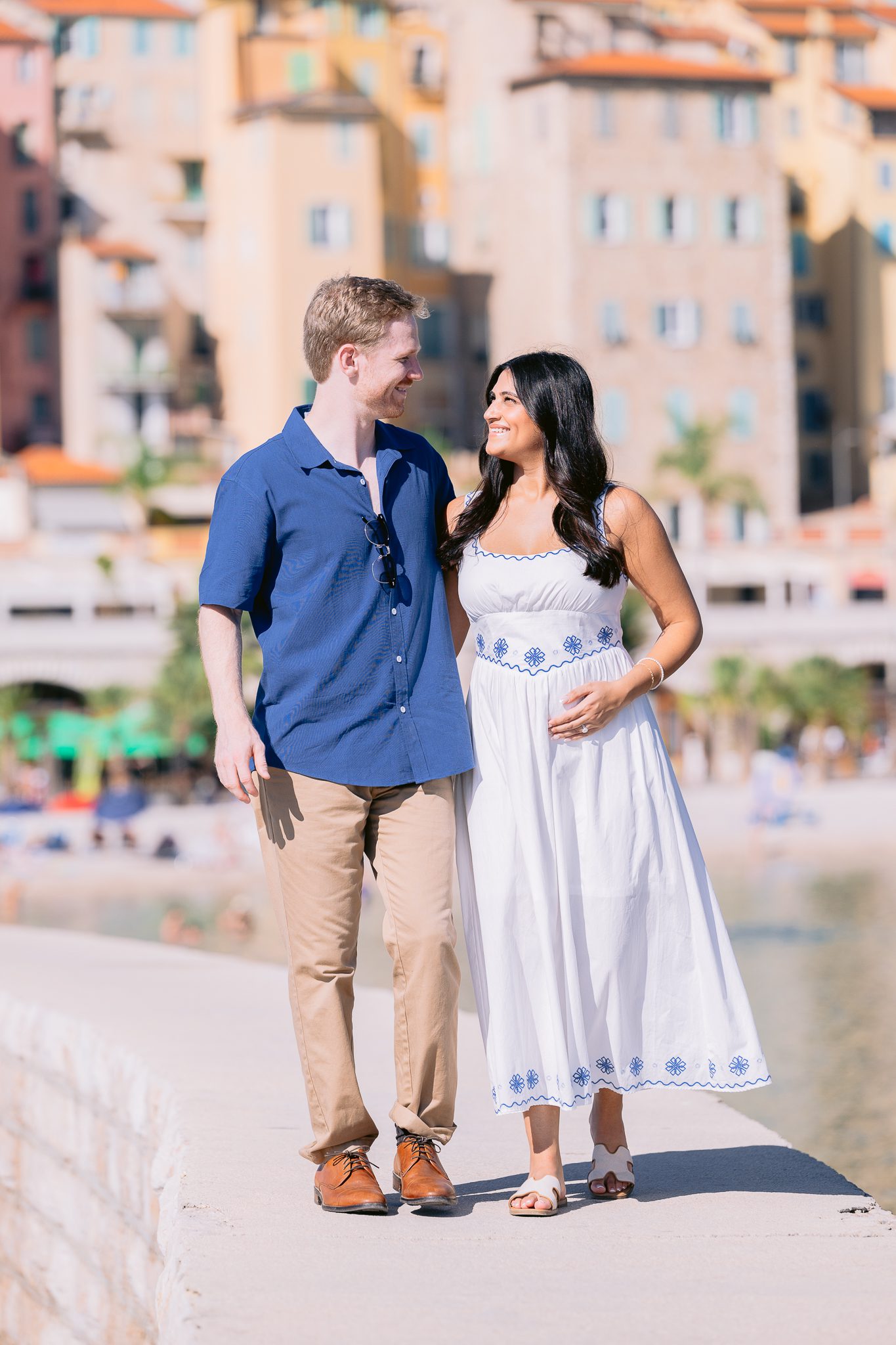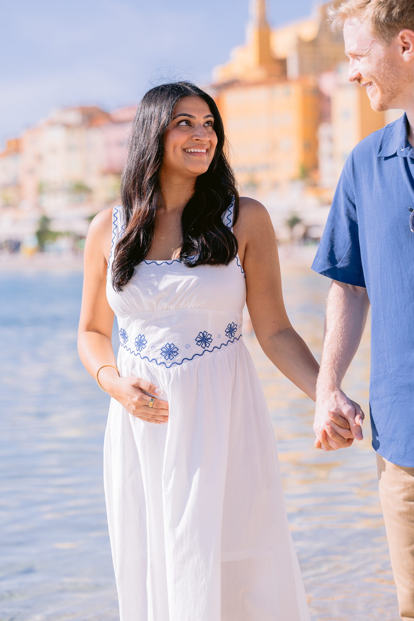 The Sablettes beach has a real advantage for a pregnancy session: it offers both the sea, a pleasant beach to walk on, and a direct view of the old town of Menton. The result is a highly photogenic setting, without the need to multiply the number of locations or complicate the session.