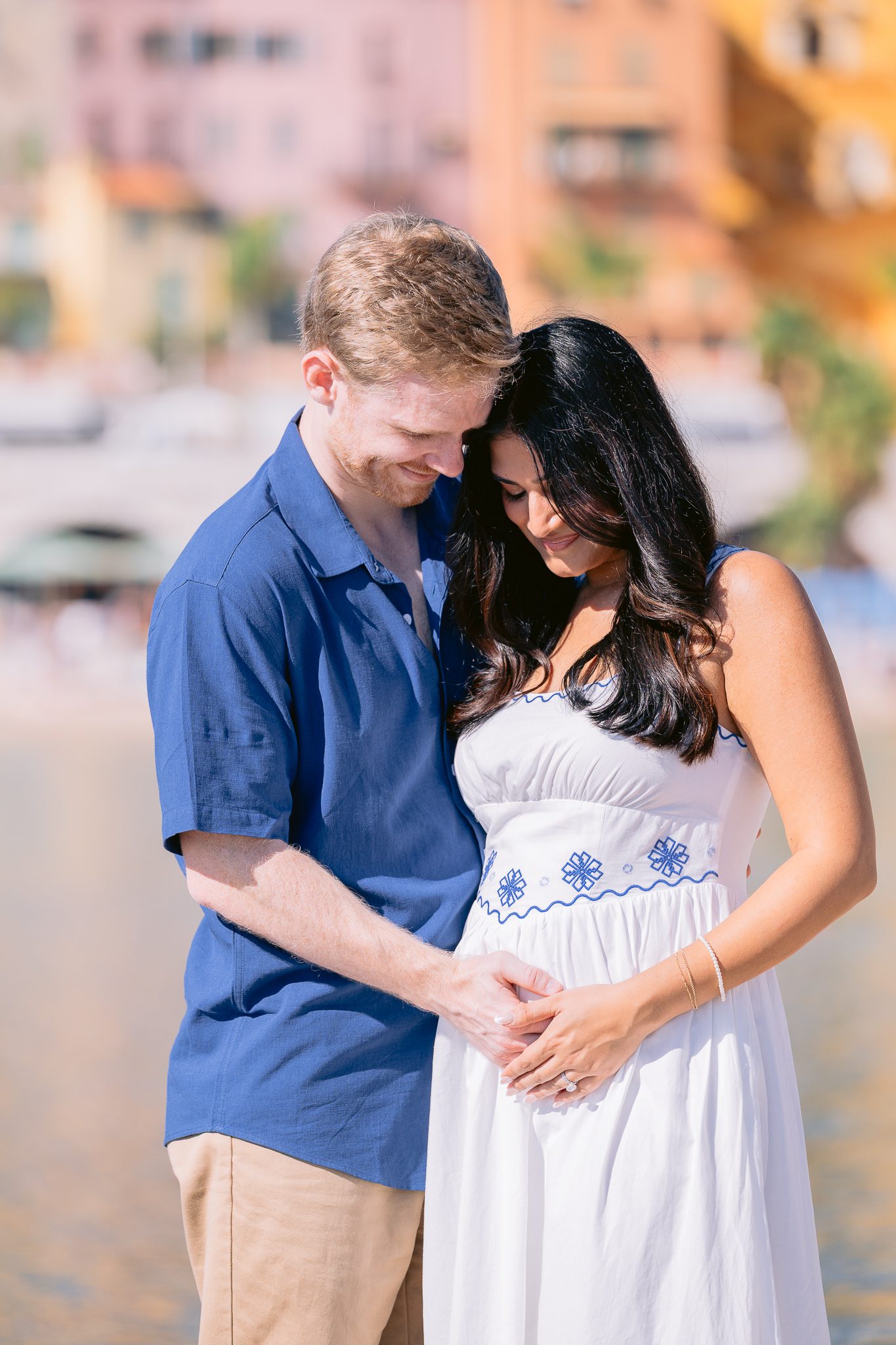 I love this location because it allows you to create different moods within the same perimeter. You can make very clean images facing the water, more iconic portraits with the colorful city in the background, barefoot moments by the sea, and more intimate details with soft, flattering light. For a mother-to-be, this is particularly pleasing, because everything remains fluid.