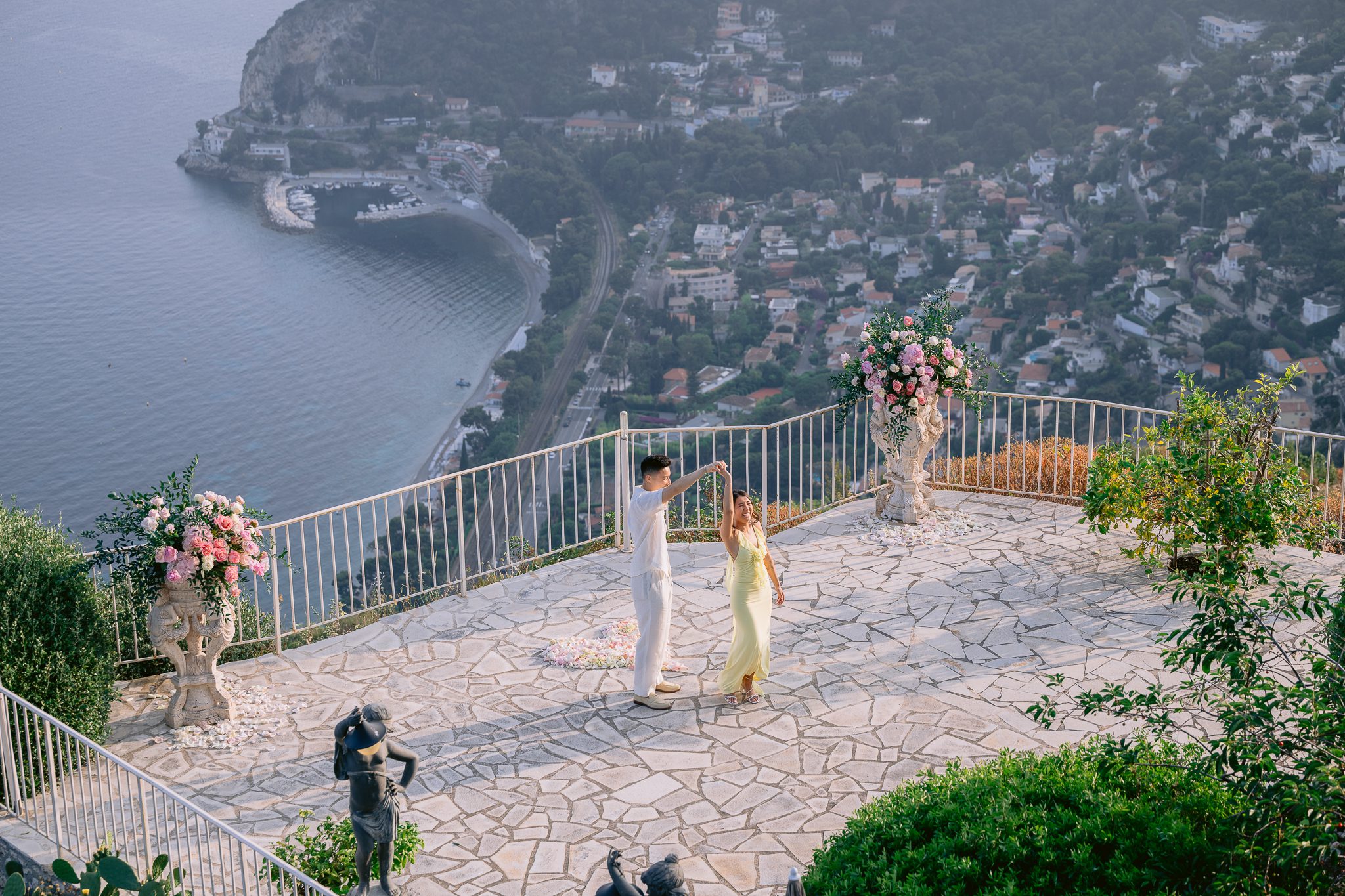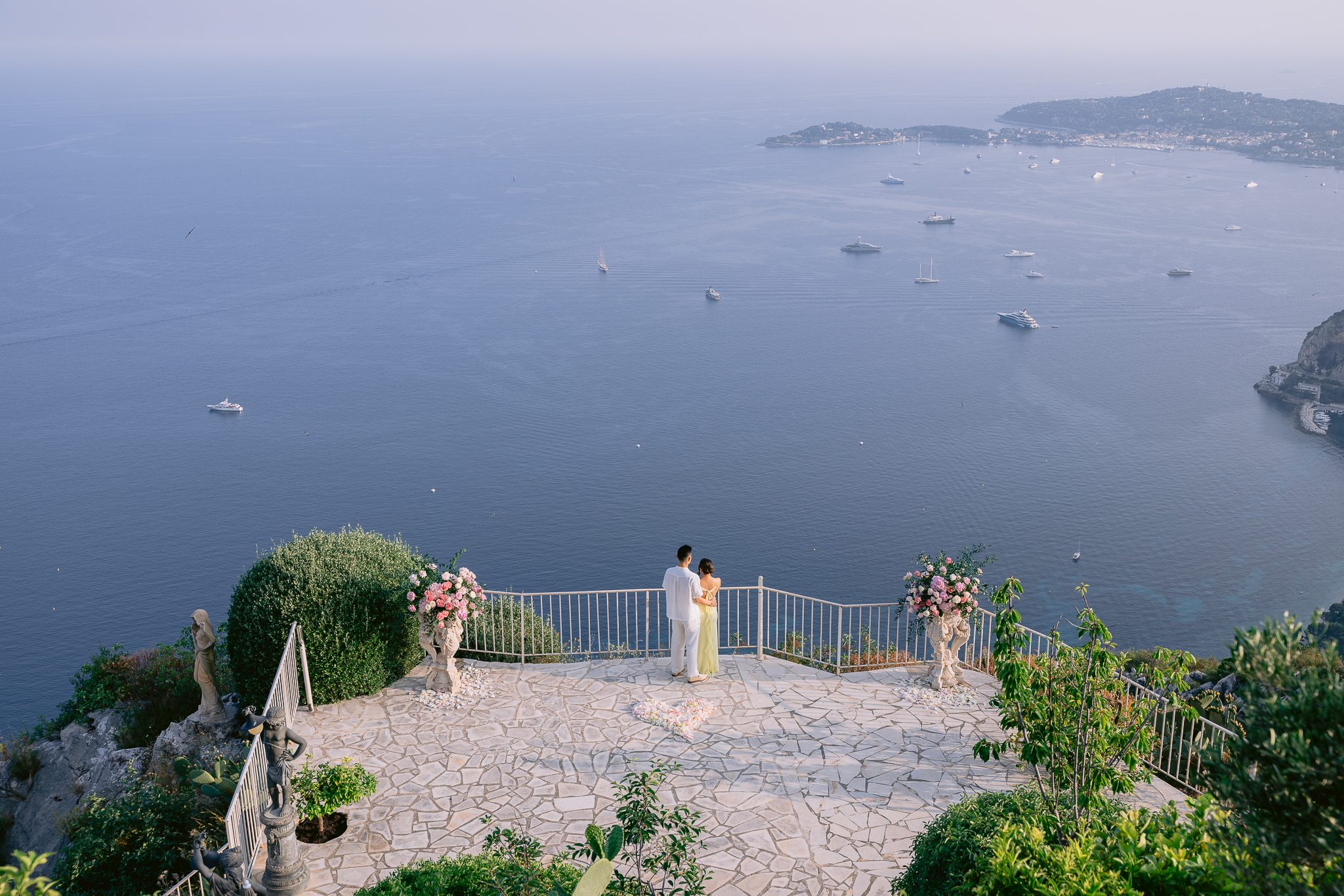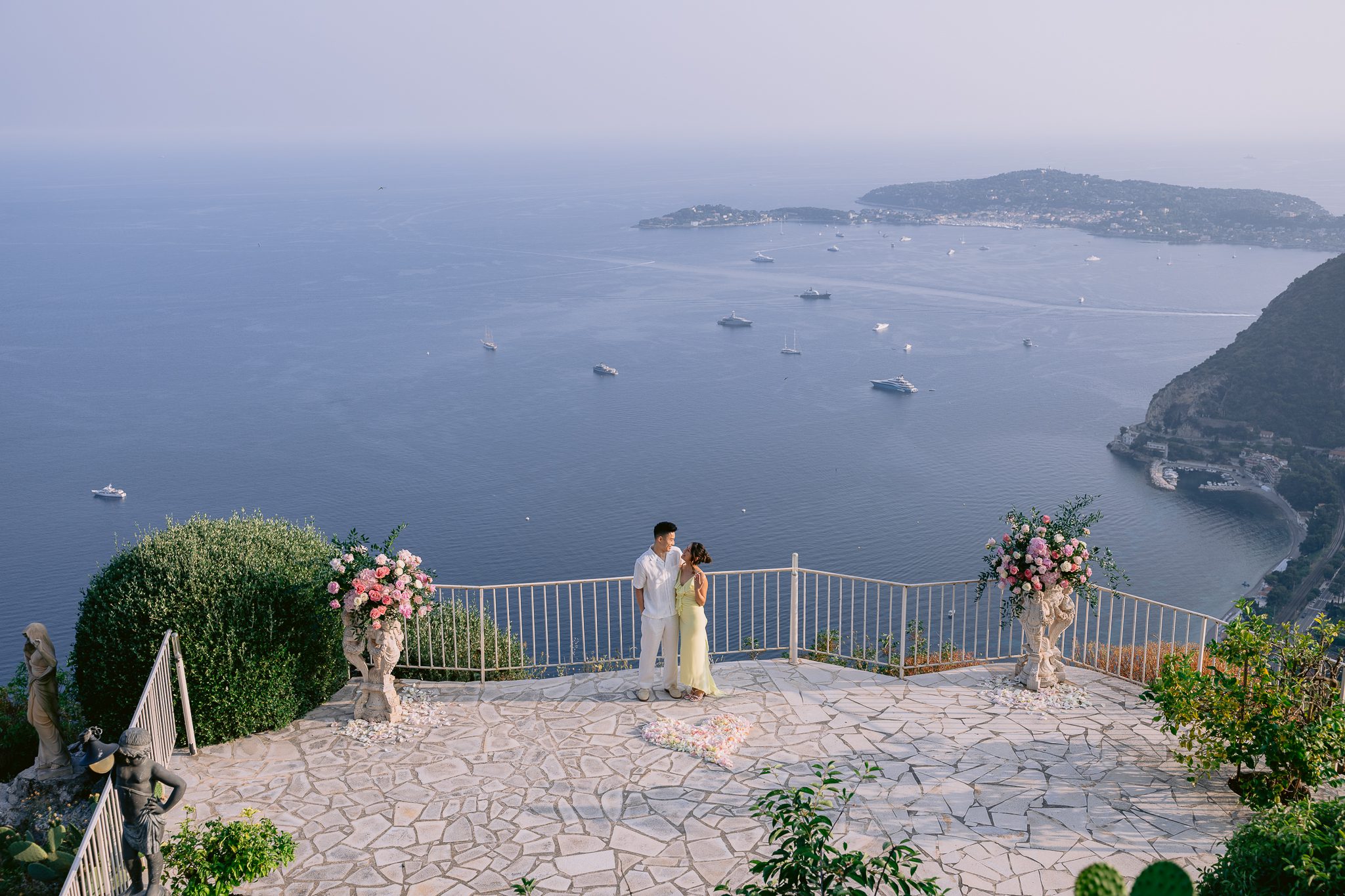 Some wedding proposals are impressive for their location, while others are more impressive for their atmosphere. There was something particularly sweet about this one. The sun was slowly descending, the sea was taking on more tender reflections, the relief around Èze was fading into the light, and in the center of the terrace, a floral heart was discreetly drawing the exact spot where everything was going to play out.