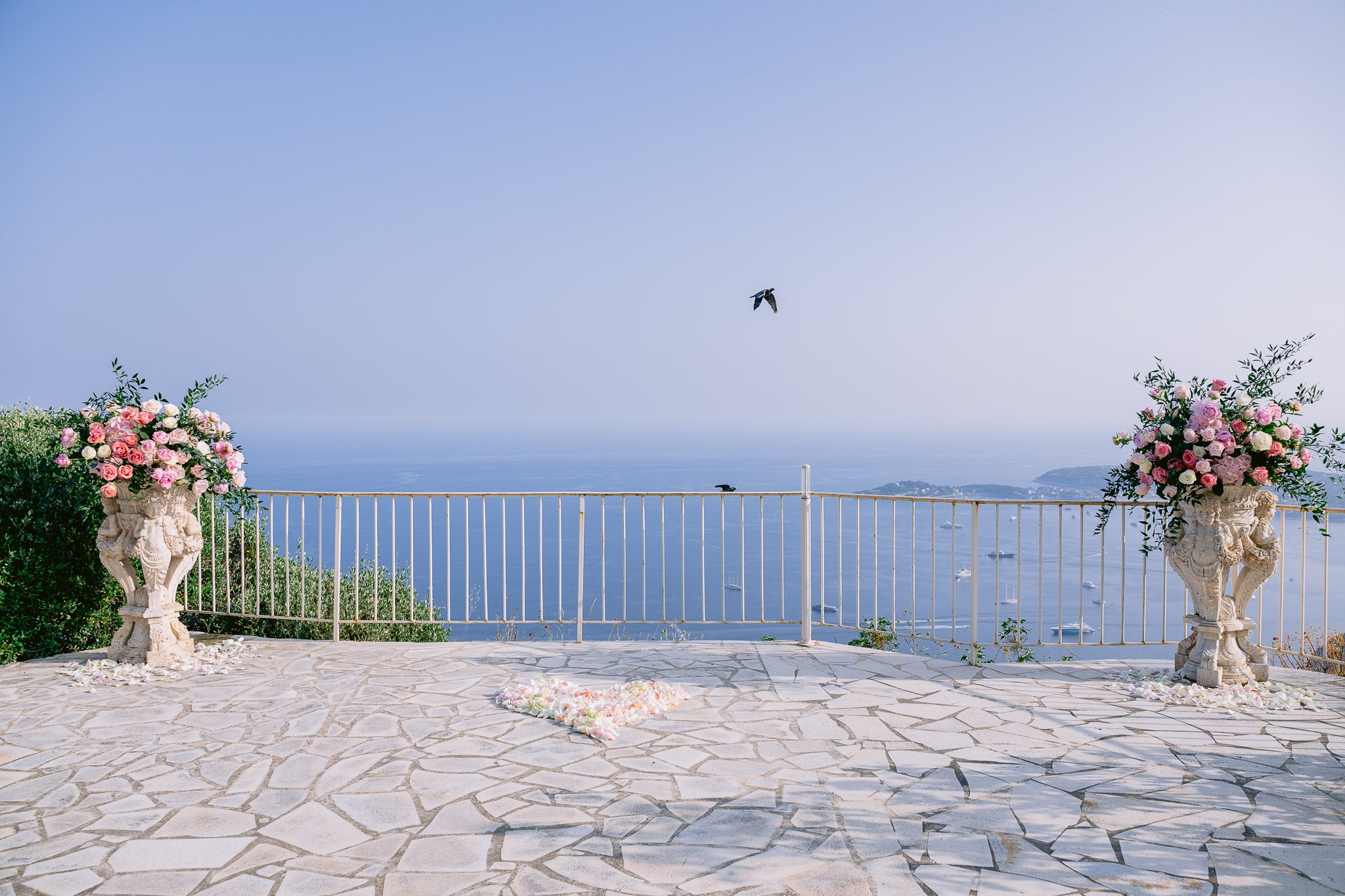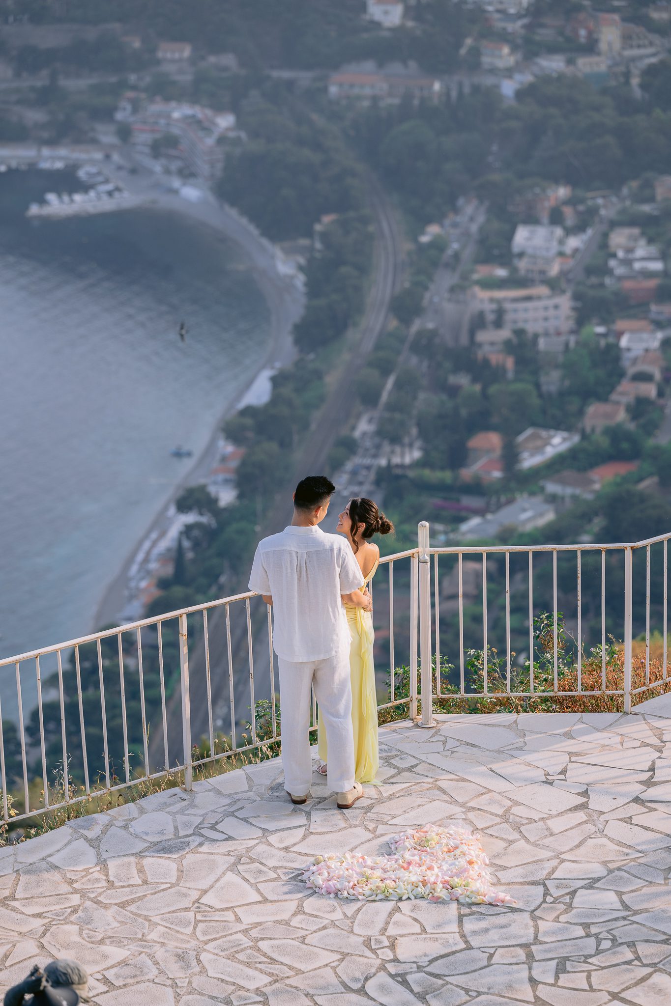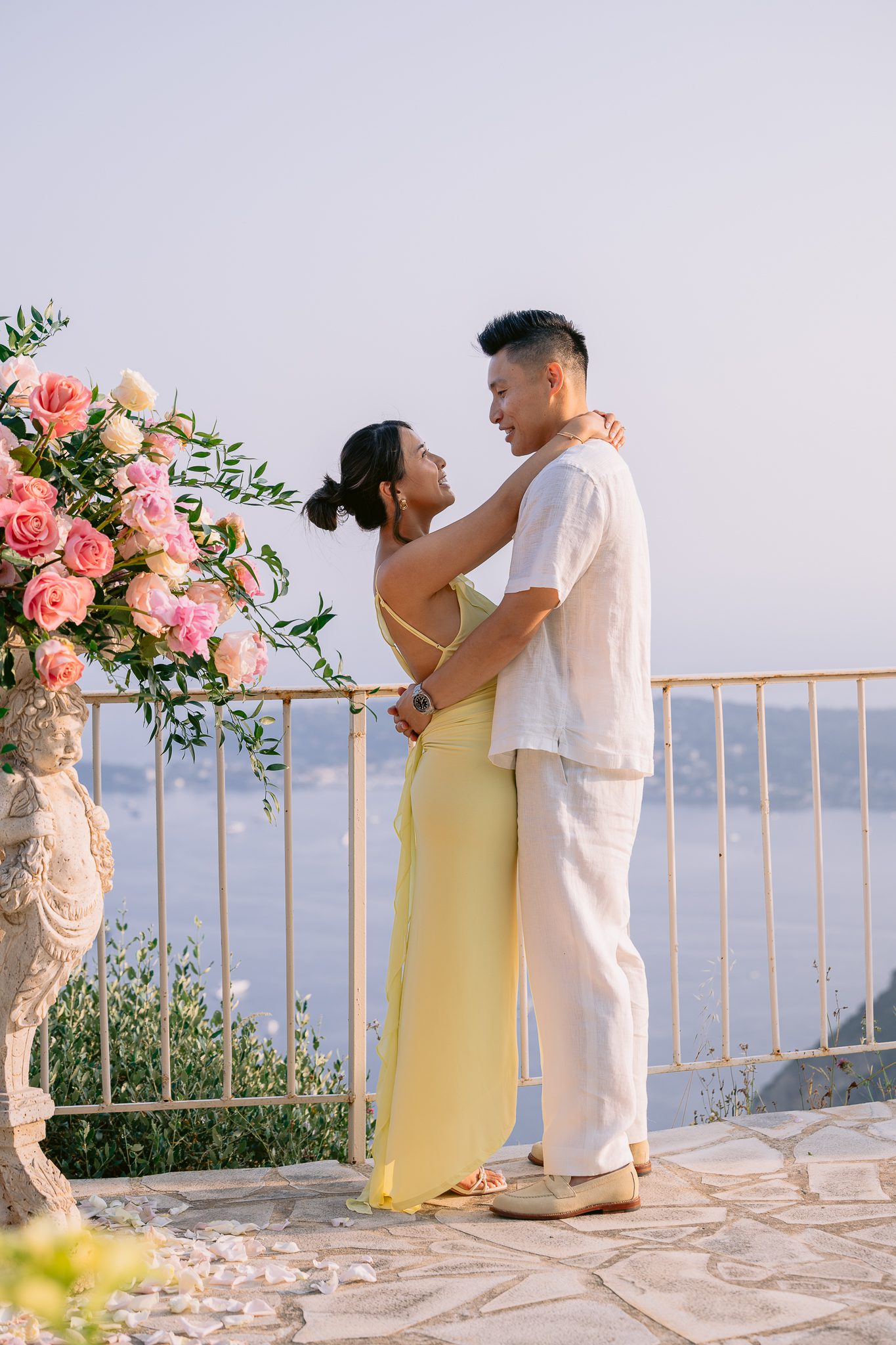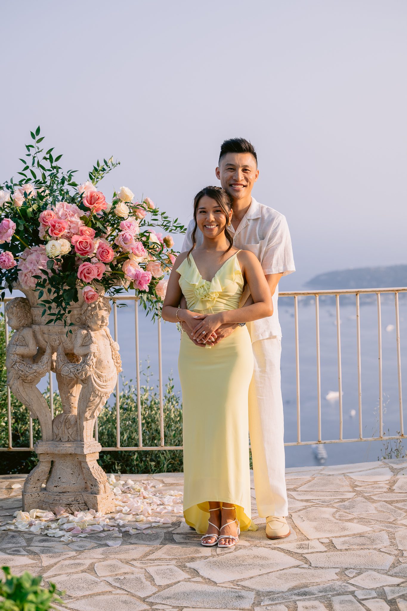 Some wedding proposals are impressive for their location, while others are more impressive for their atmosphere. There was something particularly sweet about this one. The sun was slowly descending, the sea was taking on more tender reflections, the relief around Èze was fading into the light, and in the center of the terrace, a floral heart was discreetly drawing the exact spot where everything was going to play out.