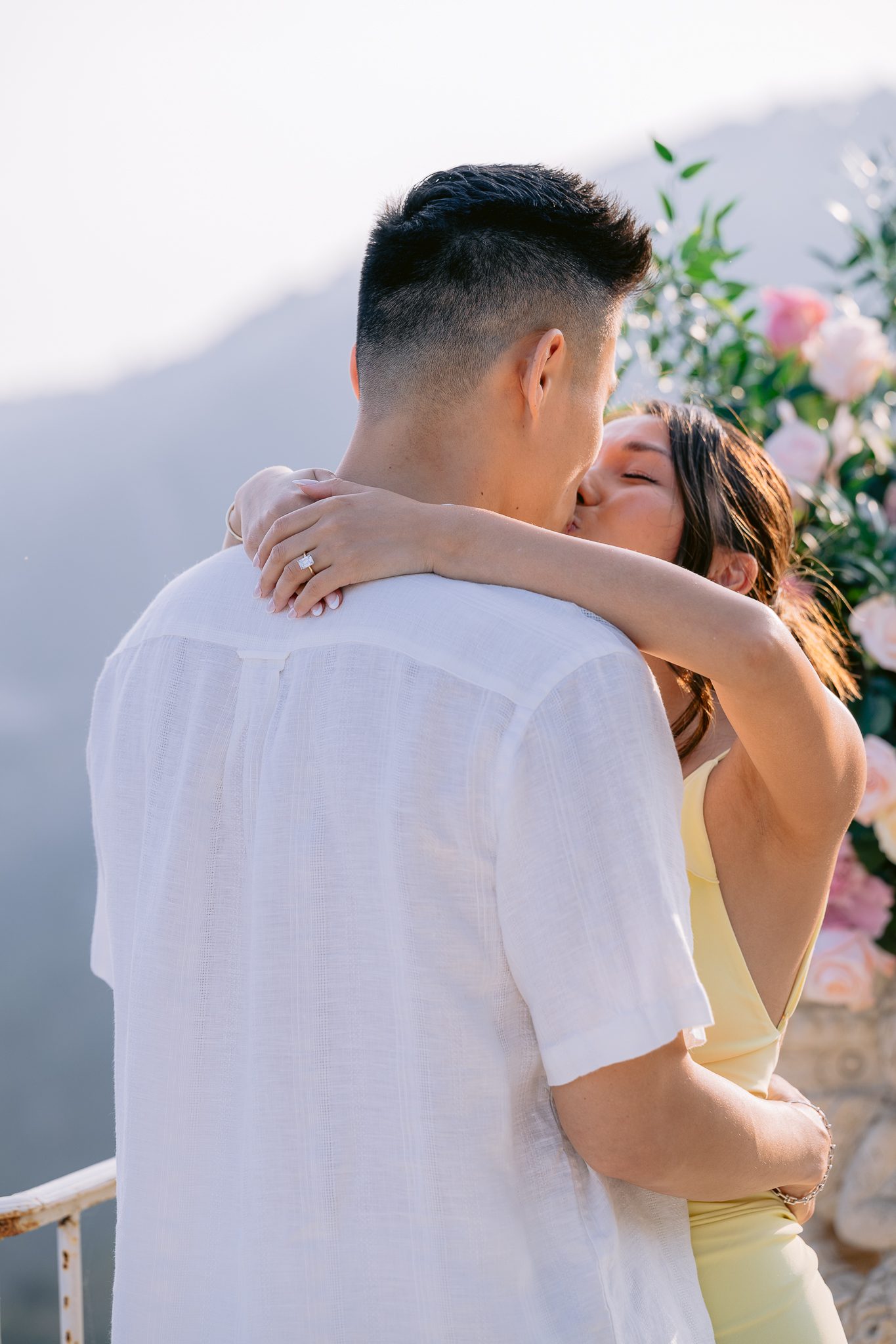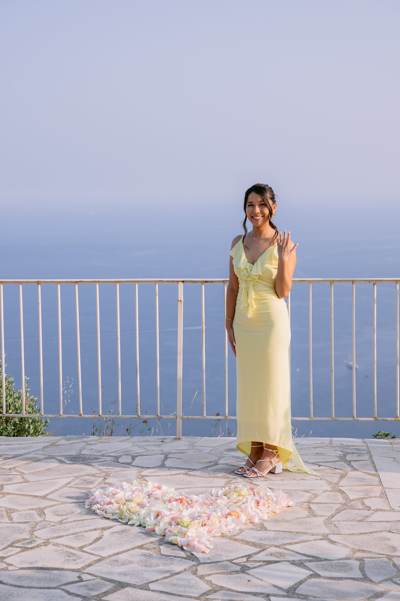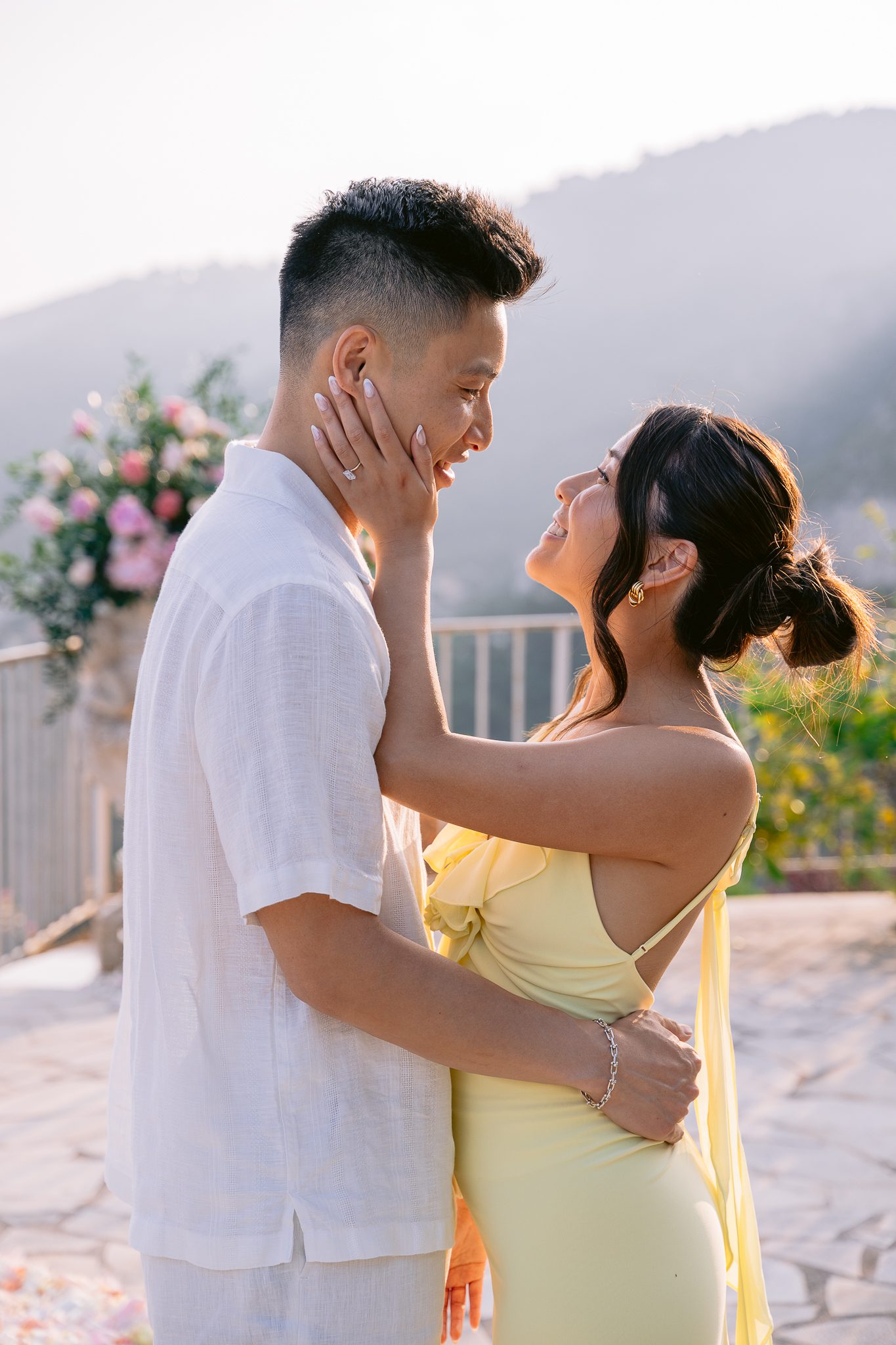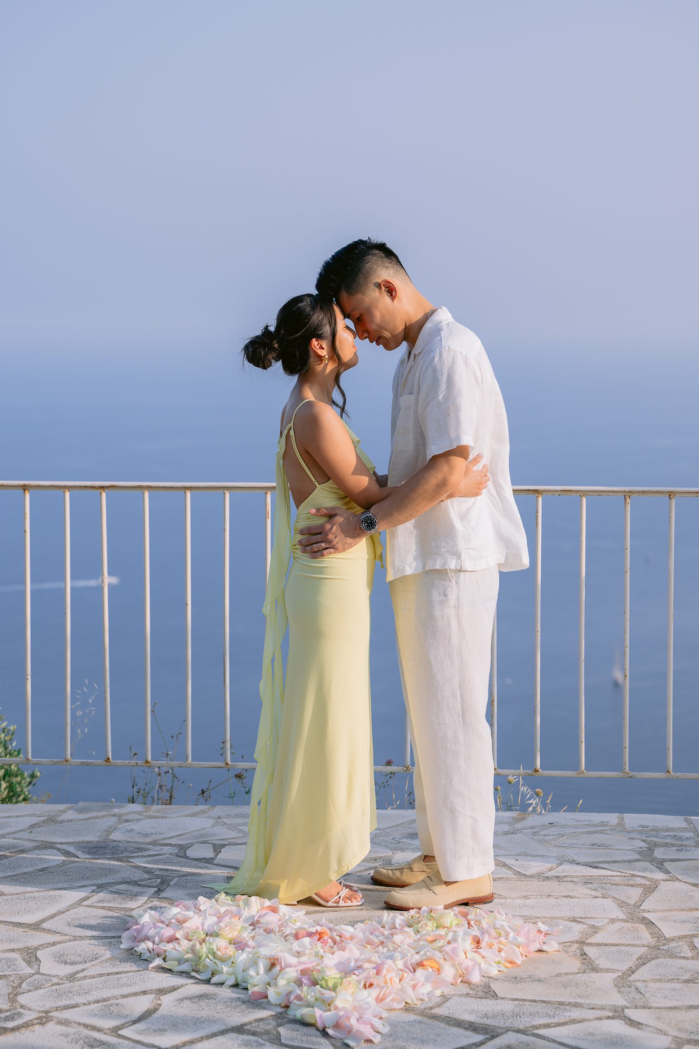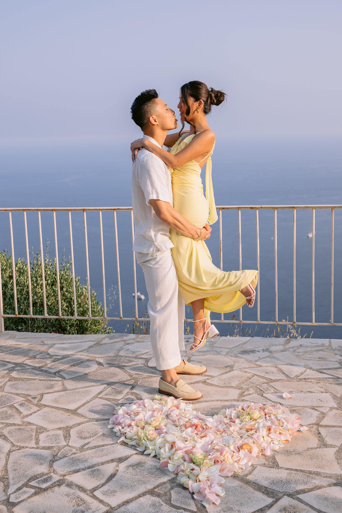 The couple in the center of the terrace, the immense sea behind them, the floral heart at their feet, and this light that made the moment almost unreal. Then the gesture, the ring, the glances, the surprise, the rising emotion, and then this very gentle phase when the couple understand what has just happened.