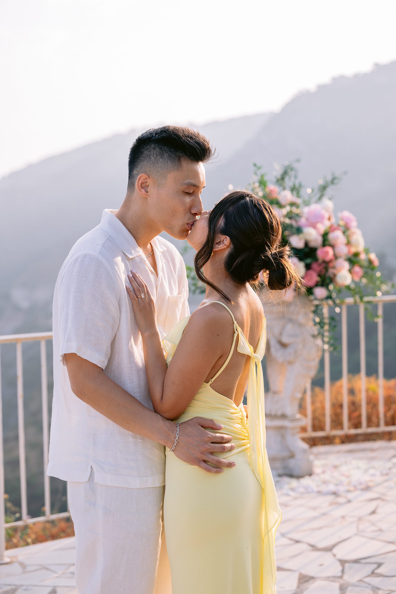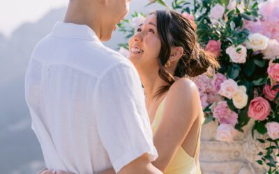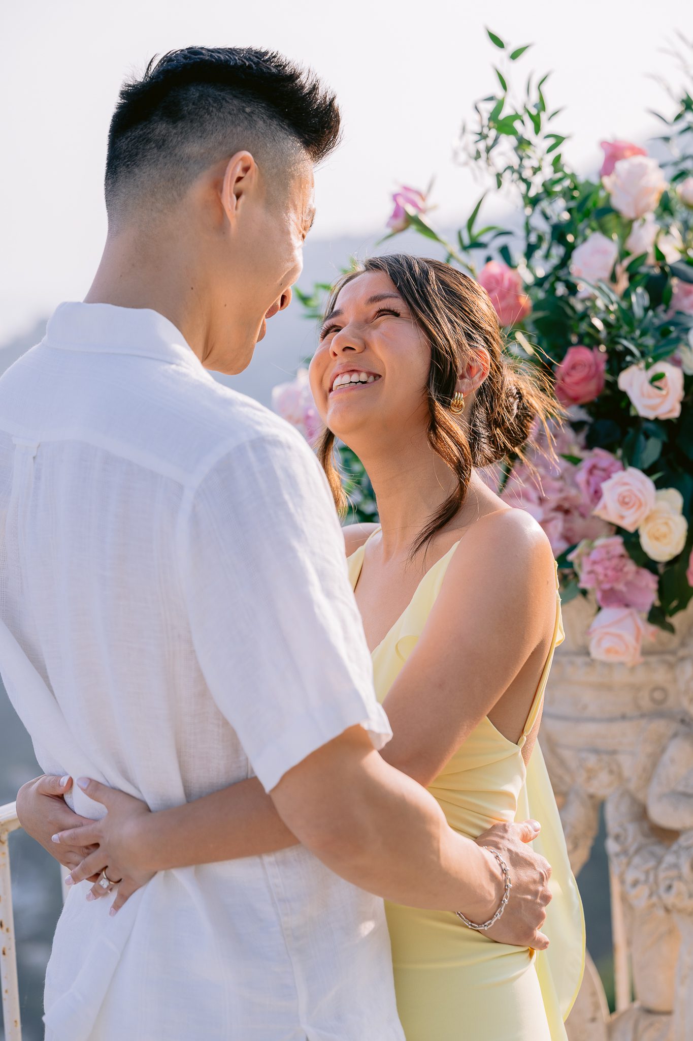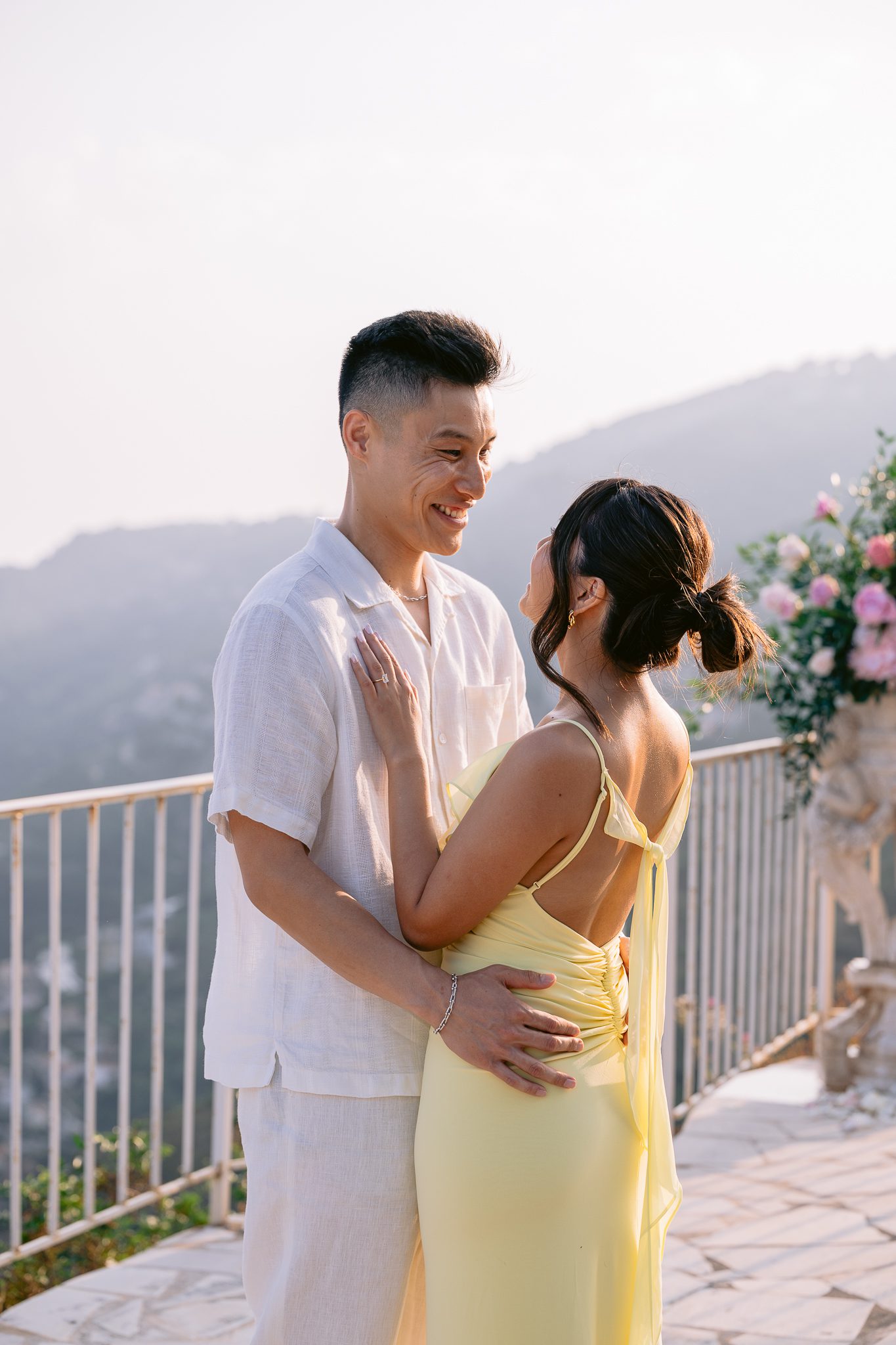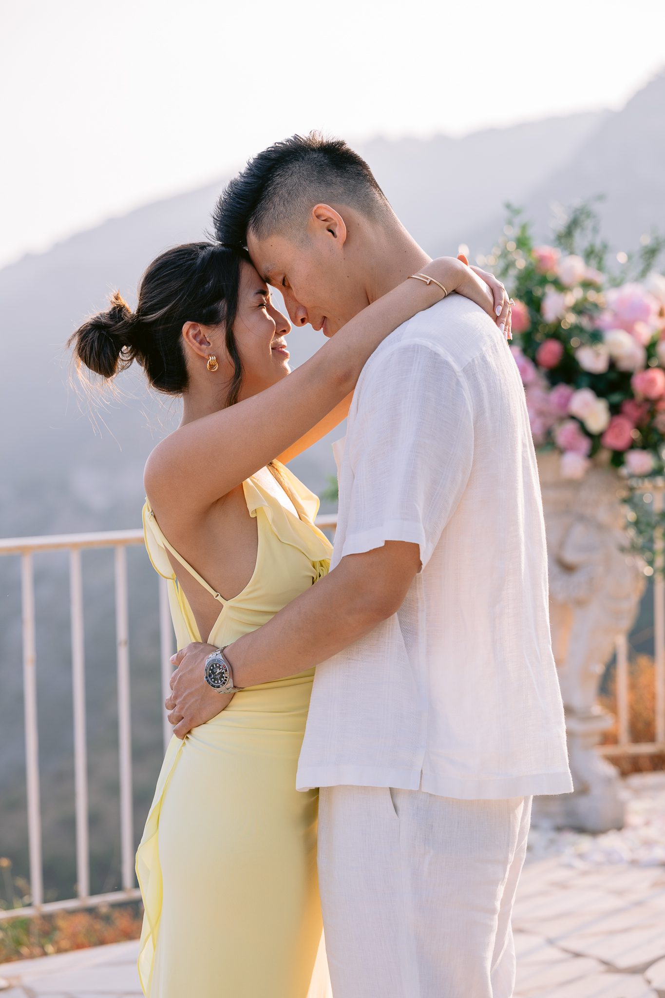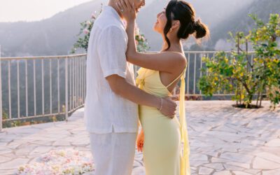 The couple in the center of the terrace, the immense sea behind them, the floral heart at their feet, and this light that made the moment almost unreal. Then the gesture, the ring, the glances, the surprise, the rising emotion, and then this very gentle phase when the couple understand what has just happened.