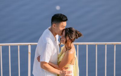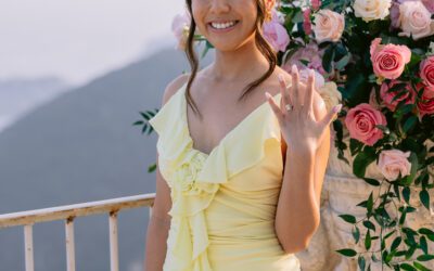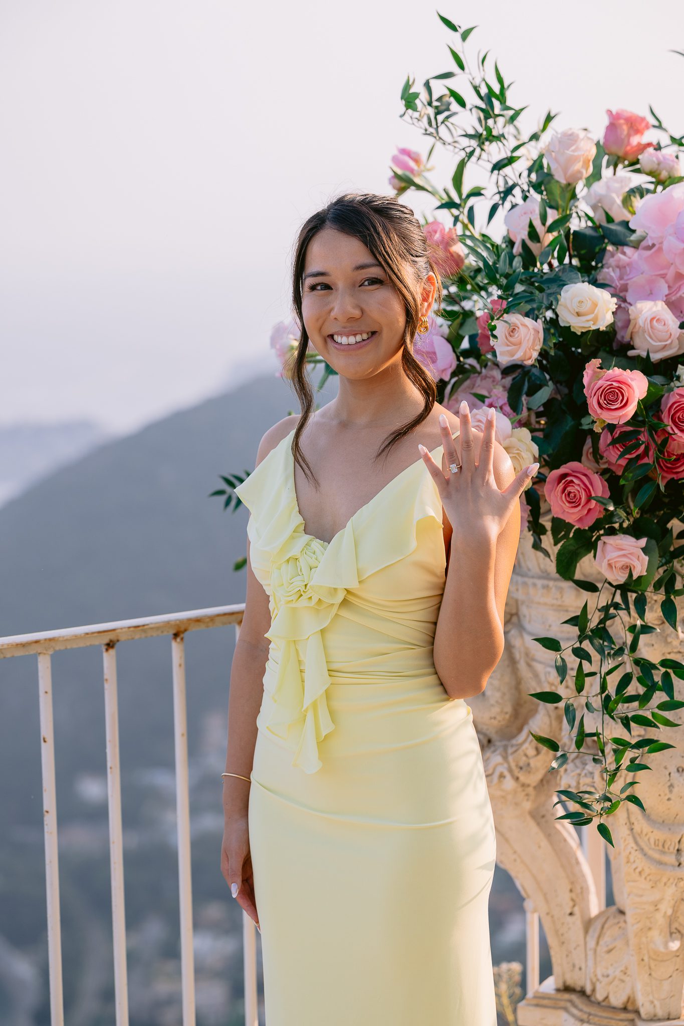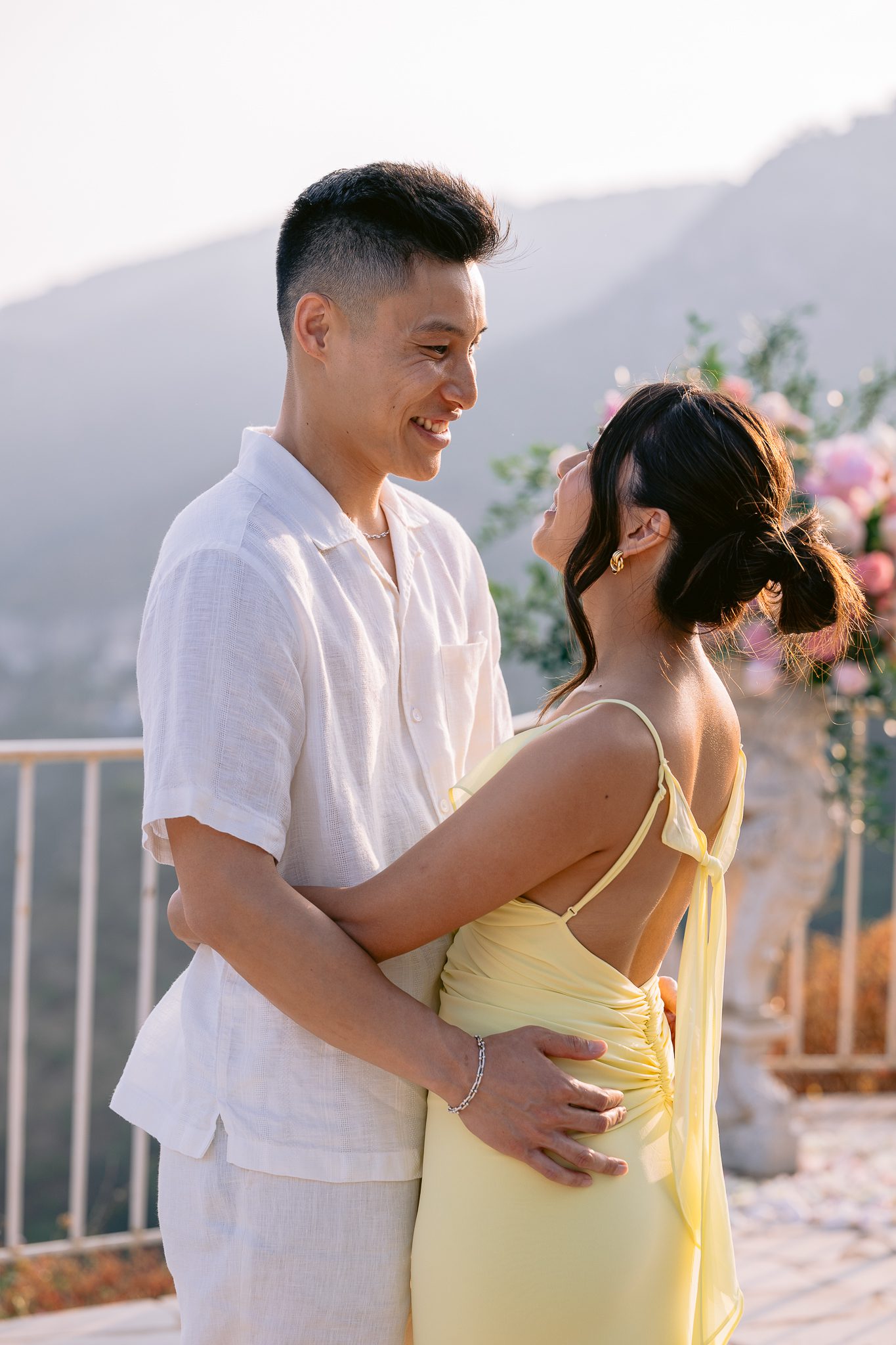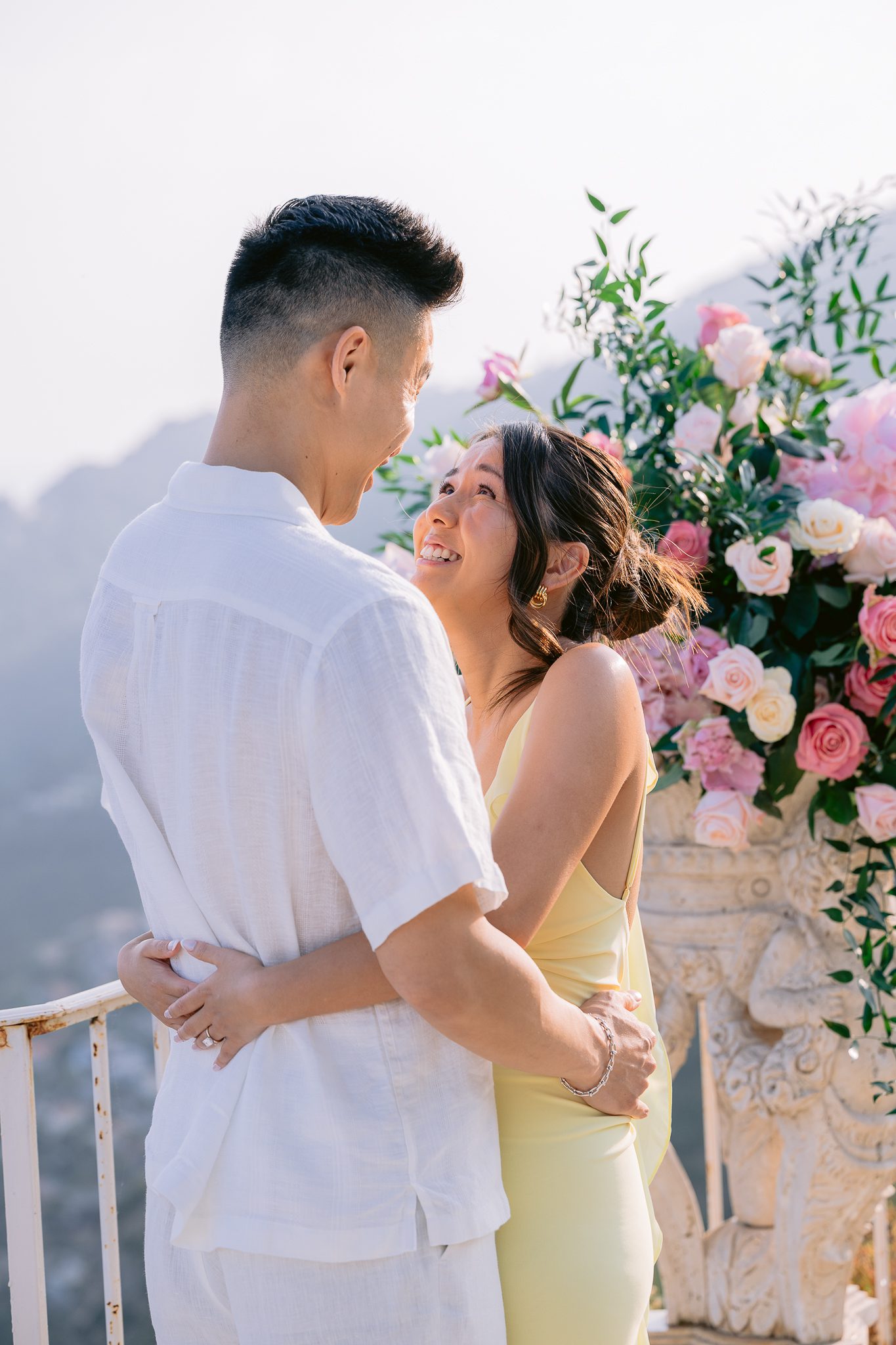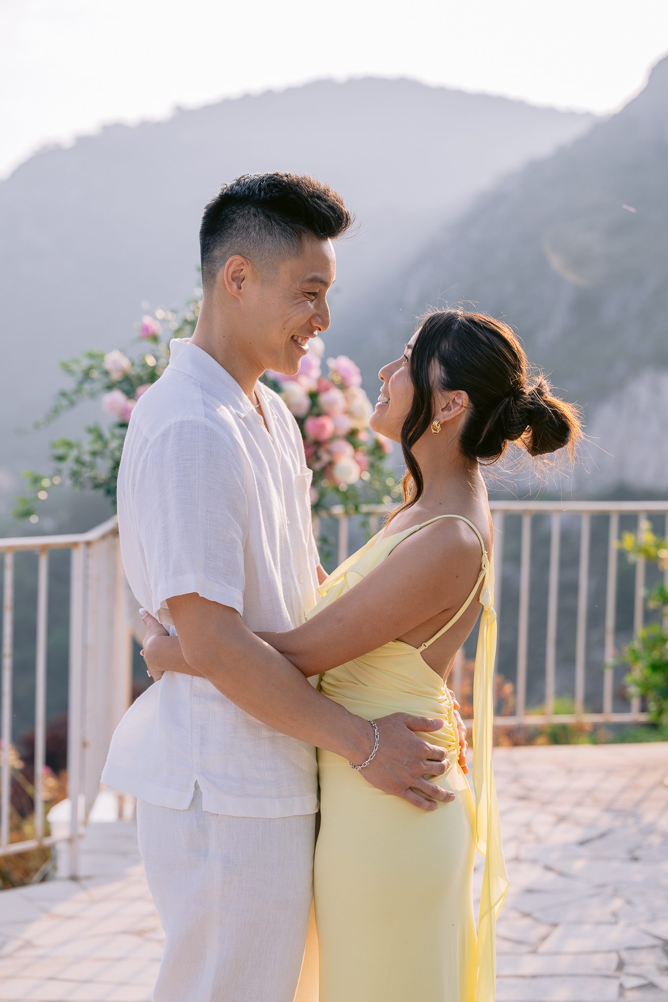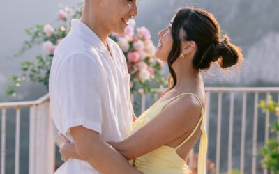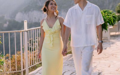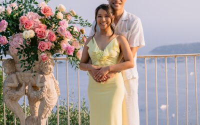 The couple in the center of the terrace, the immense sea behind them, the floral heart at their feet, and this light that made the moment almost unreal. Then the gesture, the ring, the glances, the surprise, the rising emotion, and then this very gentle phase when the couple understand what has just happened.