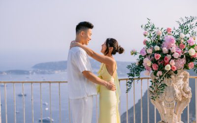Discover this wedding proposal at the Dôme de La Chèvre d'Or in Èze, with panoramic sea views, romantic decor and couple photos in one of the most spectacular locations on the Côte d'Azur.