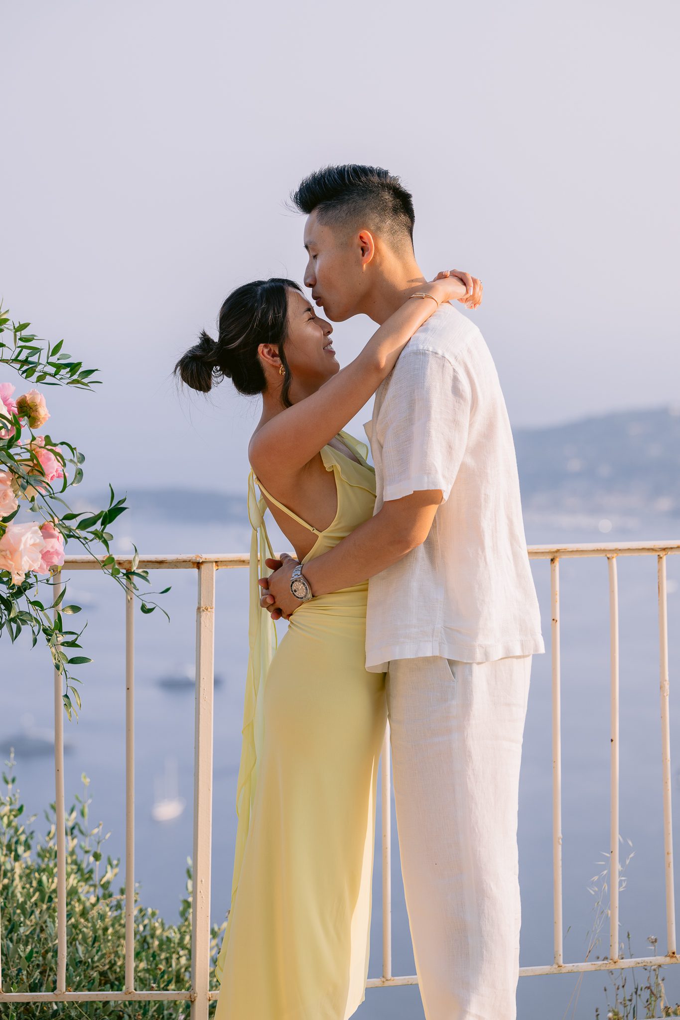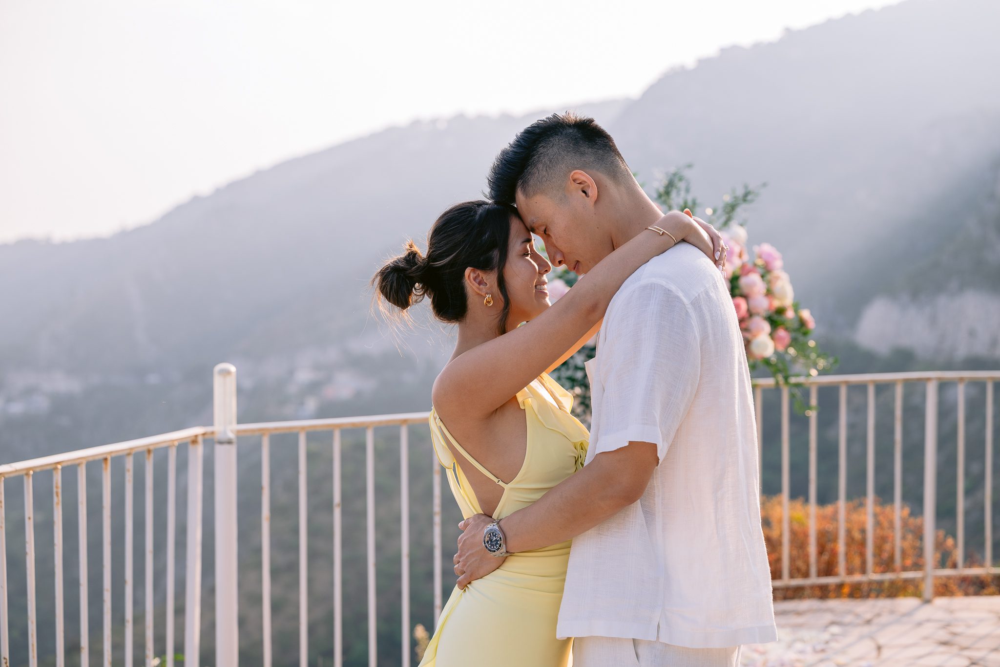 Discover this wedding proposal at Plateau de la Rose in La Chèvre d'Or, Èze, with sunset, floral bouquet and soft Mediterranean light.