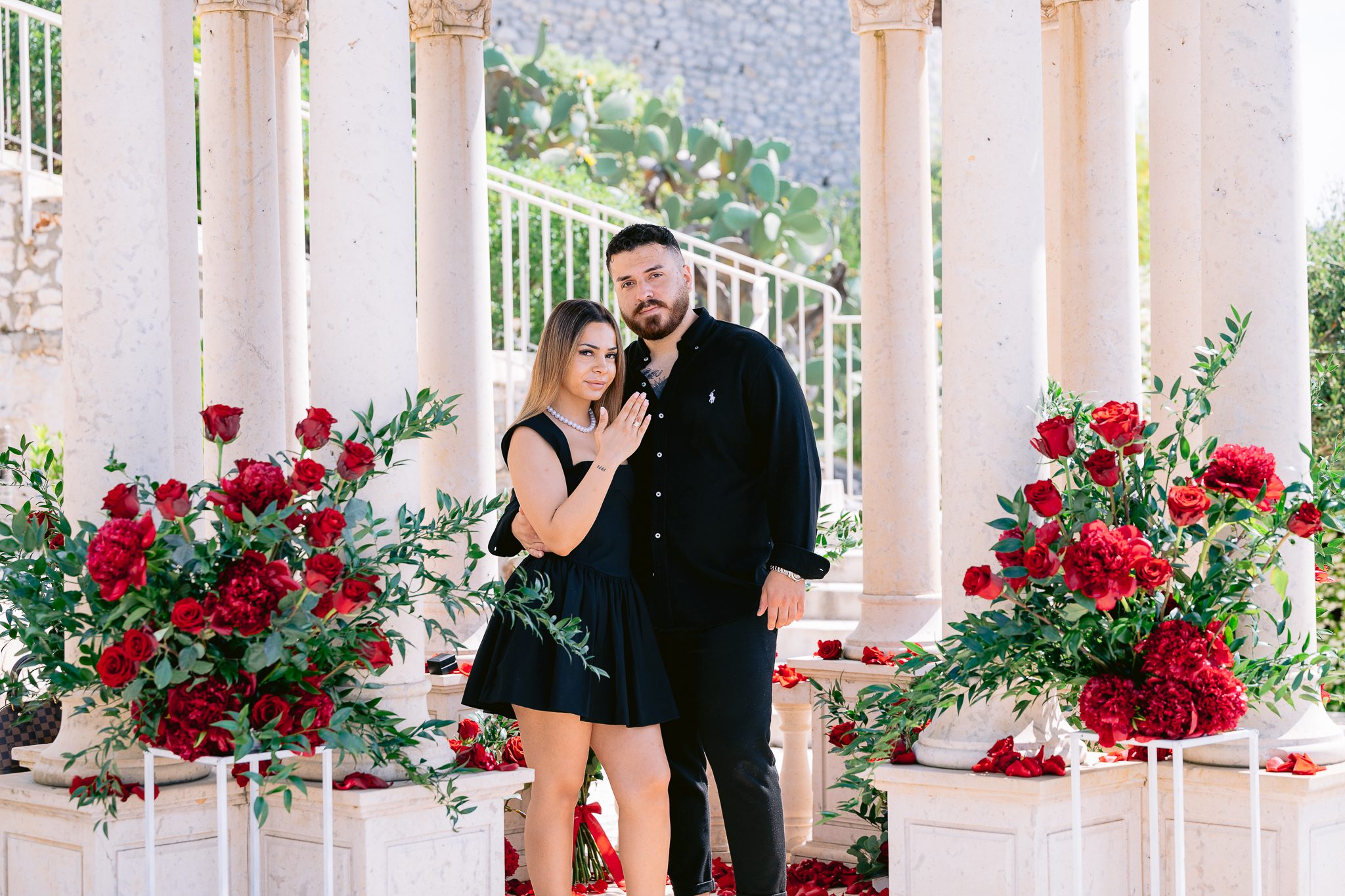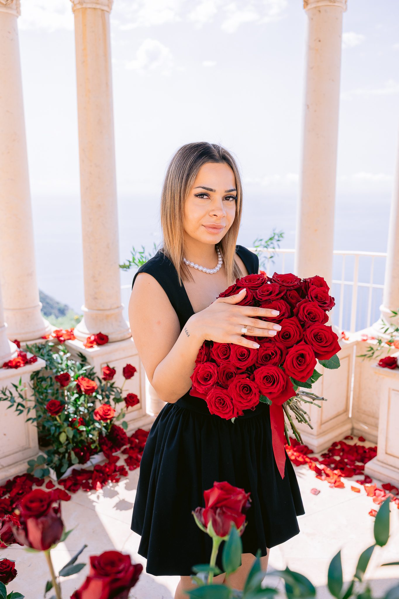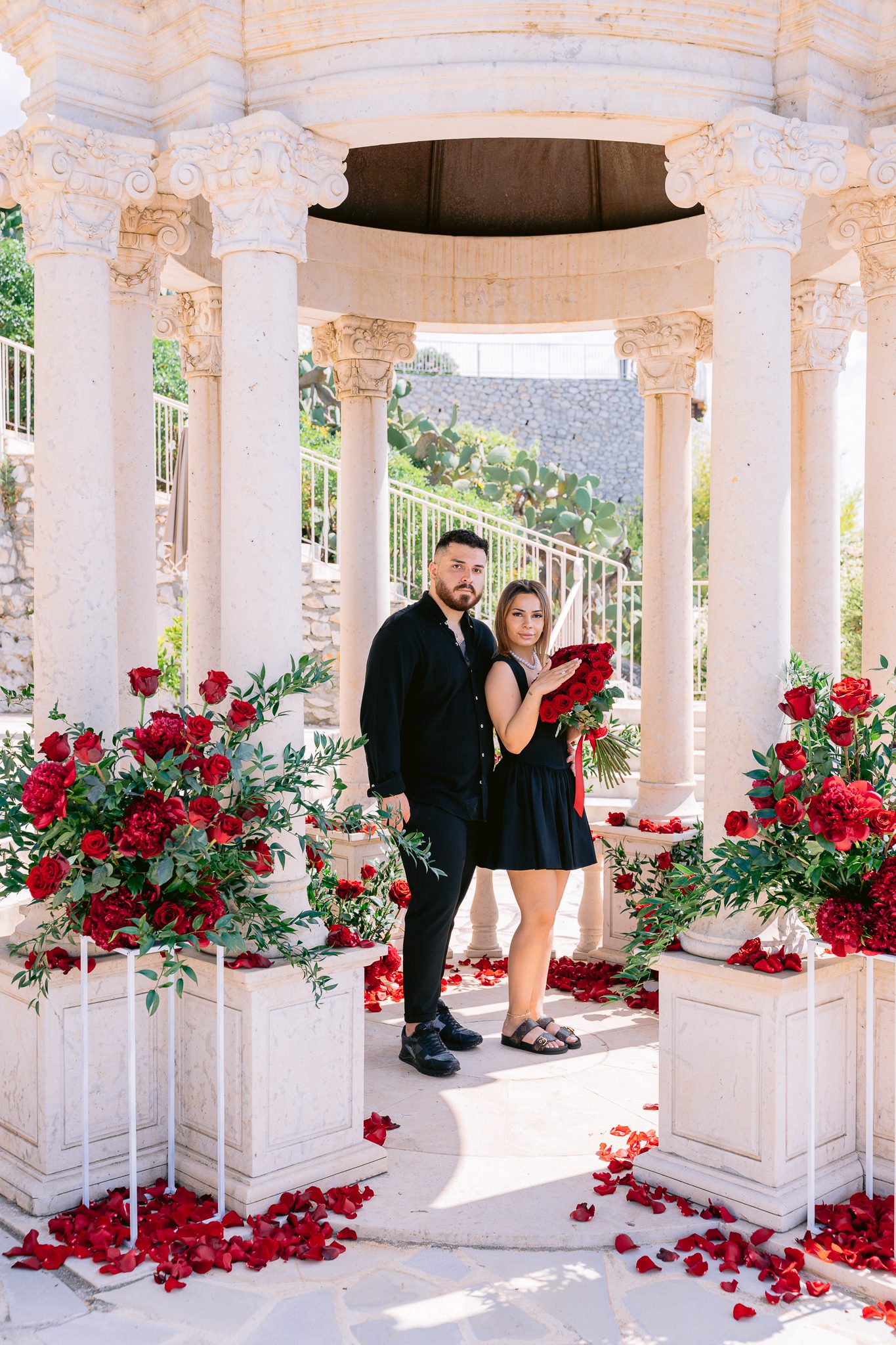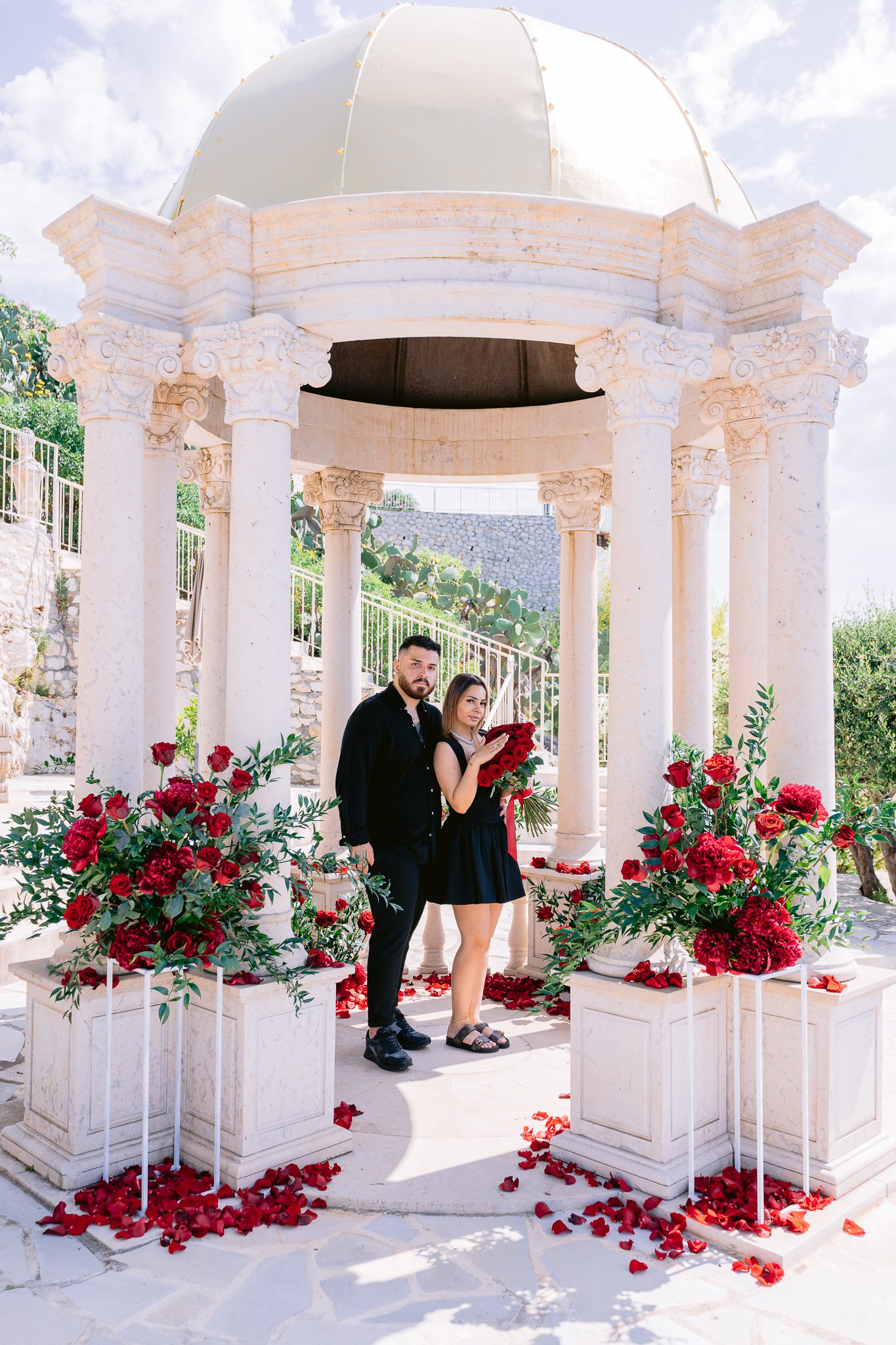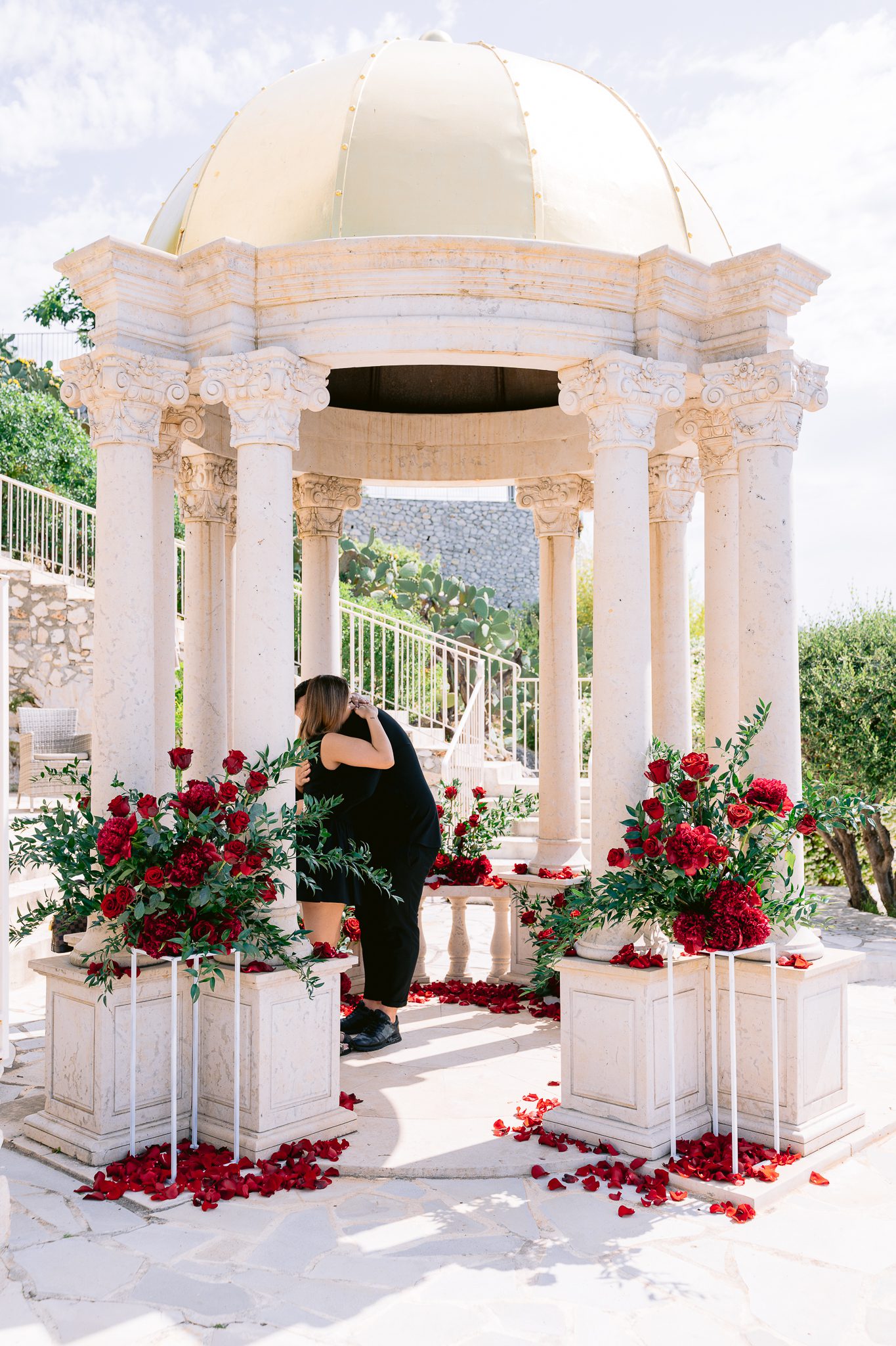 Discover this marriage proposal at the Dôme de La Chèvre d'Or during the day, with sea views, red roses and an elegant, natural and luminous ambience in Èze.