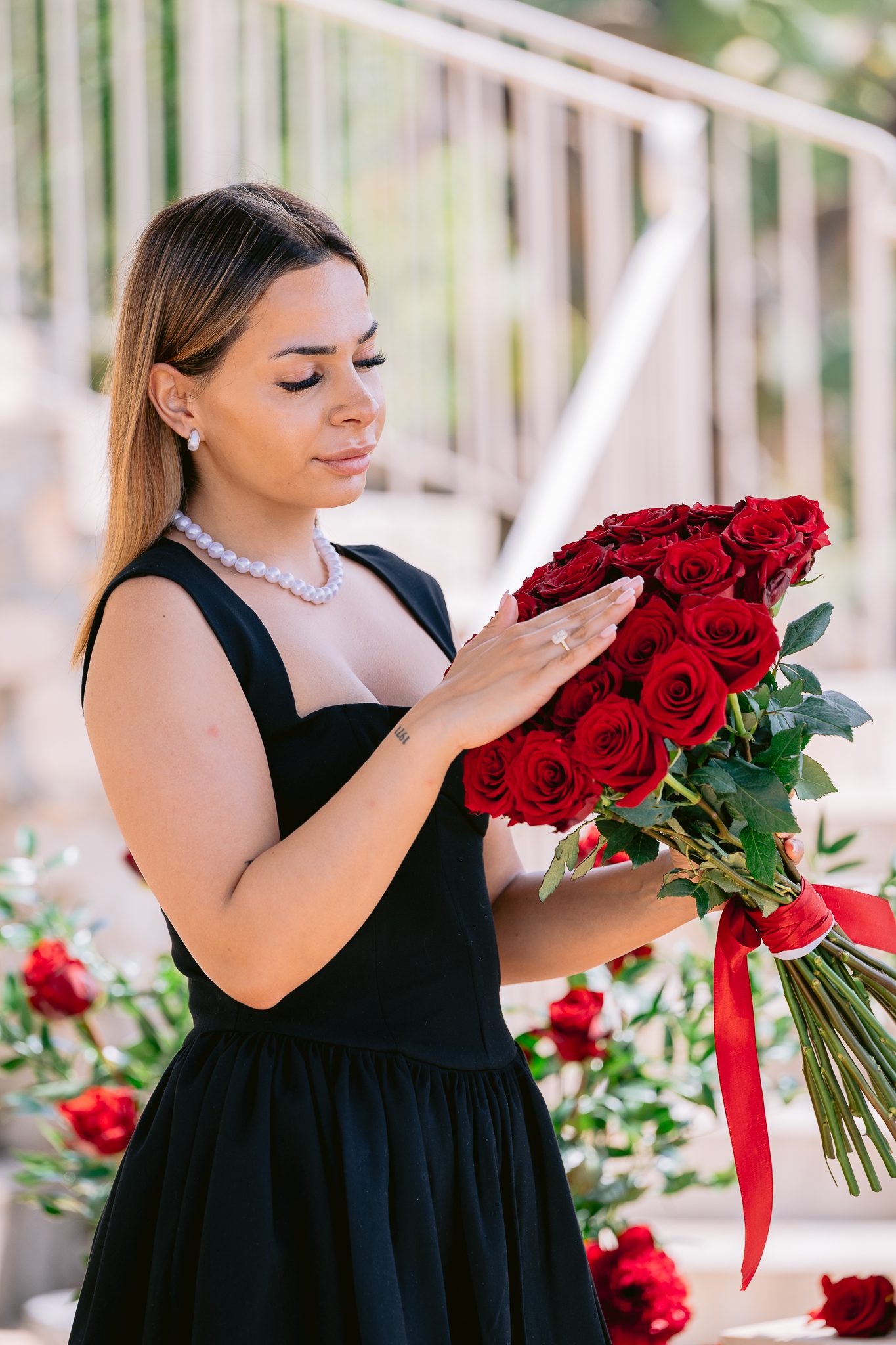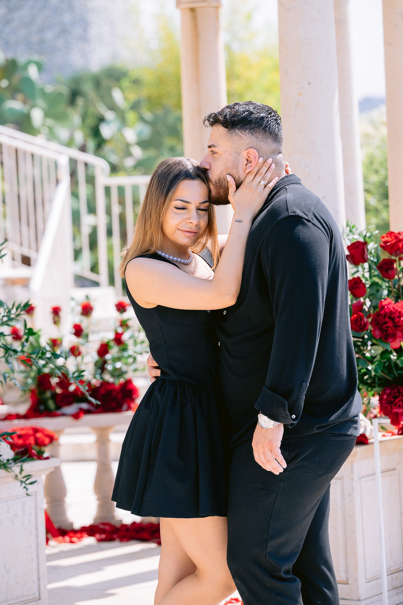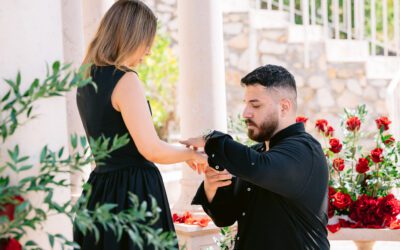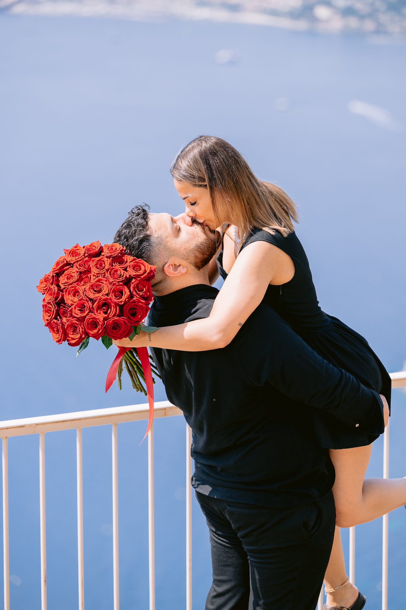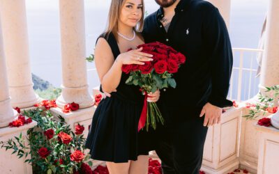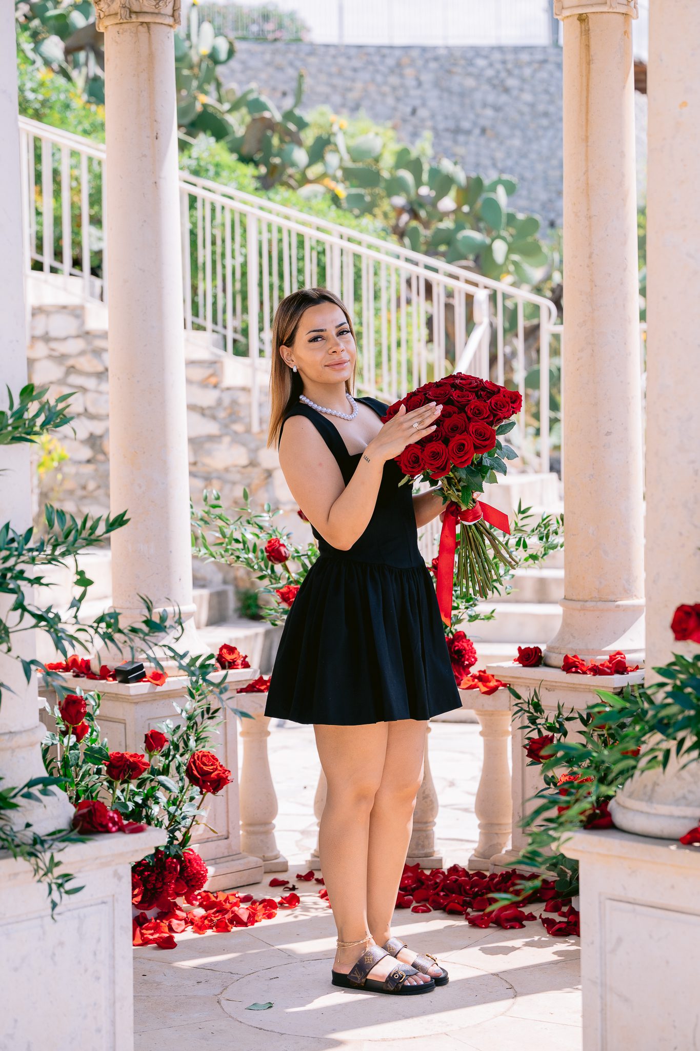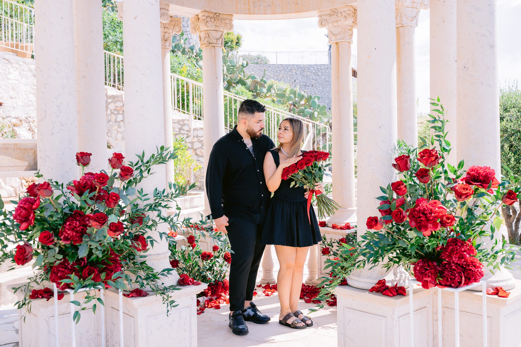 Discover this marriage proposal at the Dôme de La Chèvre d'Or during the day, with sea views, red roses and an elegant, natural and luminous ambience in Èze.