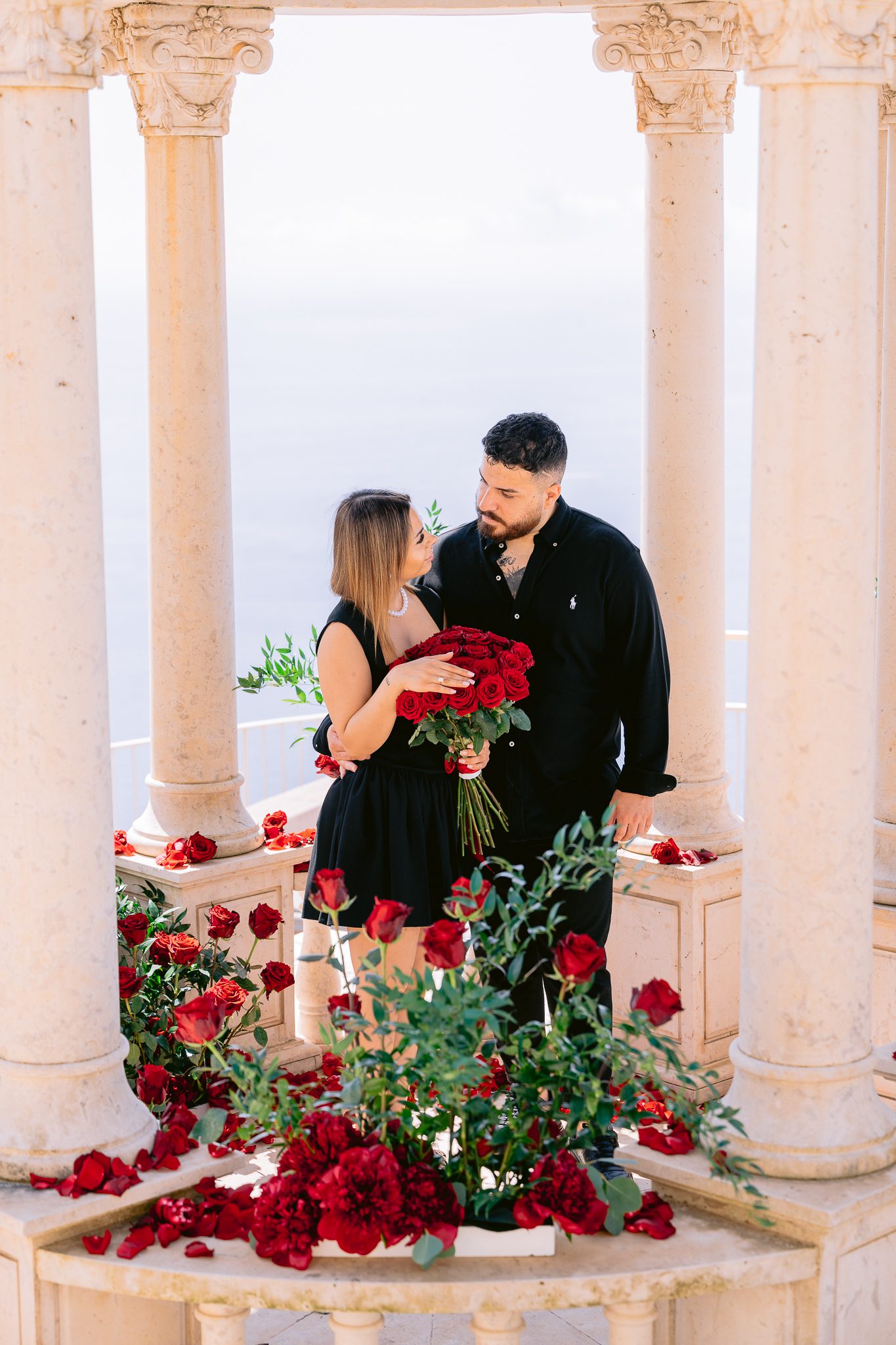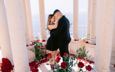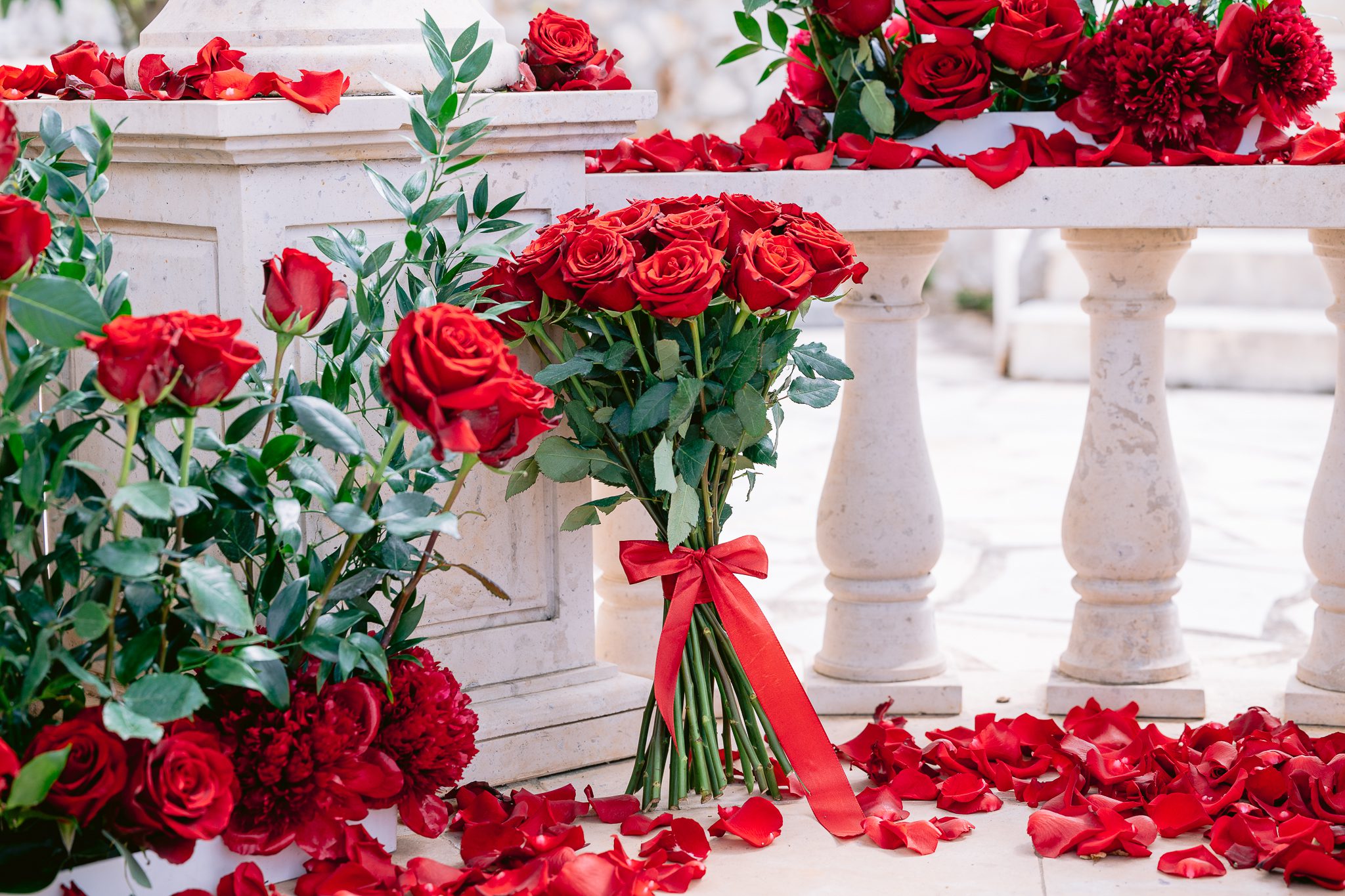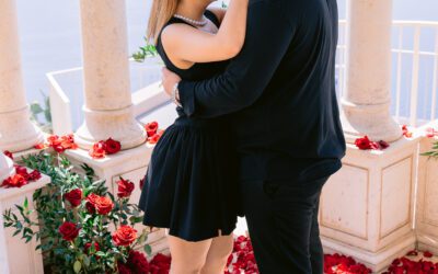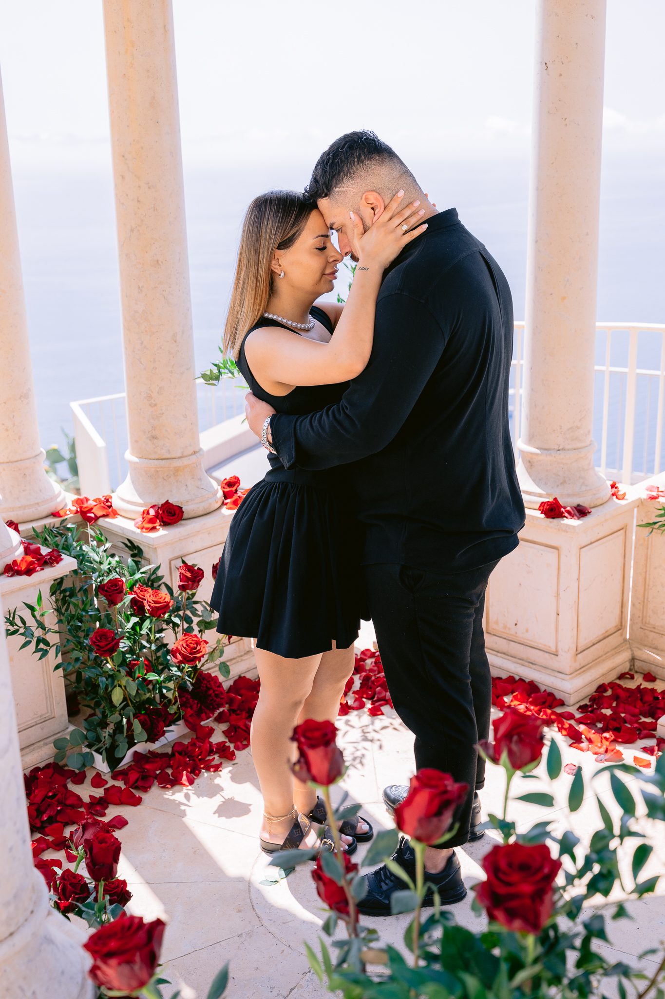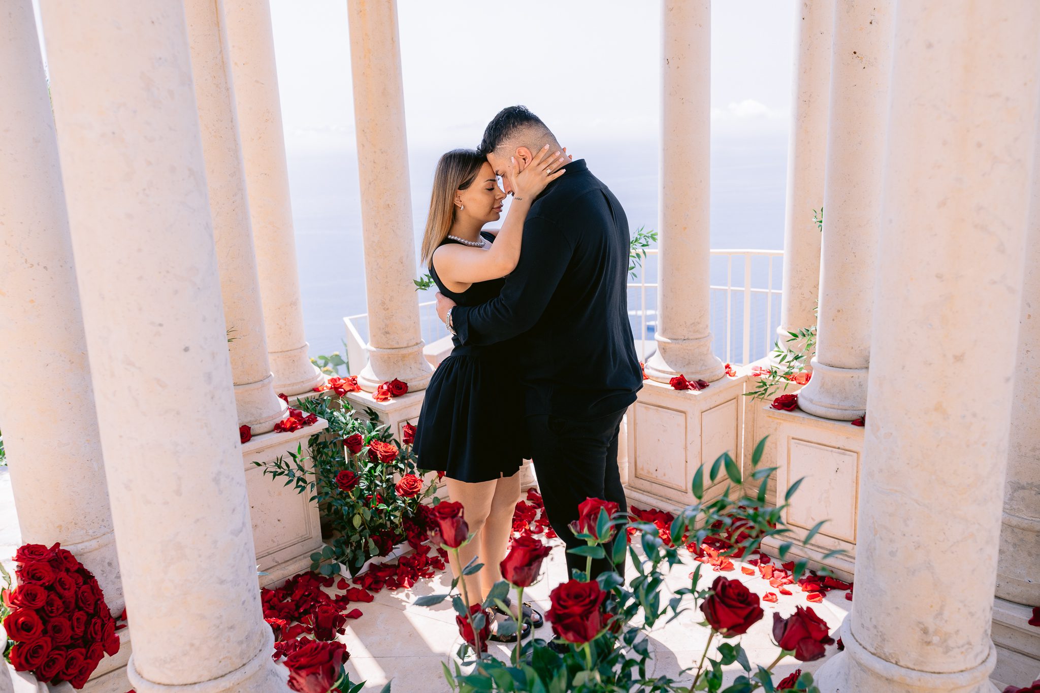 Discover this marriage proposal at the Dôme de La Chèvre d'Or in Èze, with bouquets of red roses, candles, petals and floral decorations in a spectacular setting.