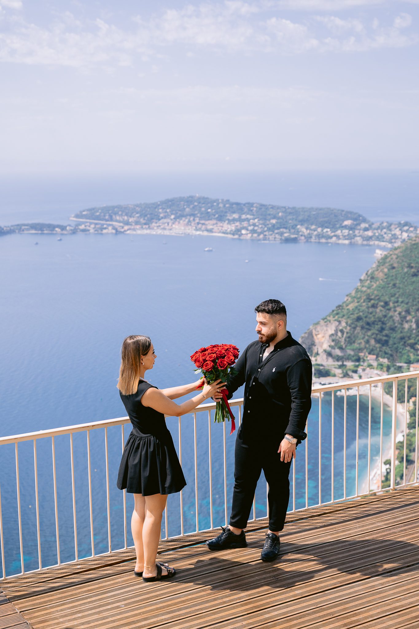 Discover this wedding proposal at Plateau de la Rose at La Chèvre d'Or in Èze, with spectacular sea views, red roses and a romantic ambience.
