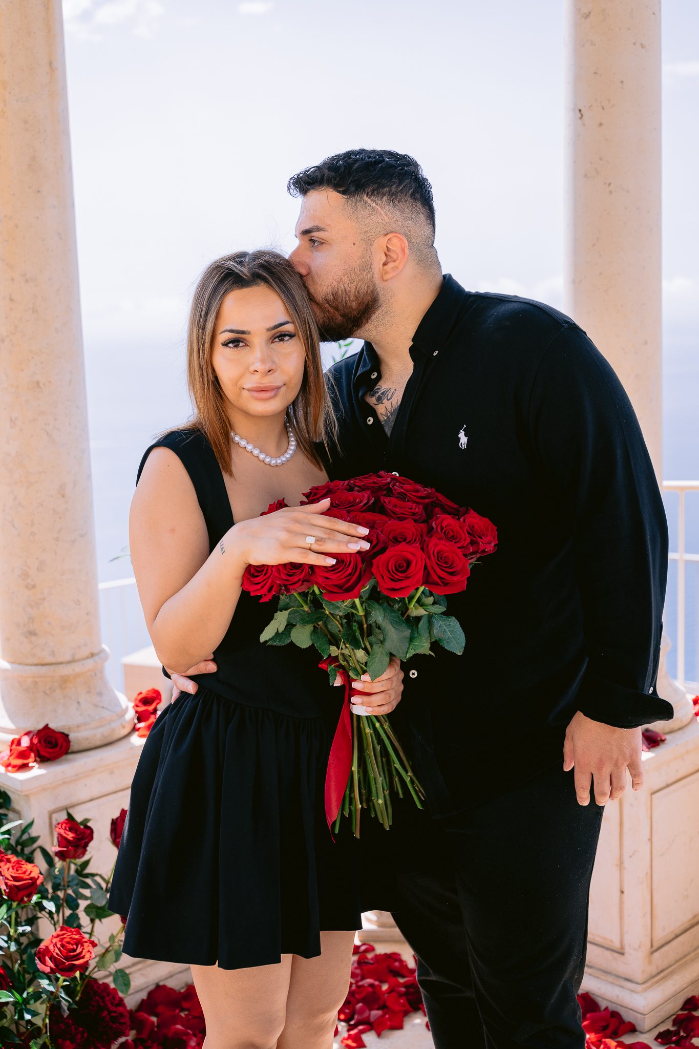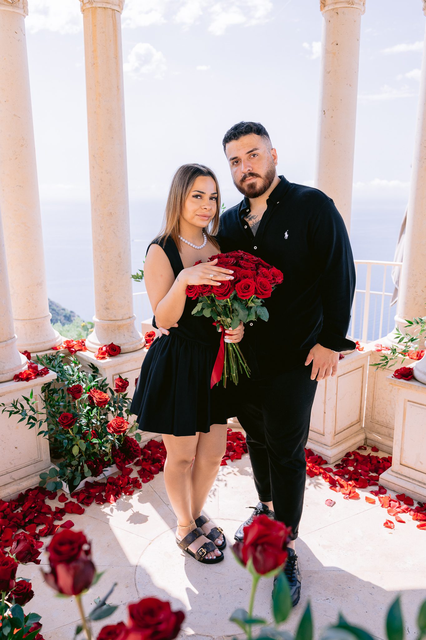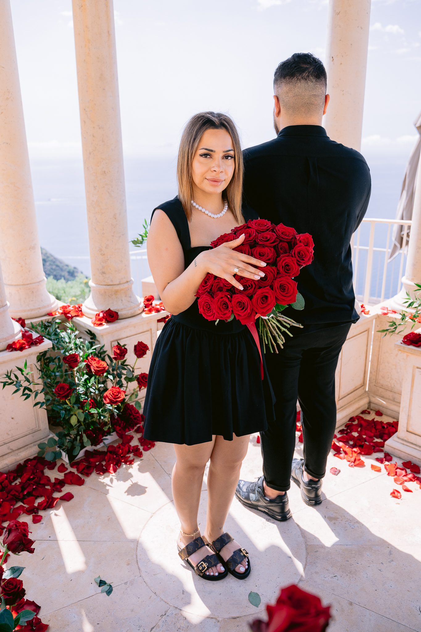 Wedding proposal at La Chèvre d'Or Dome with bouquet of red roses